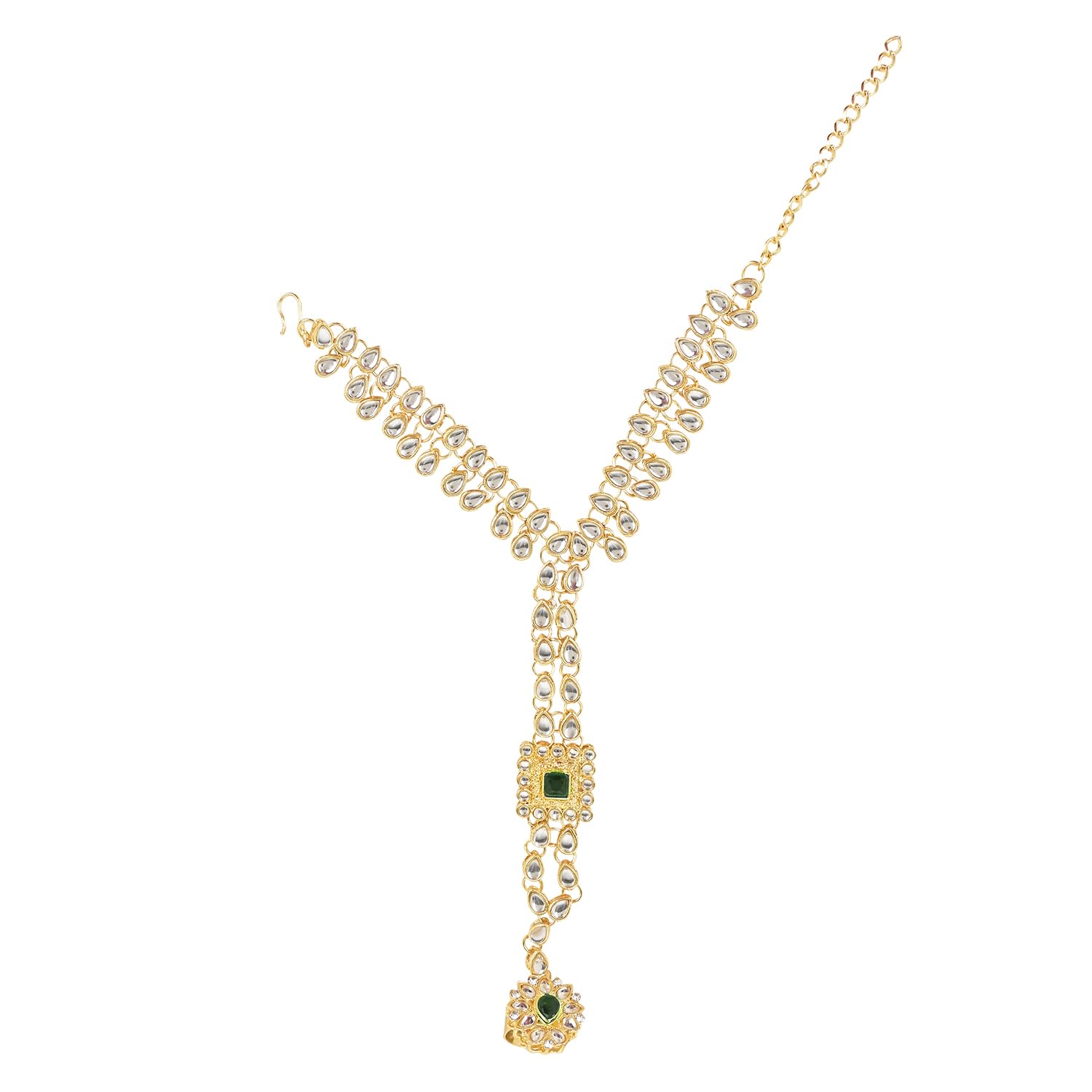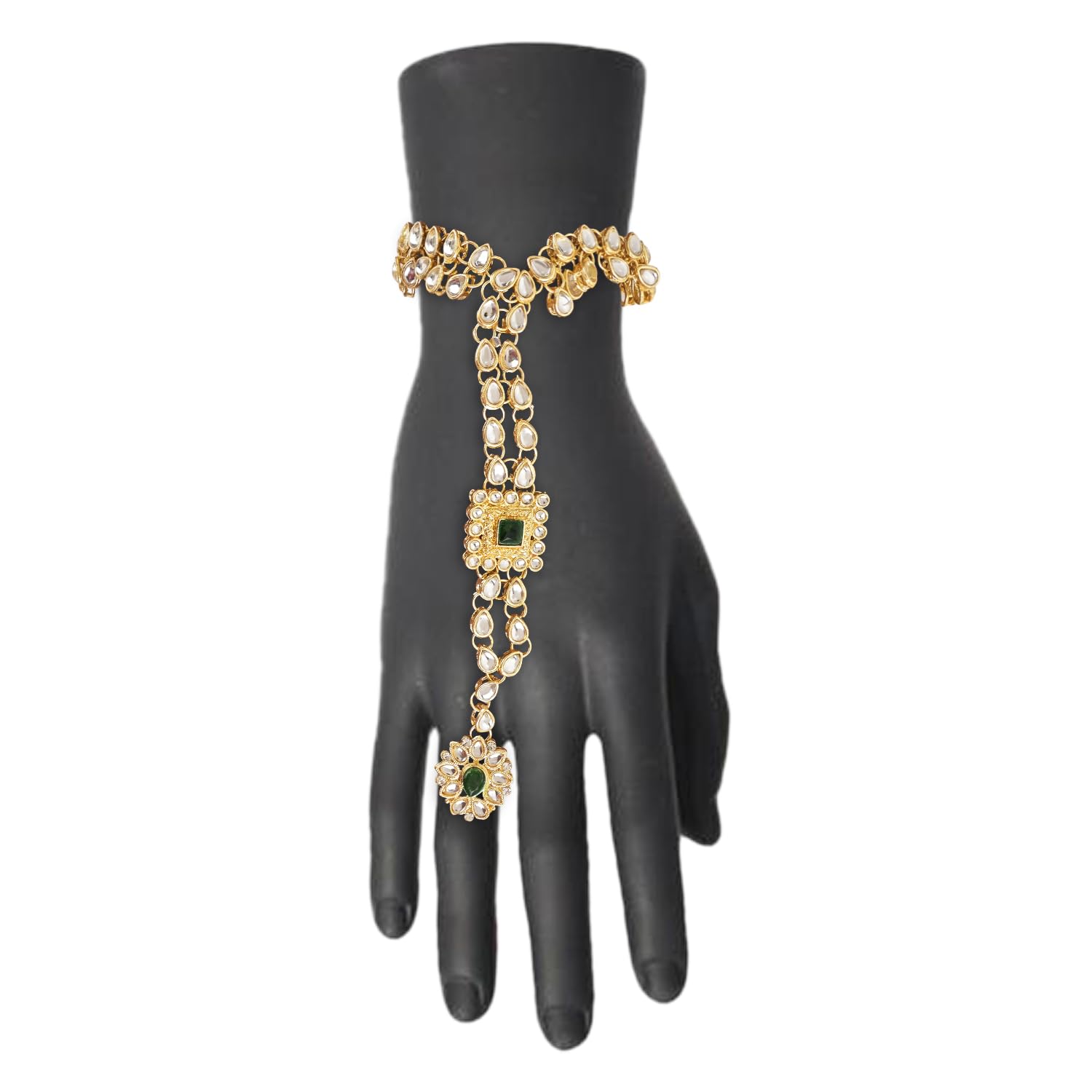 Add a touch of traditional elegance to your ensemble with the stunning I Jewels Traditional Gold Plated Embellish with Kundan & Pearl Adjustable Haath Phool/Panja Bracelet. This exquisite piece is designed for women and girls who appreciate the timeless beauty of Indian jewelry. Adorned with lustrous pearls this adjustable bracelet adds a touch of femininity and grace. The pearls are thoughtfully selected to complement the kundan stones creating a harmonious blend of textures and colors. The adjustable feature ensures a comfortable and secure fit for any wrist size making it suitable for women and girls of all ages. Whether worn as a standalone statement piece or paired with other traditional jewelry this haath phool/panja bracelet effortlessly enhances your overall look. It adds a regal touch to bridal attire enhances the elegance of festive ensembles or brings a touch of glamour to formal occasions.
