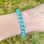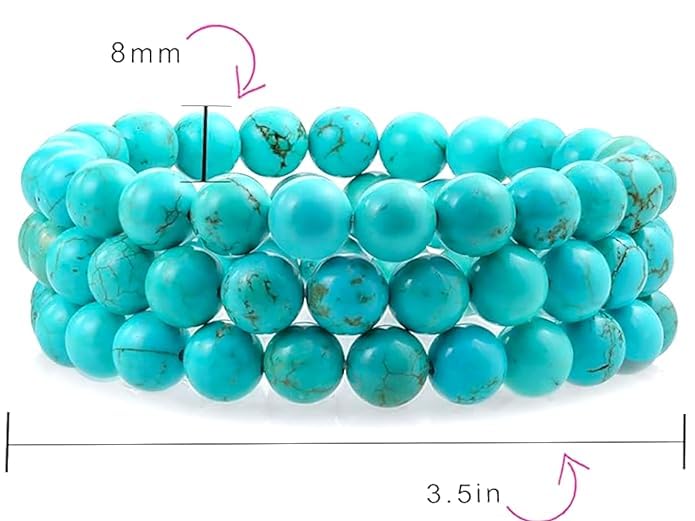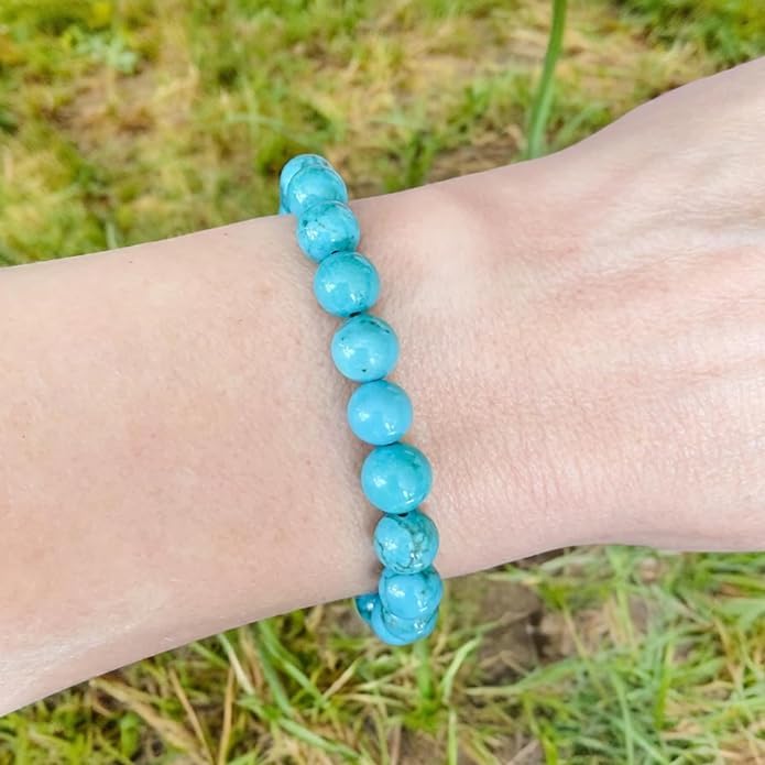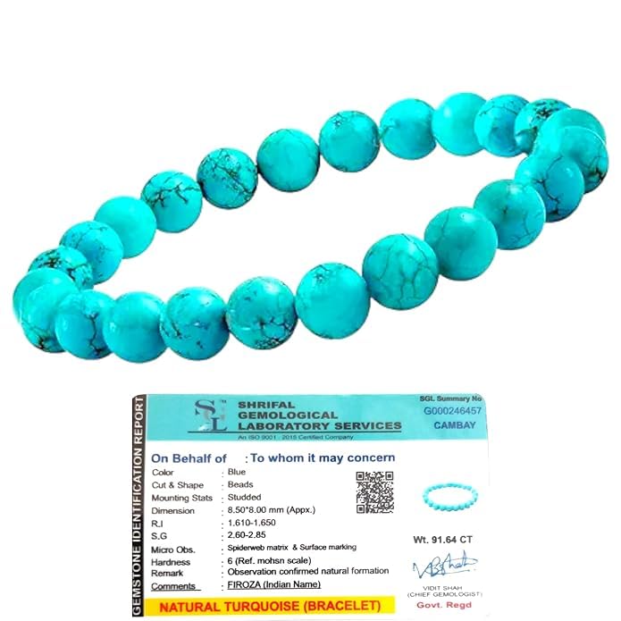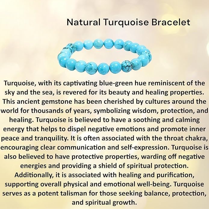 This AAA grade lab-certified Turquoise (Firoza) bracelet mesmerizes with its vivid sky-blue hues reminiscent of a clear summer day. Each meticulously crafted bead showcases the stone's natural variations and intricate matrix patterns radiating a sense of calm and protection while adding a pop of vibrant color to any outfit. Turquoise is believed to possess powerful protective energies that shield the wearer from negative influences and environmental pollutants. Its protective aura acts as a barrier against harm accidents and psychic attacks promoting a sense of safety and security. Turquoise is closely associated with the throat chakra facilitating clear communication and self-expression. It is also believed to enhance creativity intuition and problem-solving abilities making it a valuable ally for those seeking to express themselves authentically and creatively.