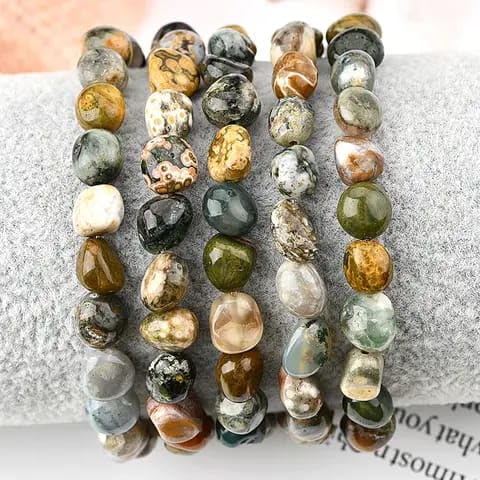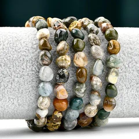 Natural Genuine Ocean Jasper Stone Healing Crystal Bracelet - Tumbled Nugget Beads Bring the serene beauty of the ocean to your wrist with our Natural Ocean Jasper Bracelet. This tumbled nugget bracelet is crafted from authentic ocean jasper stones each bead hand-selected for its unique patterns and hues. Known as a crystal of peace and stability ocean jasper is believed to foster a sense of calm and tranquility helping to ease stress and anxiety while promoting emotional balance.