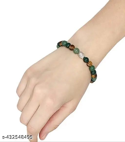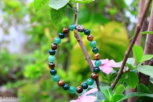 Unlock the power of prosperity and success with the Sukhad Prosperity and Success Crystal Gemstone Bracelet. This exquisite piece combines the energies of Green Aventurine Tiger Eye and Jade creating a harmonious blend that attracts abundance and good fortune. The Green Aventurine promotes emotional balance Tiger Eye cultivates self-confidence and willpower while Jade encourages wealth and harmony. Meticulously crafted for both men and women this bracelet serves as a stylish accessory and a powerful talisman. Adorn your wrist with this captivating gemstone bracelet and embrace the journey towards prosperity and success. Handcrafted with precision and care this bracelet is a true embodiment of timeless elegance and spiritual significance.