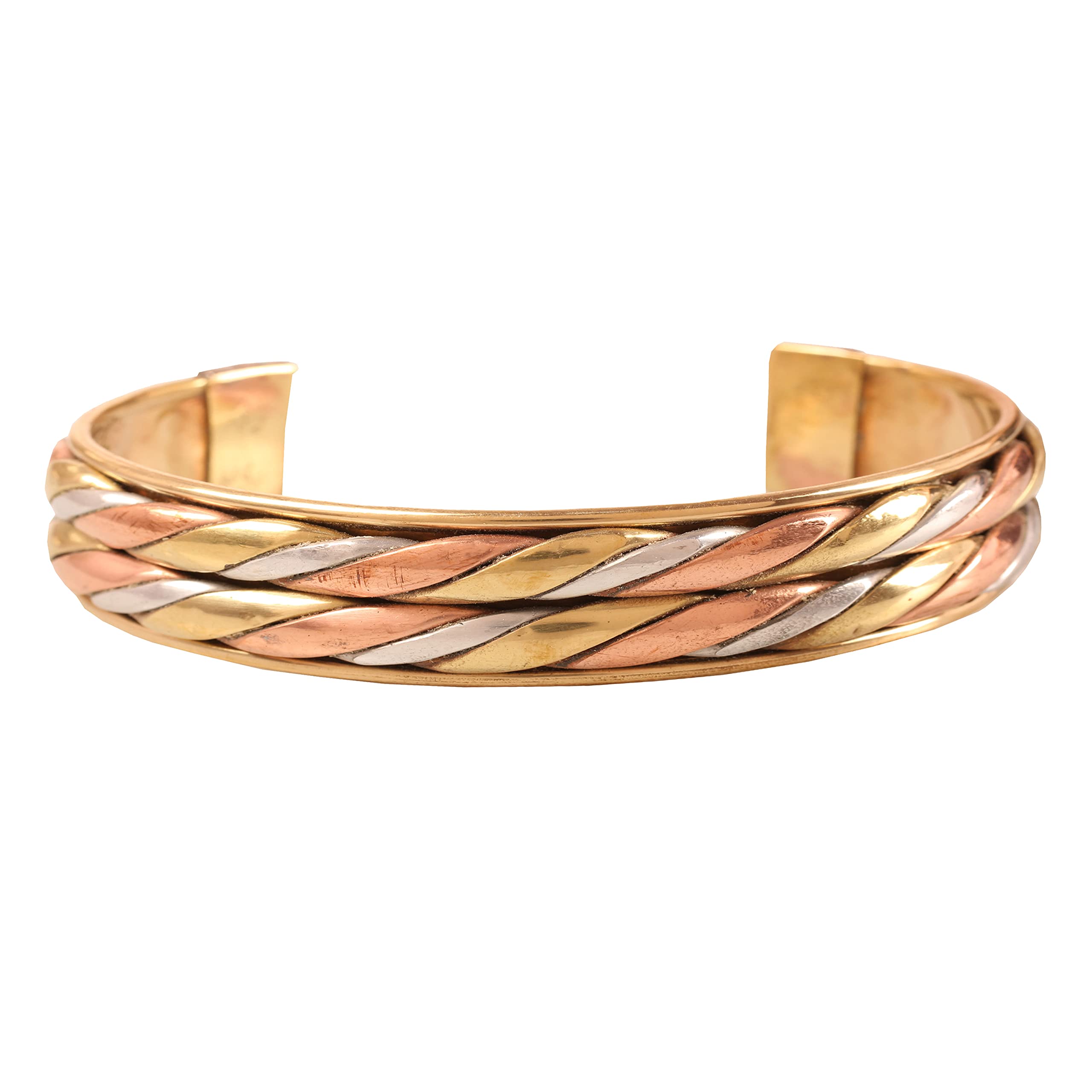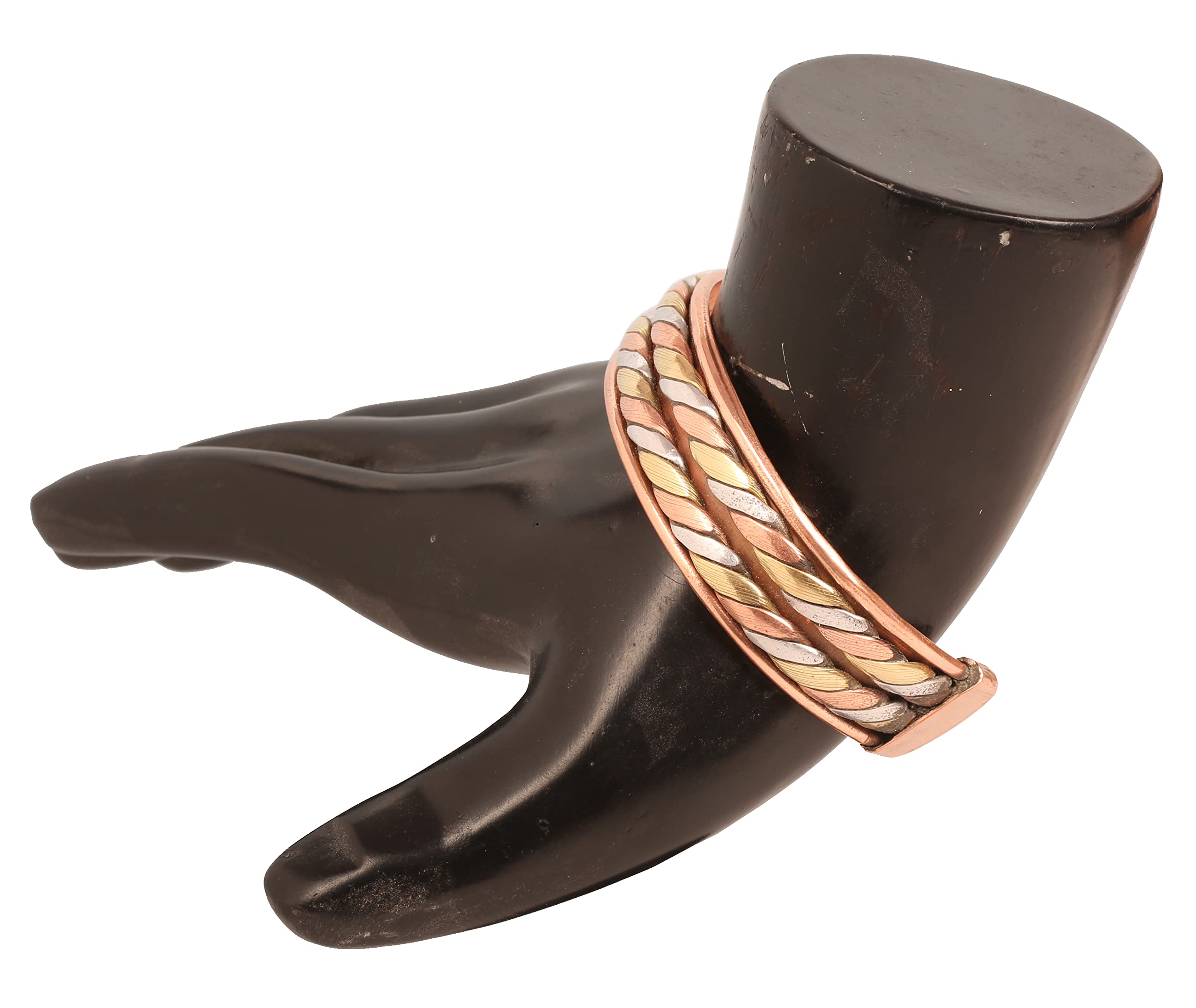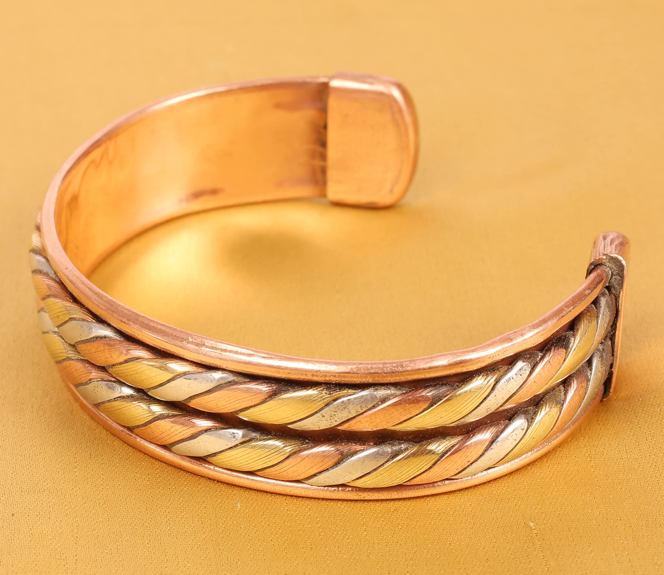 Touchstone Copper Hand Forged With Solid And High Gauge Tibetan Style Beautiful Doubly Braided Inspired Minimalistic Elegance Pure Copper Bracelet In Triple Tones.