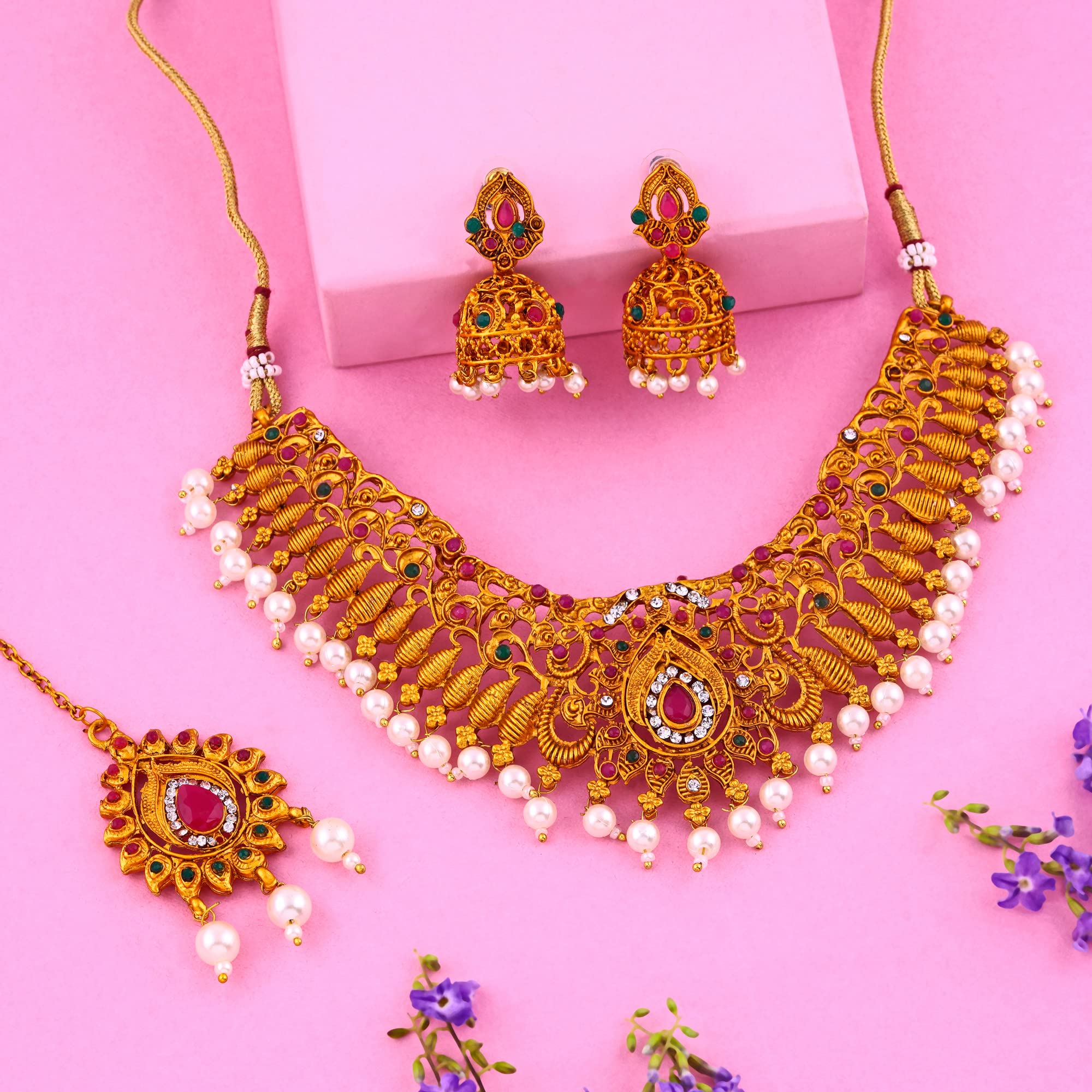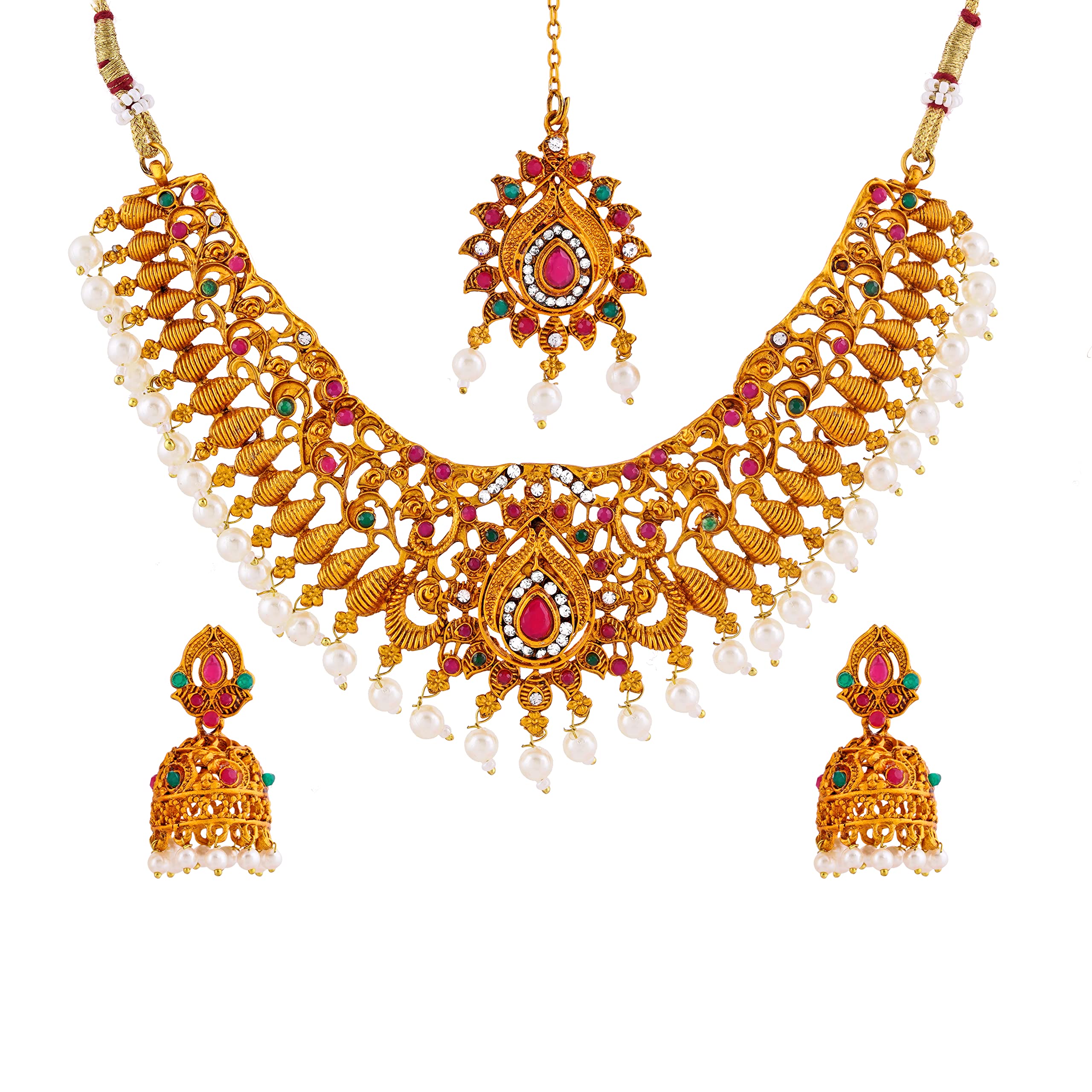 Gehena By Estele-Antique Plated Bridal Jewellery Short And Long Neckale Tikka With Earrings For Women One Size Metal No Gemstone
