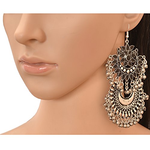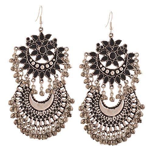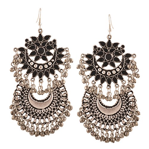 Stunning heavy look ethnic dangler Afghani hook chandbali earrings in silver tone.Floral design with blue enamel work gives a traditional touch to the earrings.Silver beads dangle to create a striking look.Perfect with ethnic & traditional wear. Can also be a perfect gifting option for friends and dear ones. Earrings Length=4.2 inch Earrings Width=1.8 inch.