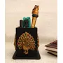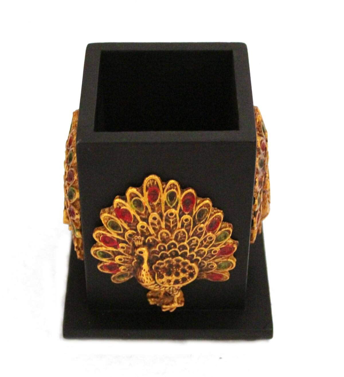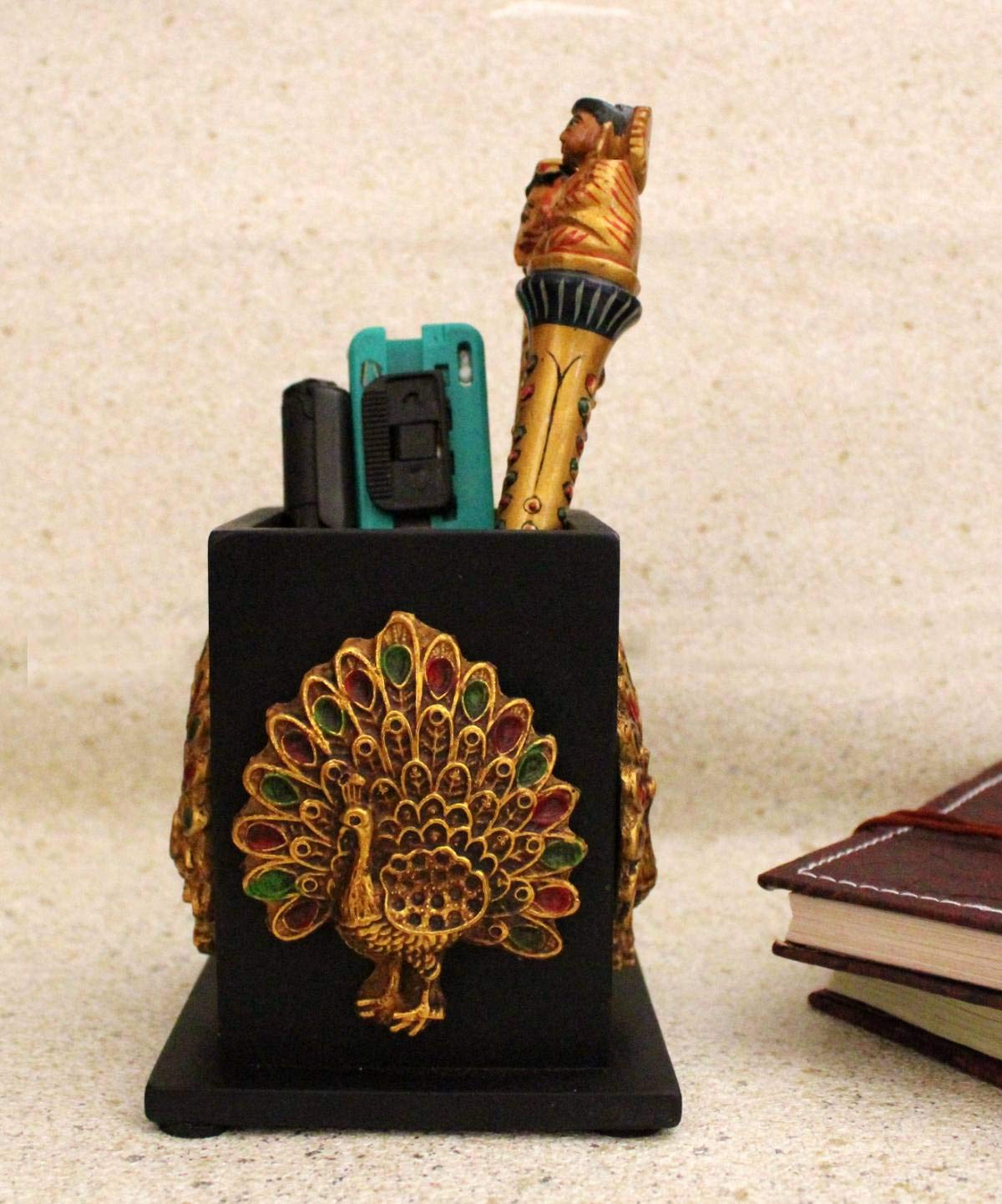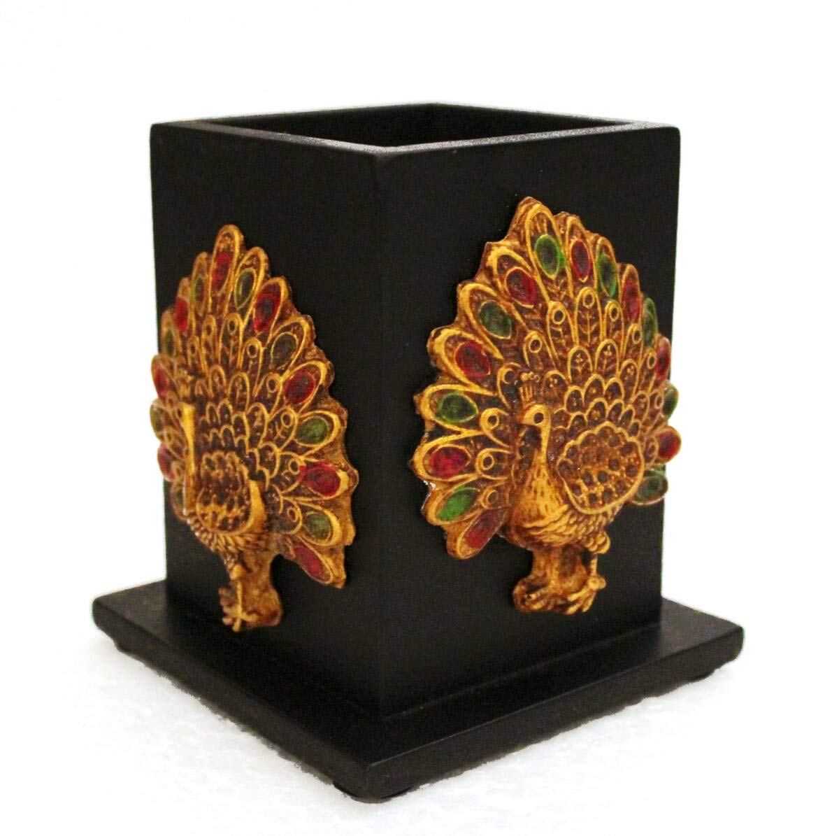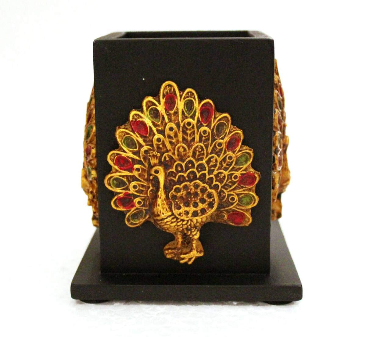 CHURU SANDALWOOD CARVED Resin Pen Pencil Holder with Peacock Figure Decorative Table Desk Organizer for Home Office (5 inches Black)