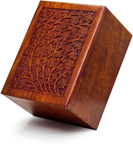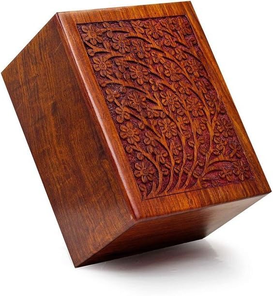 This Ornaments organizer storage box always use fully mature and seasoned wood so that our customers could enjoy the clarity of the completely developed fine grooves. About Design : We are a family of hundreds of craftsmen who keep on nurturing the wood with the best art until the day. We are the developers of various designs in wood box small wooden box industry. About Carving : The carving we have used on this gold jewellery organisers storage box is the best of ancient art. it is one of the traditional arts in wooden organizer for storage industry. About Polish and Other : We never uses the polish technique to hide the blemishes of this wooden storage box. Our polish on this wooden box for jewellery is to sharpen the natural grooves of wood. This wooden box for storage is to store expensive gold jewellery. Cloth inside the jewelry box to keep it scratch free. It can be used as wooden box for money gold necklace bangle box jewelry box vanity box living room decor bed room decor table decor.There is no better way to remember a loved one who has passed on than with a beautiful cremation urn for their ashes. Cremation Urns allow family members to keep their loved one near while protecting the earthly remains of the departed. These beautiful vessels are a wonderful alternative to a traditional casket that gets buried in the ground. Many individuals now prefer cremation because it is an environmentally and economically friendly option. Wooden Cremation Urns for Human Ashes Adult Infant Pets(Dogs Cats etc). Different sizes of URN are available. Opening System: Perfect Opening with Sliding Bottom secured with screw handmade wooden urn for human ashes adult is a beautiful border Inlay on the top and sides made by Indians Handicrafts skilled artisans is durable solid and affordable. Unique funeral Gift for the loss of your beloved one. The wood is seasoned to perfection so that the product lasts forever. This is easily adaptable to any room in your home.