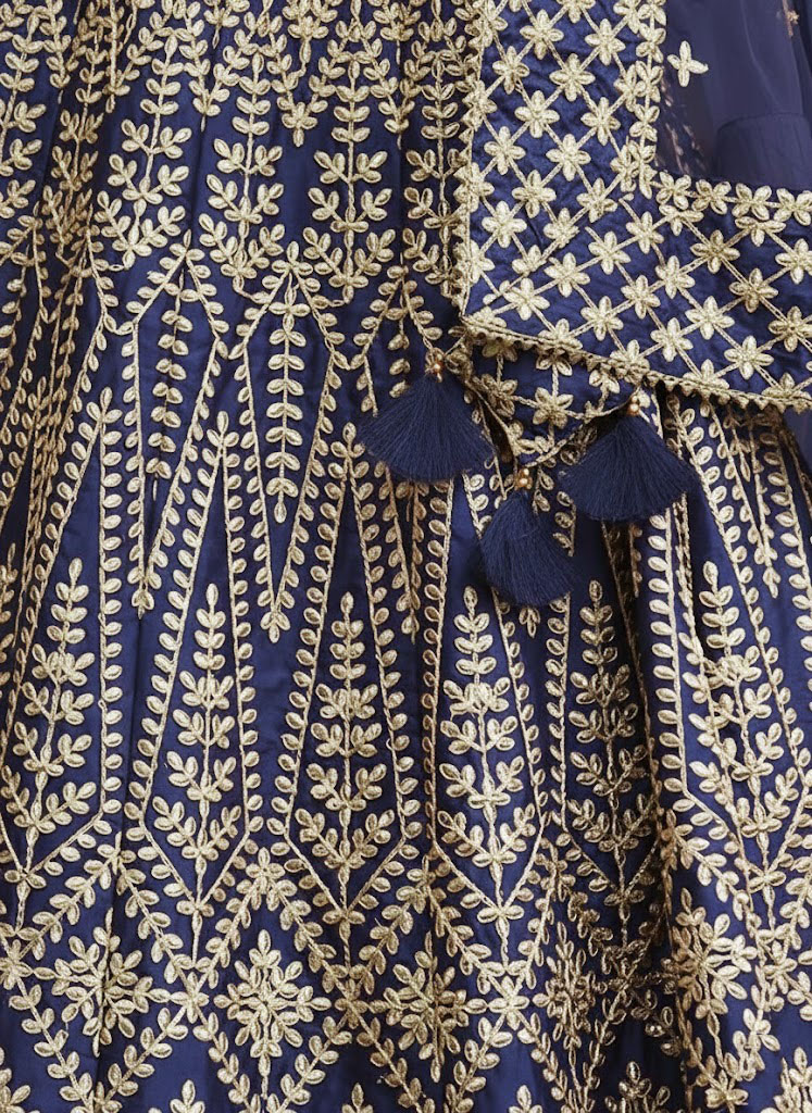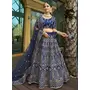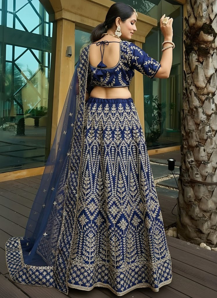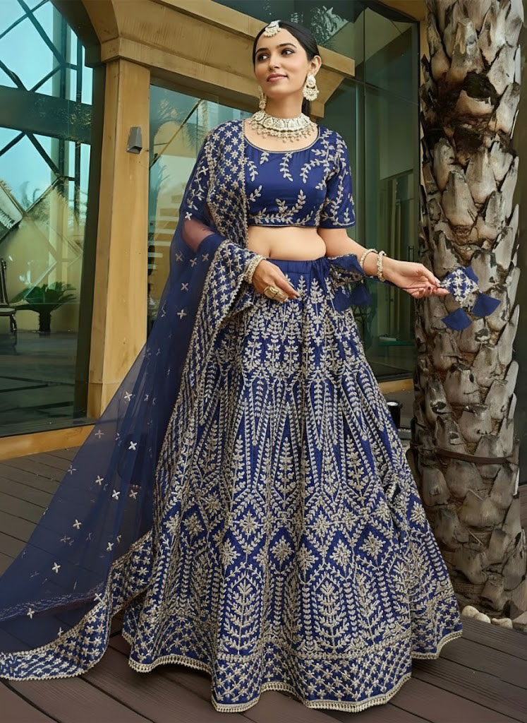 Blue Embroidered Malai Satin Silk Lehenga Set
