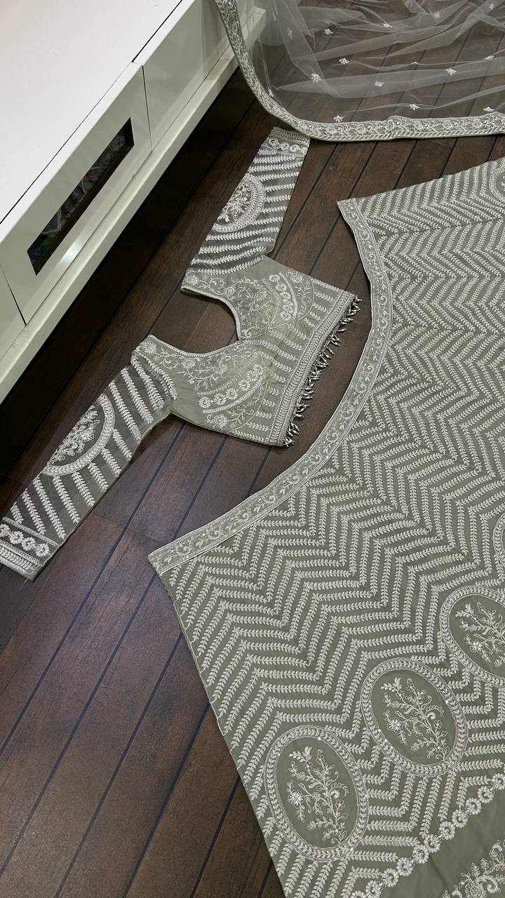 Fabric :Georget lehnga with heavy sequence, dori zari work, Flair 3 meter, Can can attach, Georget blouse net sleeves with heavy sequence, dori zari work all over front back ( Unstich ), tassels border given, Net Duppata with heavy sequnece, dori zari work tassels border attach.