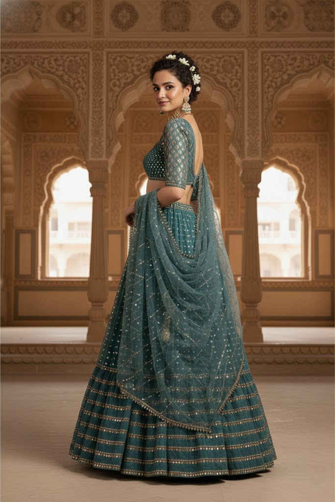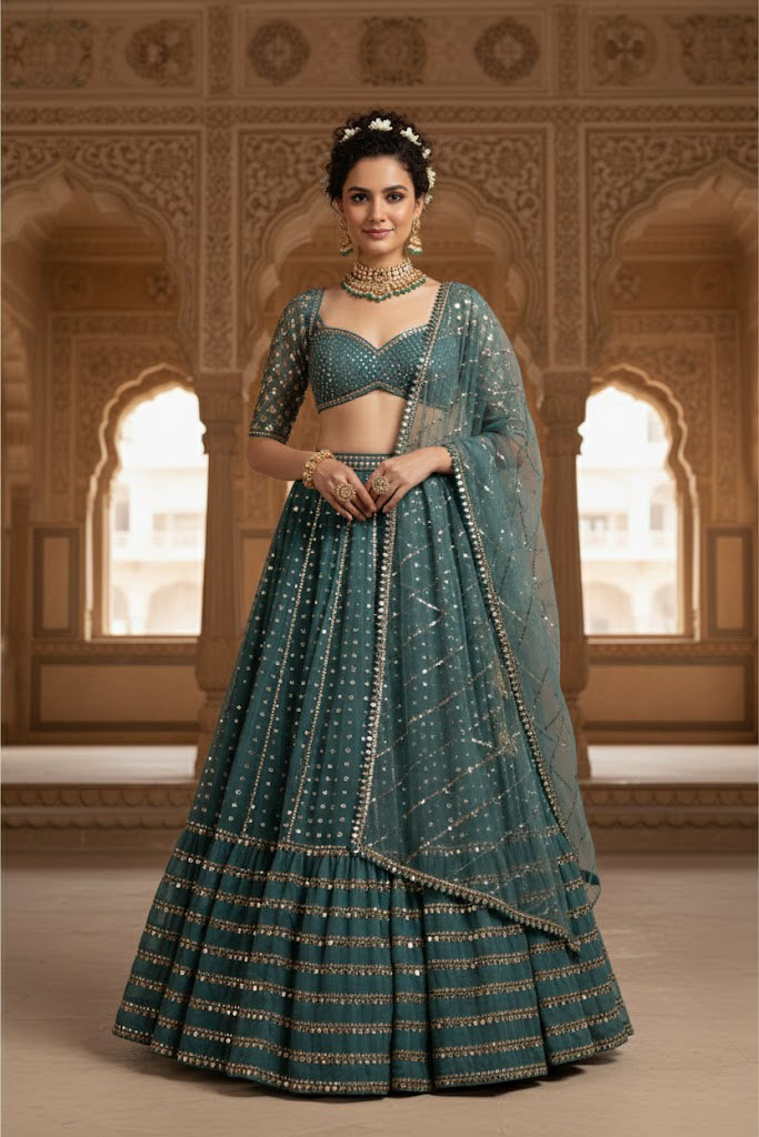 LEHNGA(BOTTOM): -FABRIC: - FAUX GEORGETTEINNER: - MICRO FABRICWORK: - 3MM, 5MM AND 9MM SEQUINS WITH ZARI EMBROIDERY WORKSTITCH: - SEMI STITCHED WITH CANCAN AND CANVASSIZE: - 42 HEIGHT AND 42 WAIST FLAIR: - 4 METERCHOLI(TOP): -FABRIC: - FAUX GEORGETTESIZE: - 0.70 METER CHOLI ALLOVER EMBOIDERED FABRIC 0.40 METER SLEEVES ALLOVER EMBROIDERED FABRICWORK: - 5MM SEQUINS EMBROIDERY WORK IN BLOUSE, 3MM, 5MM AND 9MM SEQUINS EMBROIDERY WORK IN SLEEVES STITCH: - UNSTITCHED FABRICDUPATTA: -FABRIC: - NETWORK: - 5MM, 9MM SEQUENCE AND JARI EMBROIDERY WORK SIZE: - 2.25 METER DUPATTASTITCH: - FULL STITCHADDITIONALWASH CARE: - DRY CLEAN ONLYCOLOR: - PRODUCT COLOR MAY SLIGHTLY VARY DUE TO PHOTOGRAPHIC LIGHTNING SOURCES OR YOUR DEVICE DISPLAY SETTINGSTHESE ARE MADE TO ORDER DESIGNER STYLES, HENCE EXPECT A SLIGHT VARIATION FROM THE IMAGE DISPLAYEDIN THE BOX 1 LEHENGA 1 DUPATTA 0.70 METER BLOUSE FABRIC 0.40 METER SLEEVES FABRIC (1 SET OF HAND MADE TASSELS)ALTERNATIVEHANDMADE TASSELS MAY DIFFER FROM THE PHOTOS AND VIDEOS. TASSELS WILL BE AVAILABLE AS LONG AS THE CURRENT STOCK LASTS. ALTERNATIVELY, NEW STOCK MAY TAKE SOME TIME TO ARRIVE. WE ARE NOT STRICTLY BOUND TO PROVIDE TASSELS.
