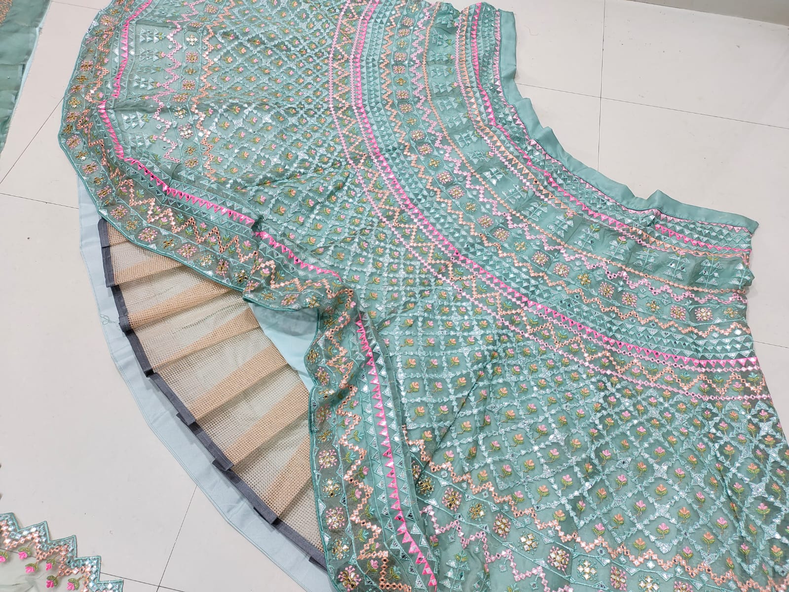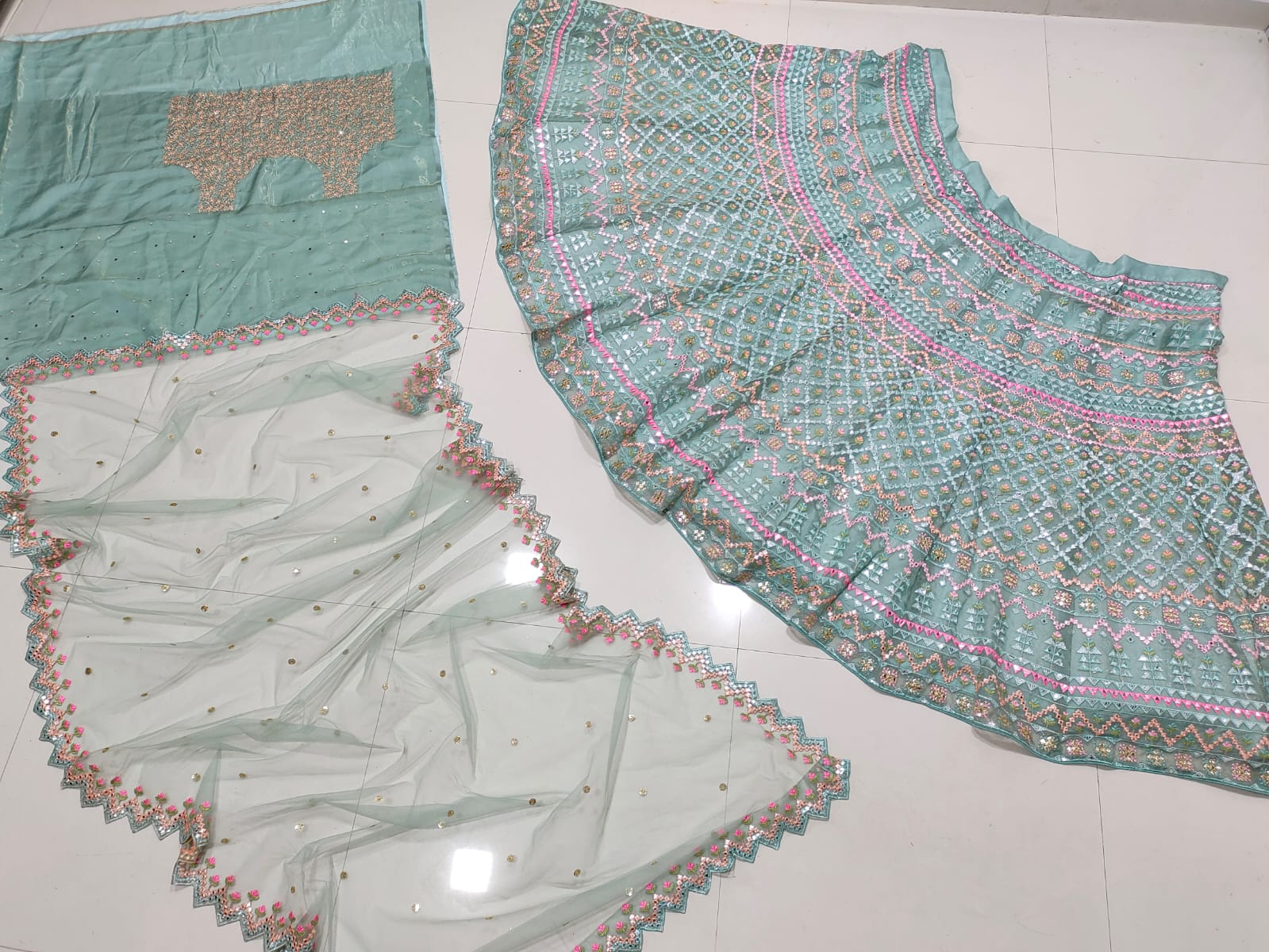 LEHNGA(BOTTOM)FABRIC:- GOLDY FABRIC(2 TONE COTTON ORGANZA SILK)INNER:- MICRO FABRICSTITCH:- SEMI STITCHED WITH CANVAS AND CANCANSIZE:- 42HEIGHT AND 42WAISTWORK:- MULTY COLOR THREAD, JARI AND PAPER MIRROR EMBROIDERY WORKFLAIR:- 3.50 TO 3.60 METER FLAIRCOLOR:- SEAGREENCHOLI(TOP):-FABRIC:- GOLDY FABRIC(2 TONE COTTON ORGANZA SILK)SIZE:- 2 METERWORK:- THREAD, 3MM AND CODDING DORI SEQUENCE EMBROIDERY WORK STITCH:- UN STITCHED FABRICCOLOR:- SEAGREENDUPATTA:-FABRIC:- NYLON NETWORK:- THREAD, JARI AND PAPER MIRROR EMBROIDERY WORKSIZE:- 2.25 METER DUPATTASTITCH:- FULL STITCHEDCOLOR:- SEAGREENADDITIONALWASH CARE: - DRY CLEAN ONLYCOLOR: - PRODUCT COLOR MAY SLIGHTLY VARY DUE TO PHOTOGRAPHIC LIGHTNING SOURCES OR YOUR DEVICE DISPLAY SETTINGSTHESE ARE MADE TO ORDER DESIGNER STYLES, HENCE EXPECT A SLIGHT VARIATION FROM THE IMAGE DISPLAYEDIN THE BOX 1 PIECE LEHENGA 1 PIECE DUPATTA 1 PIECE BLOUSE FABRIC.