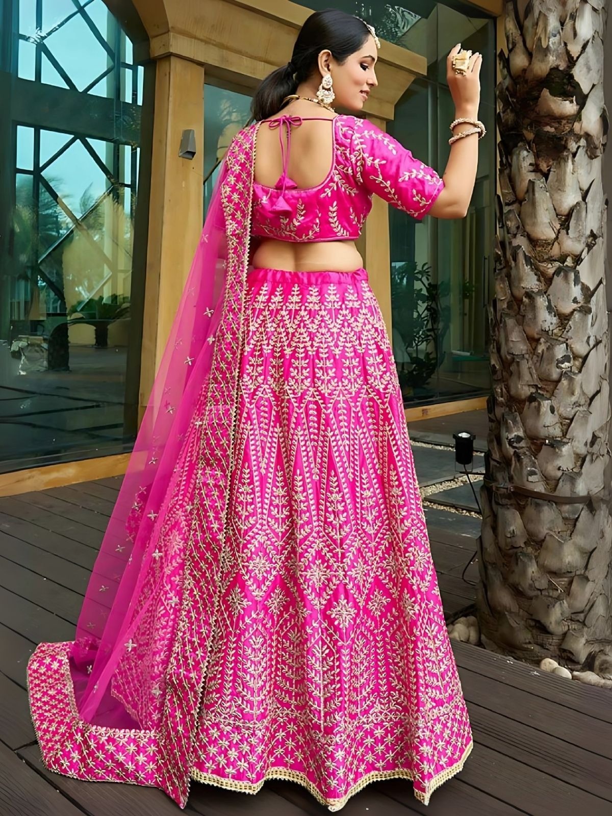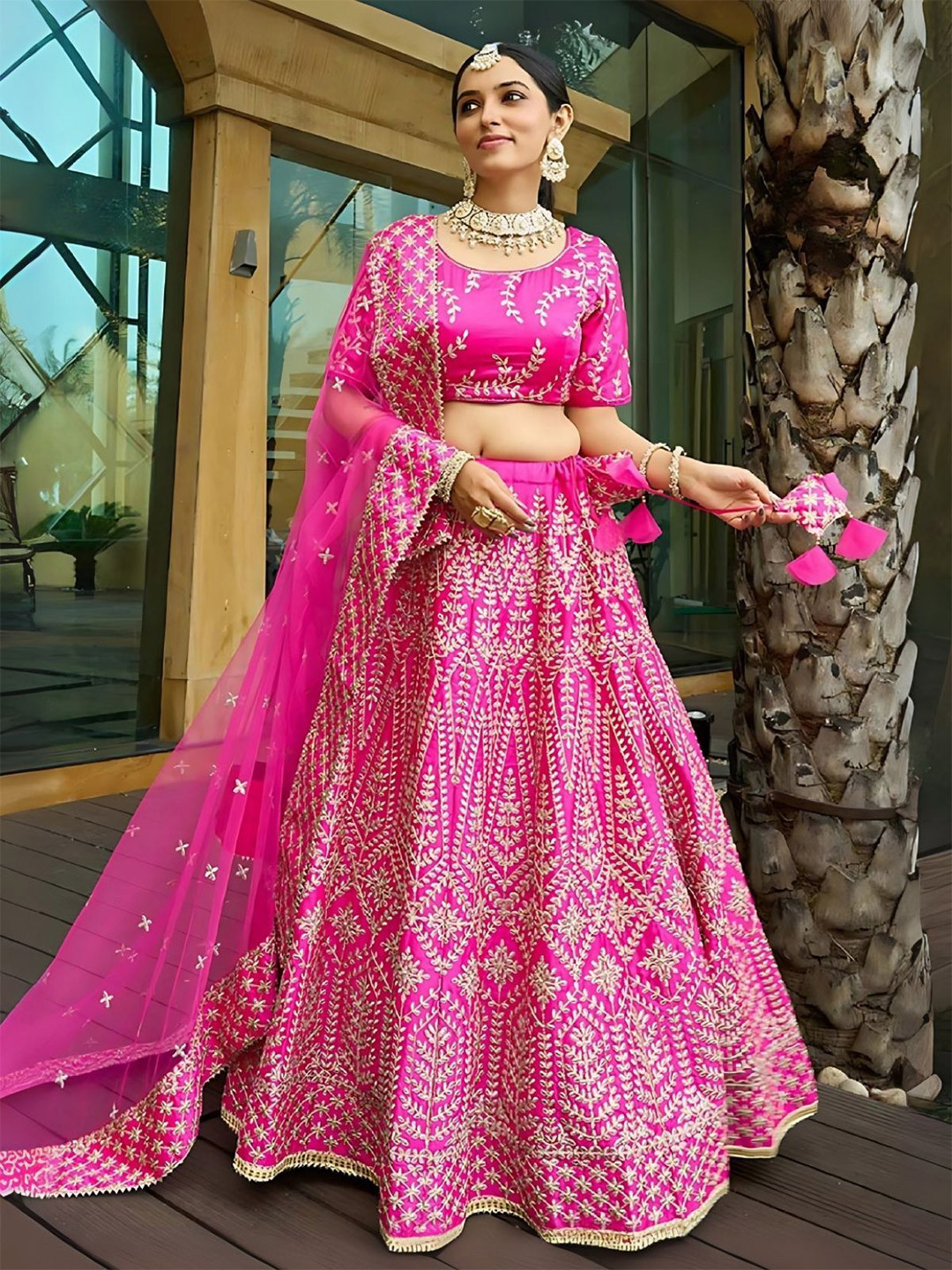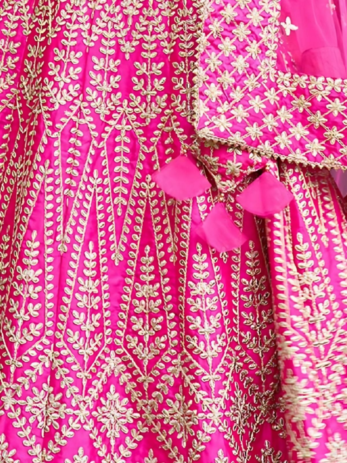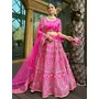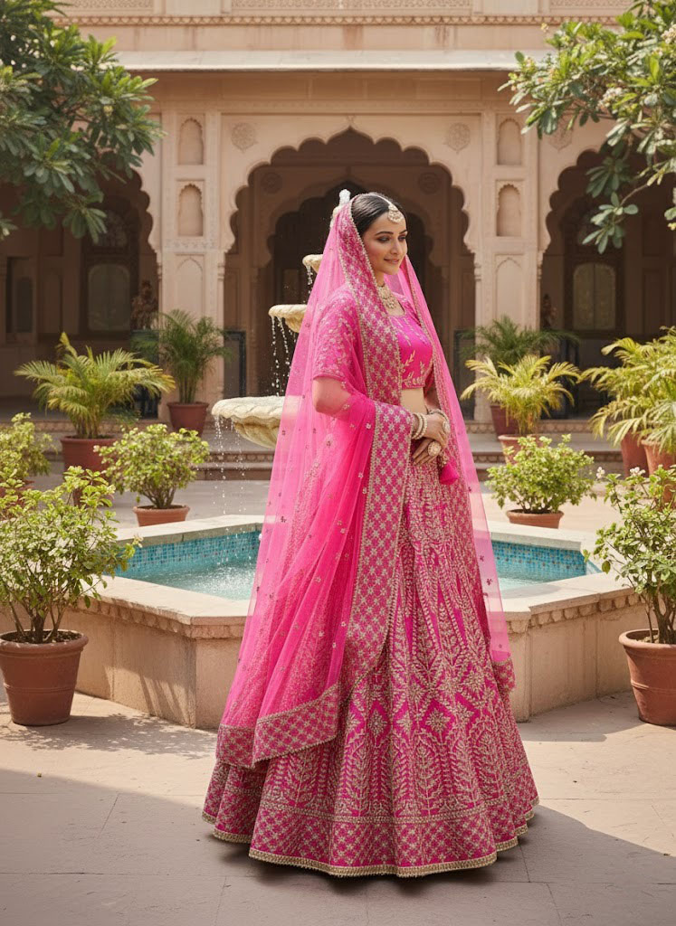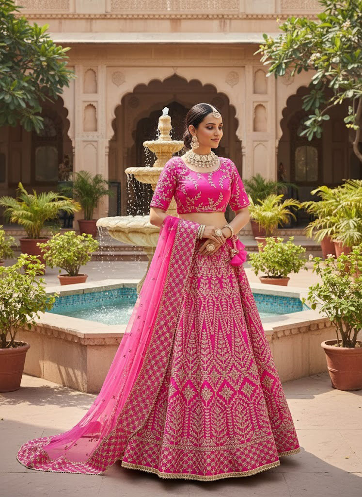 Rani-pink chapat zari and dori embroidered malai satin silk indian wedding lehenga dress