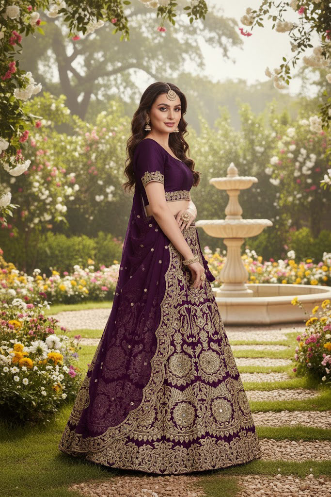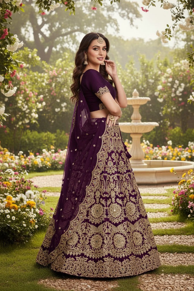 Wine sequins embroidered semi velvet lehenga choli for wedding