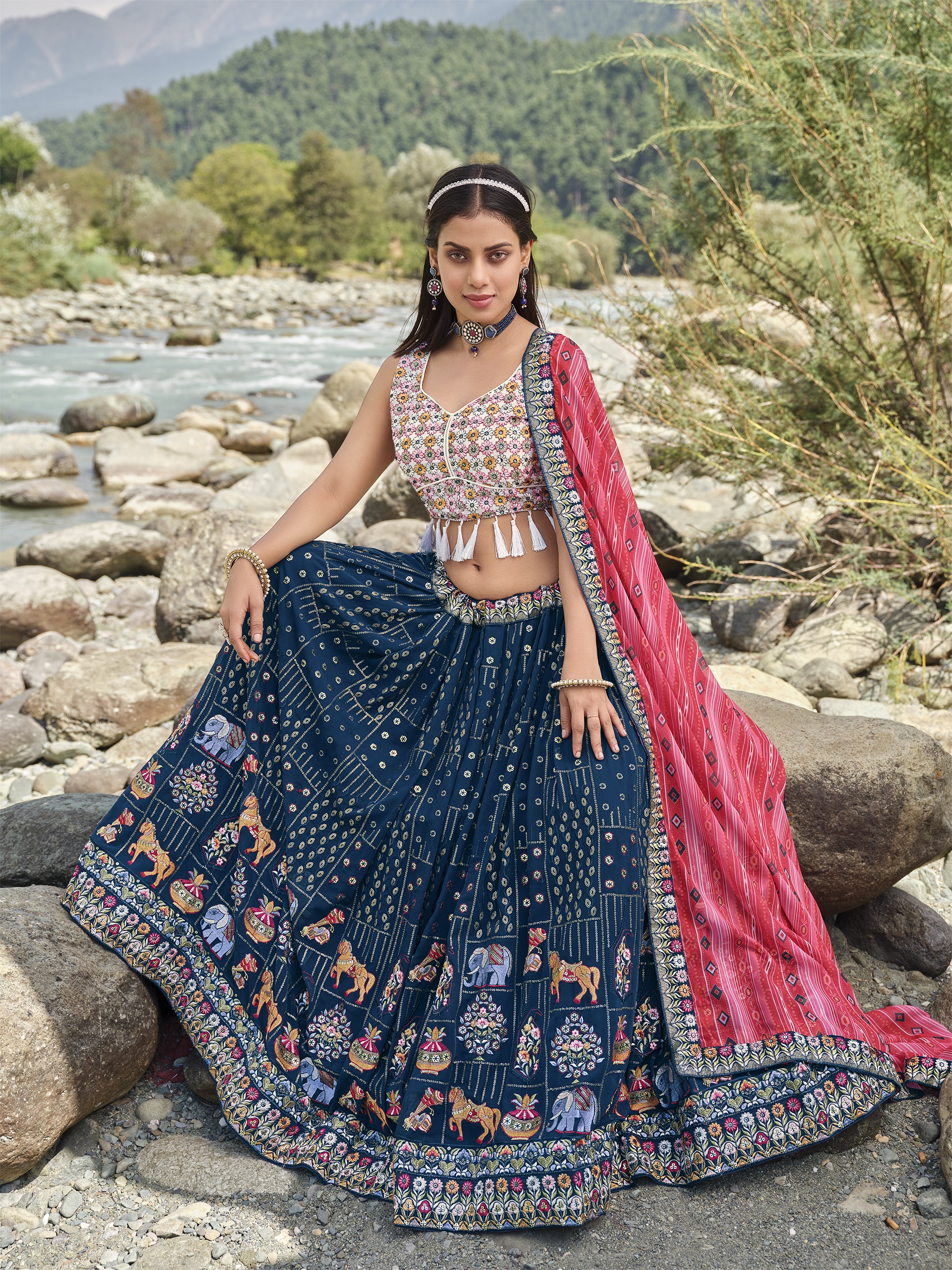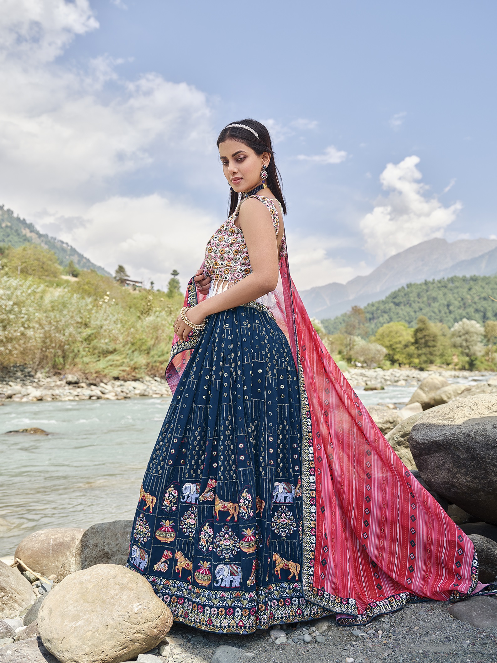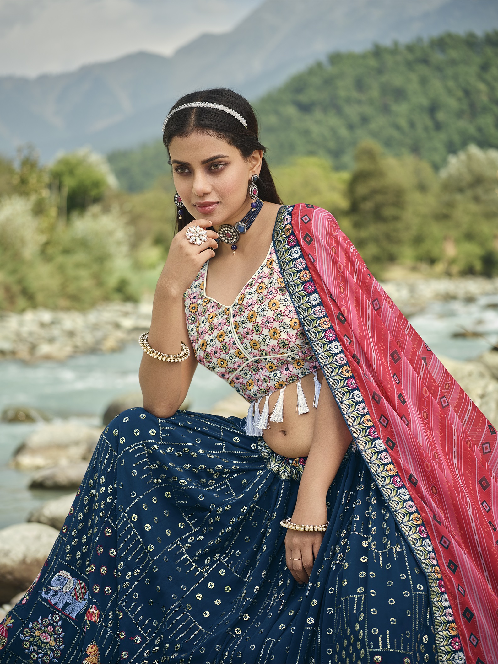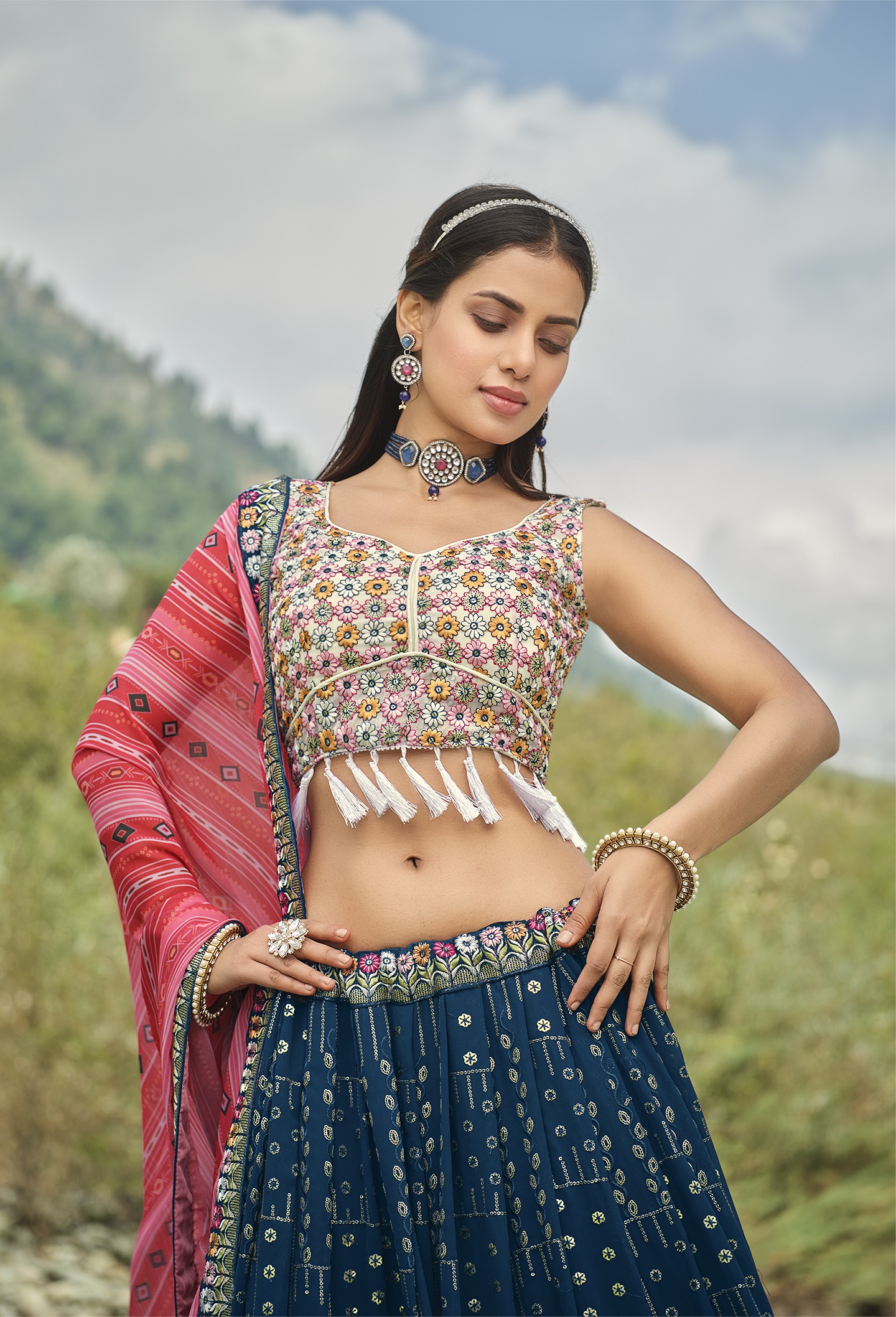 Womens Blue Faux Georgette Thread Embroidery Lehenga Set