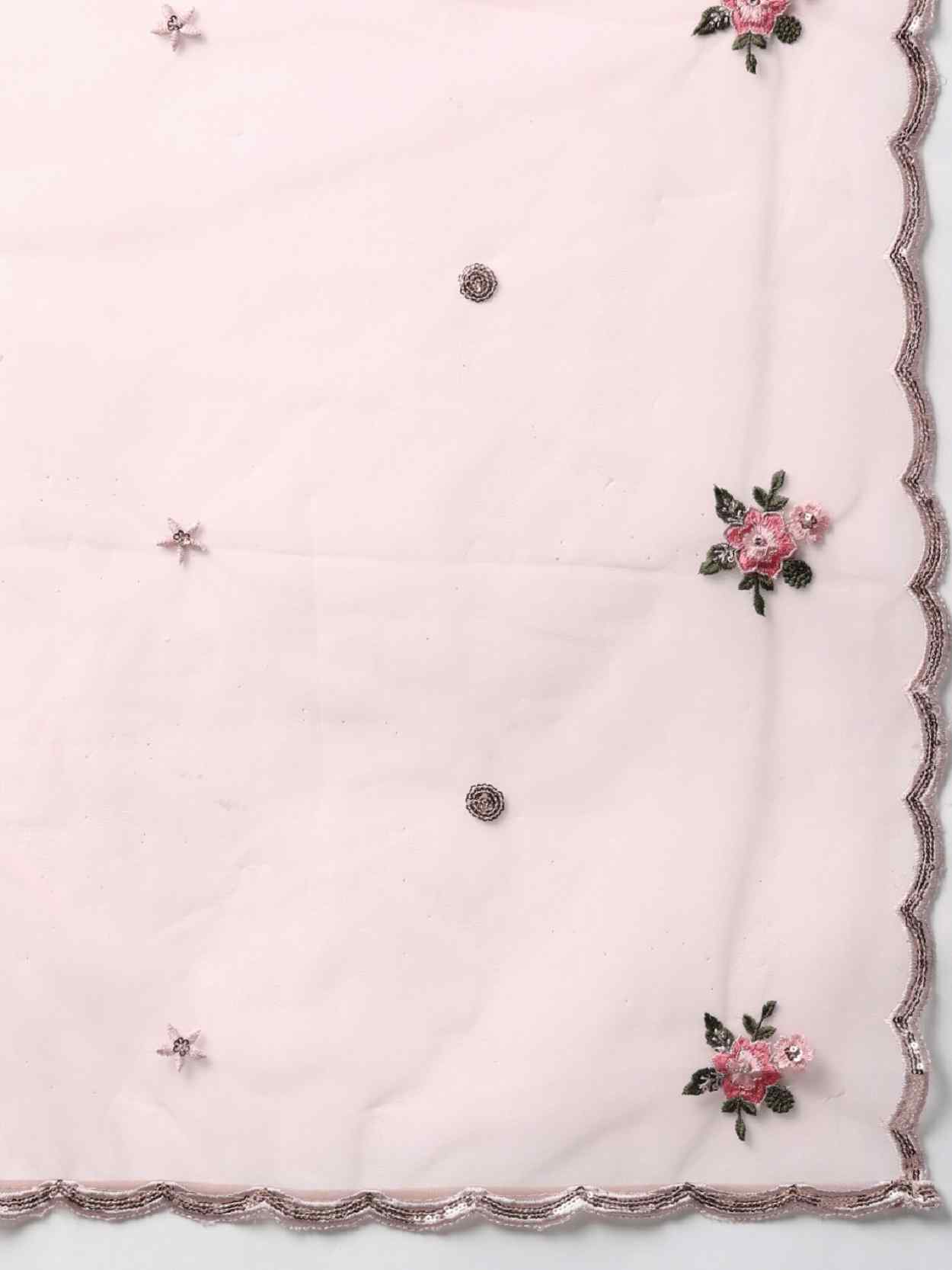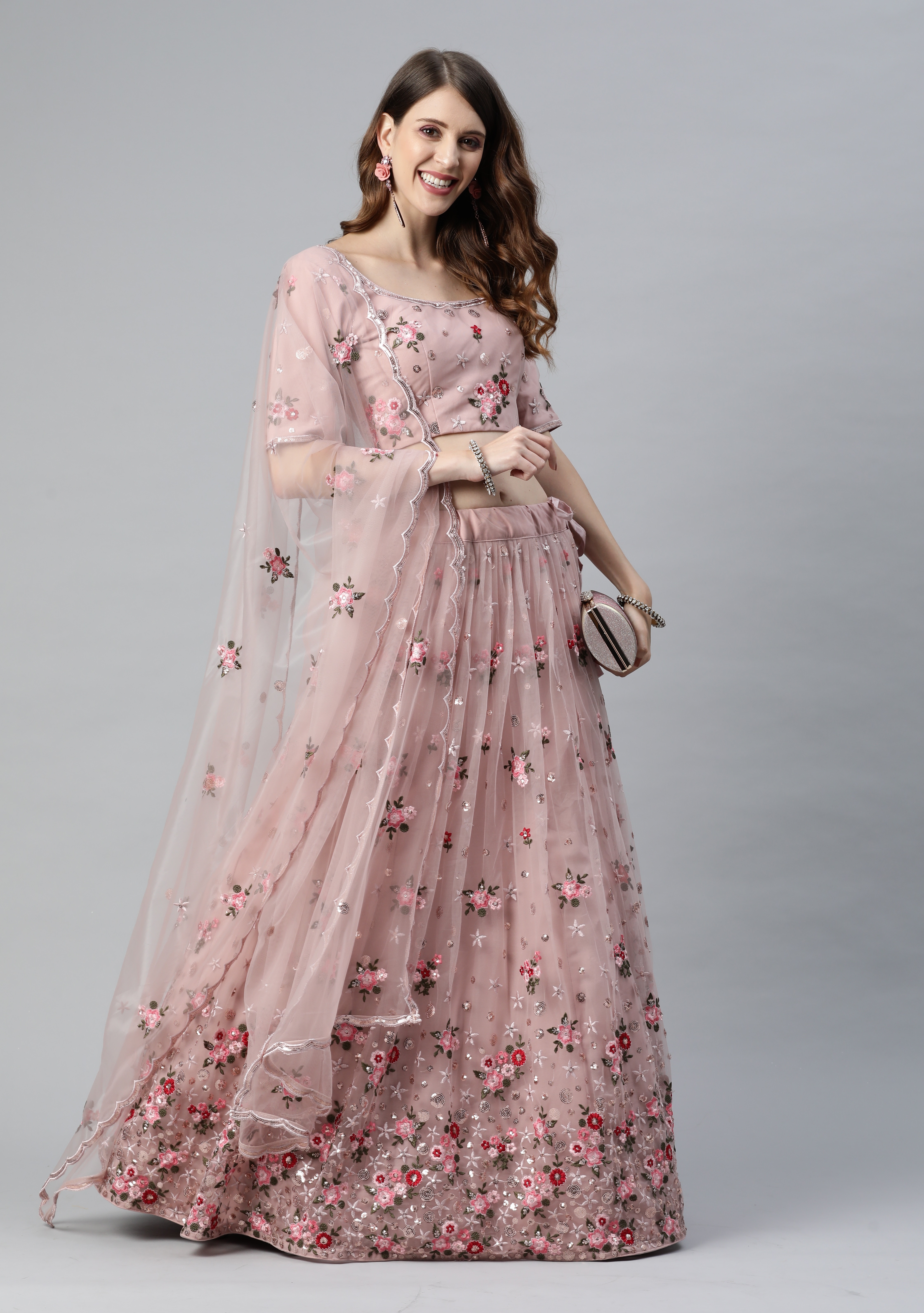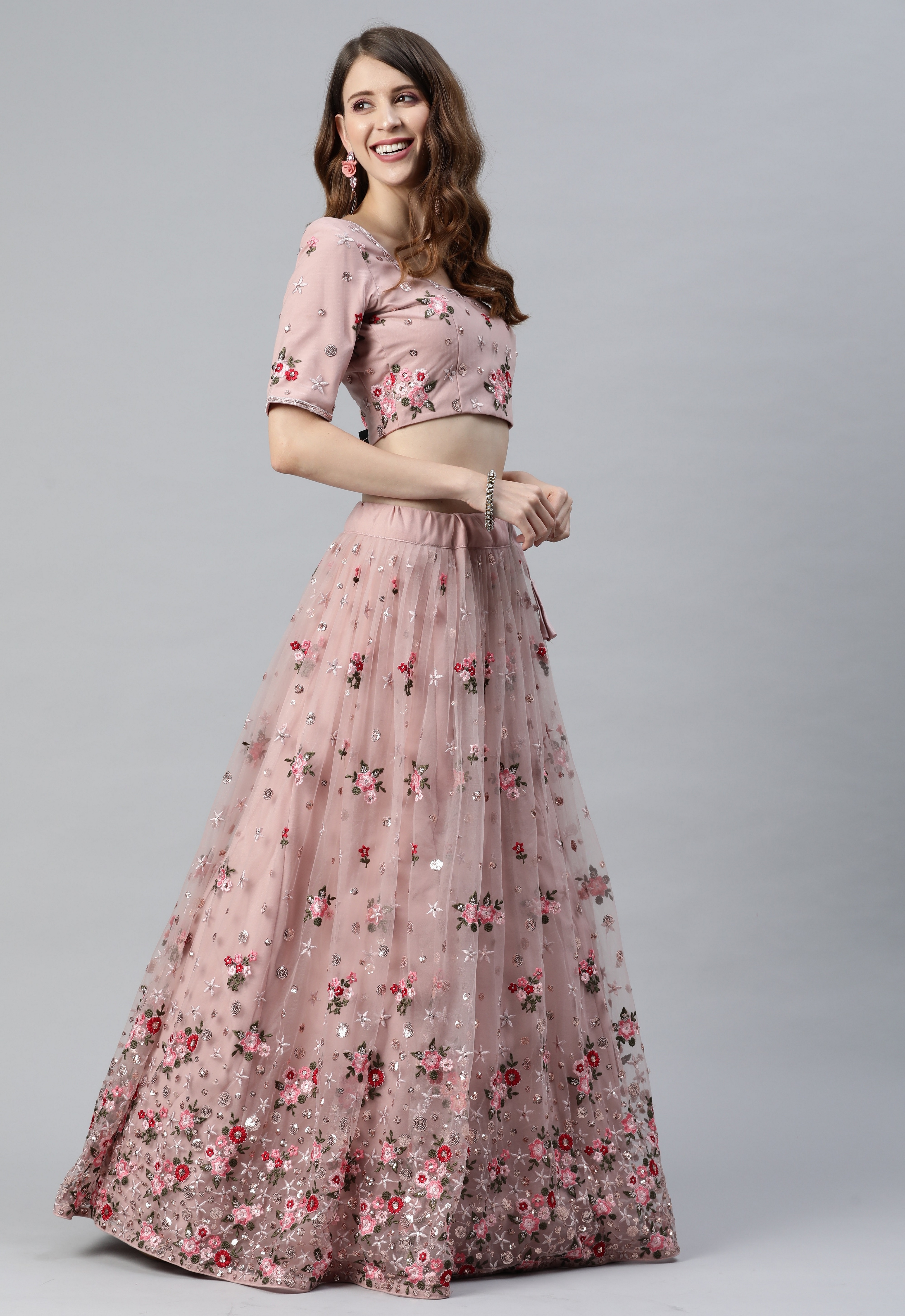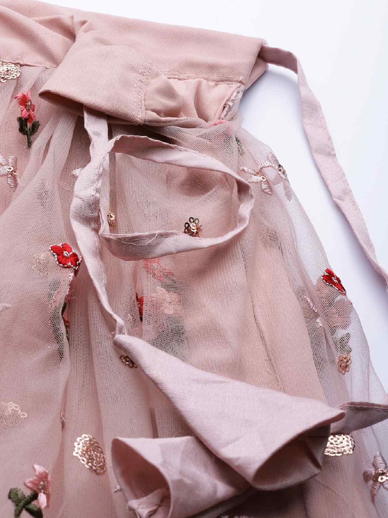 Elevate your ethnic look with this dusty pink net lehenga featuring thread embroidery work. Designed for festive occasions and celebrations, it offers a graceful flow and timeless appeal.Crafted from lightweight net fabric with a semi-stitched finish, this lehenga ensures comfort and easy customization. Dry clean recommended.