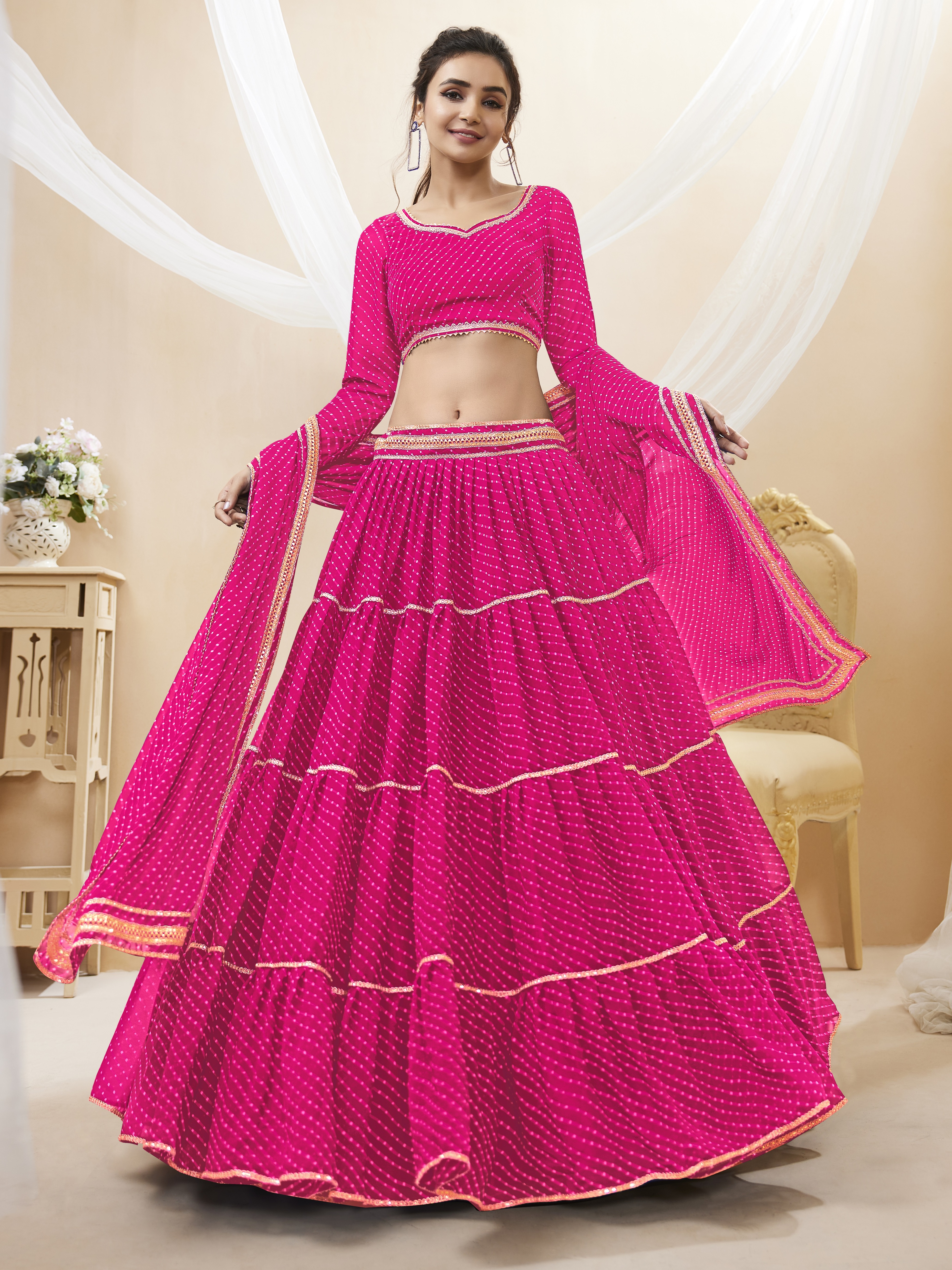Elevate your ethnic look with this pink georgette lehenga featuring lehariya work. Designed for festive occasions and celebrations, it offers a graceful flow and timeless appeal.Crafted from lightweight georgette fabric with a semi-stitched finish, this lehenga ensures comfort and easy customization. Dry clean recommended.
