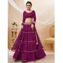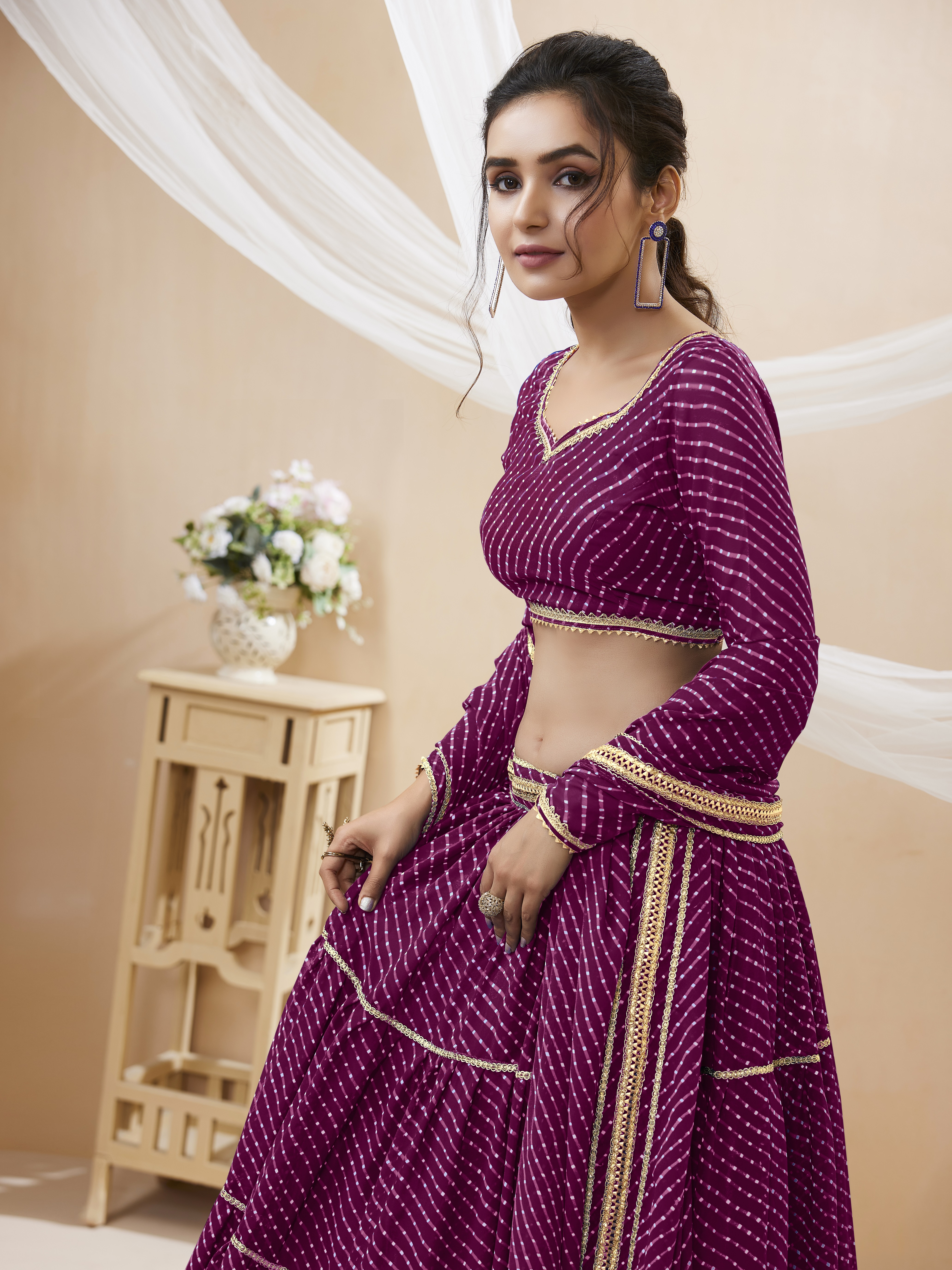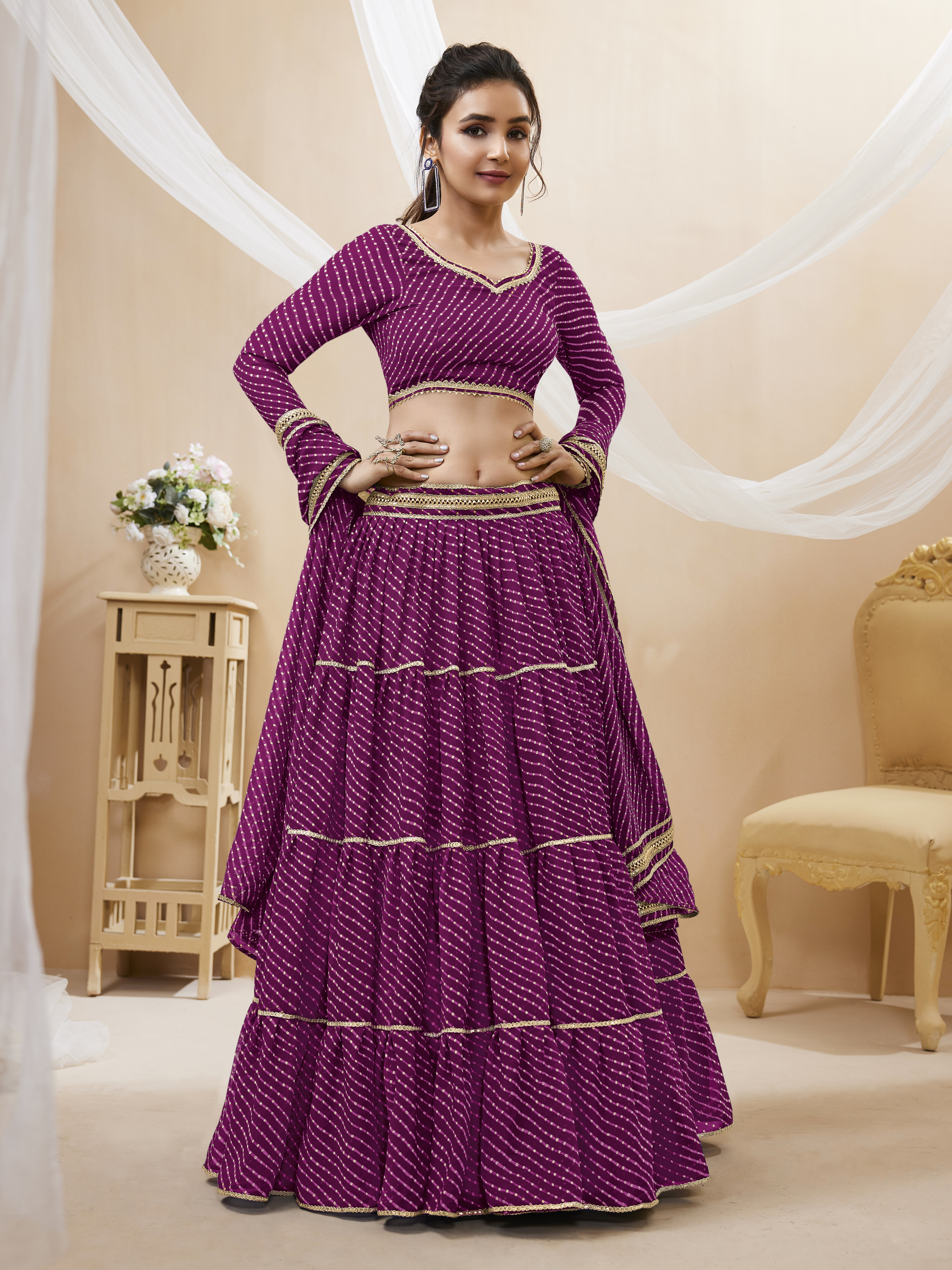 Elevate your ethnic look with this purple georgette lehenga featuring lehariya work. Designed for festive occasions and celebrations, it offers a graceful flow and timeless appeal.Crafted from lightweight georgette fabric with a semi-stitched finish, this lehenga ensures comfort and easy customization. Dry clean recommended.