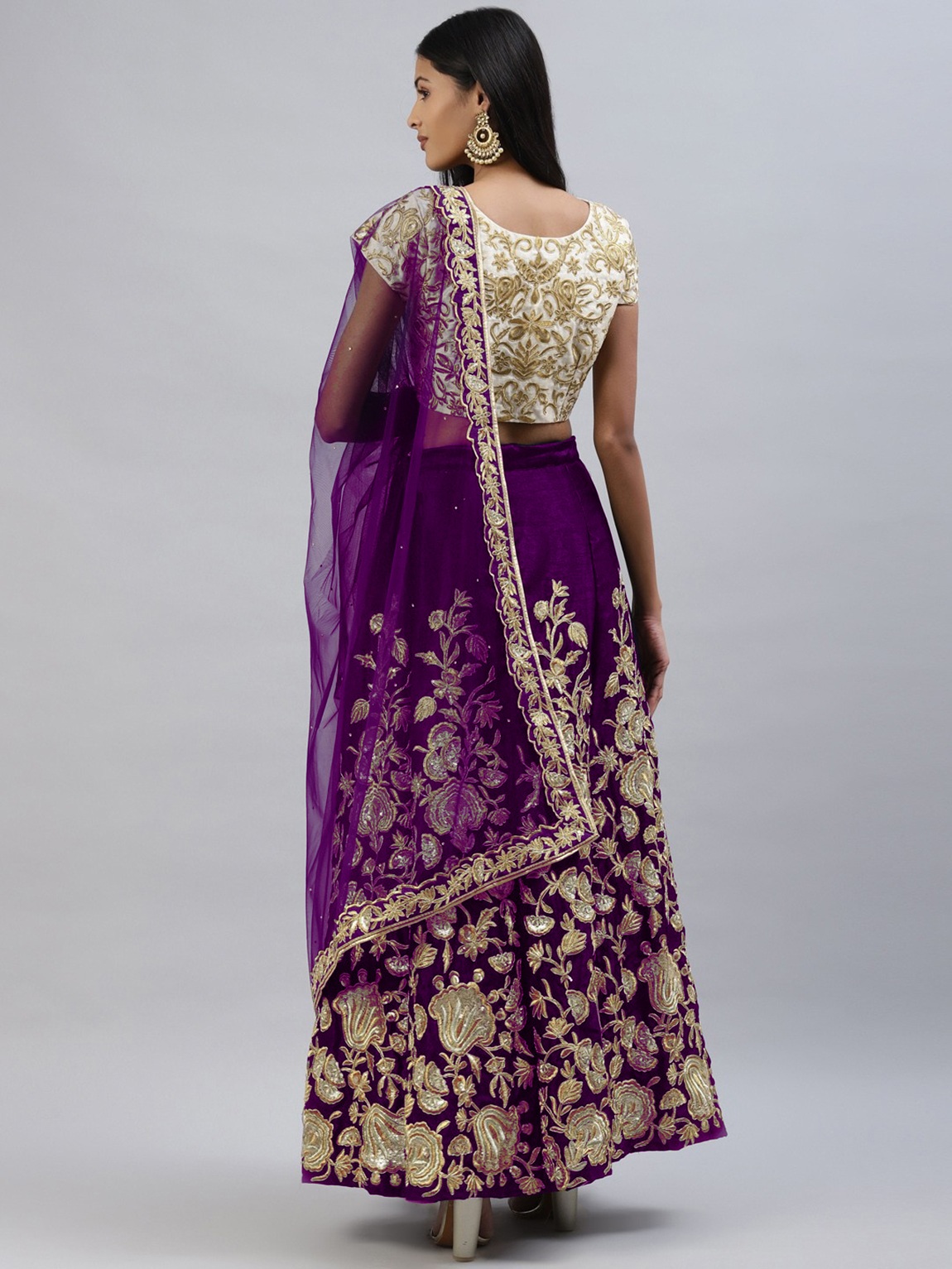 Elevate your ethnic look with this purple velvet lehenga featuring embroidered work. Designed for festive occasions and celebrations, it offers a graceful flow and timeless appeal.Crafted from lightweight velvet fabric with a semi-stitched finish, this lehenga ensures comfort and easy customization. Dry clean recommended.