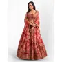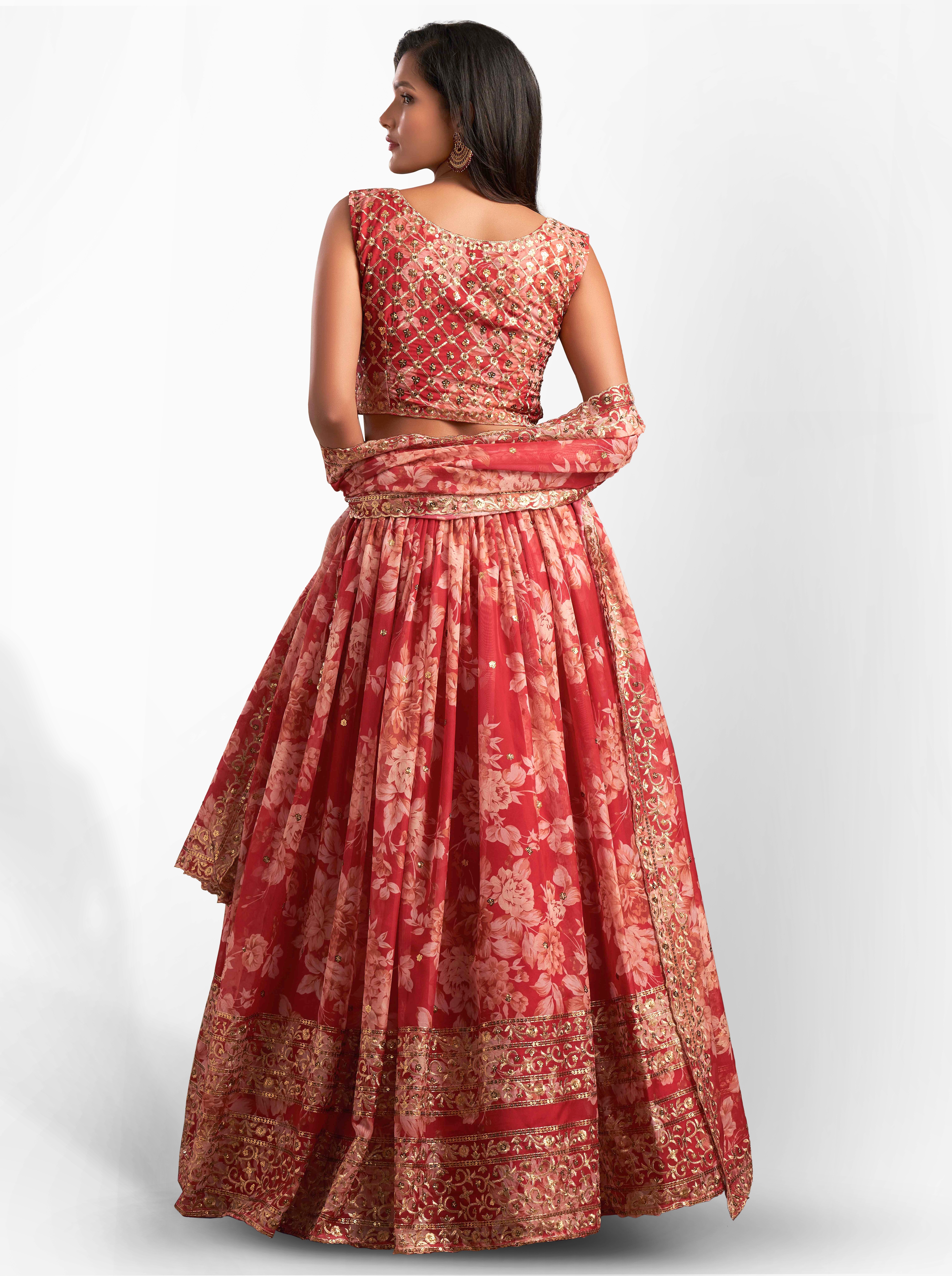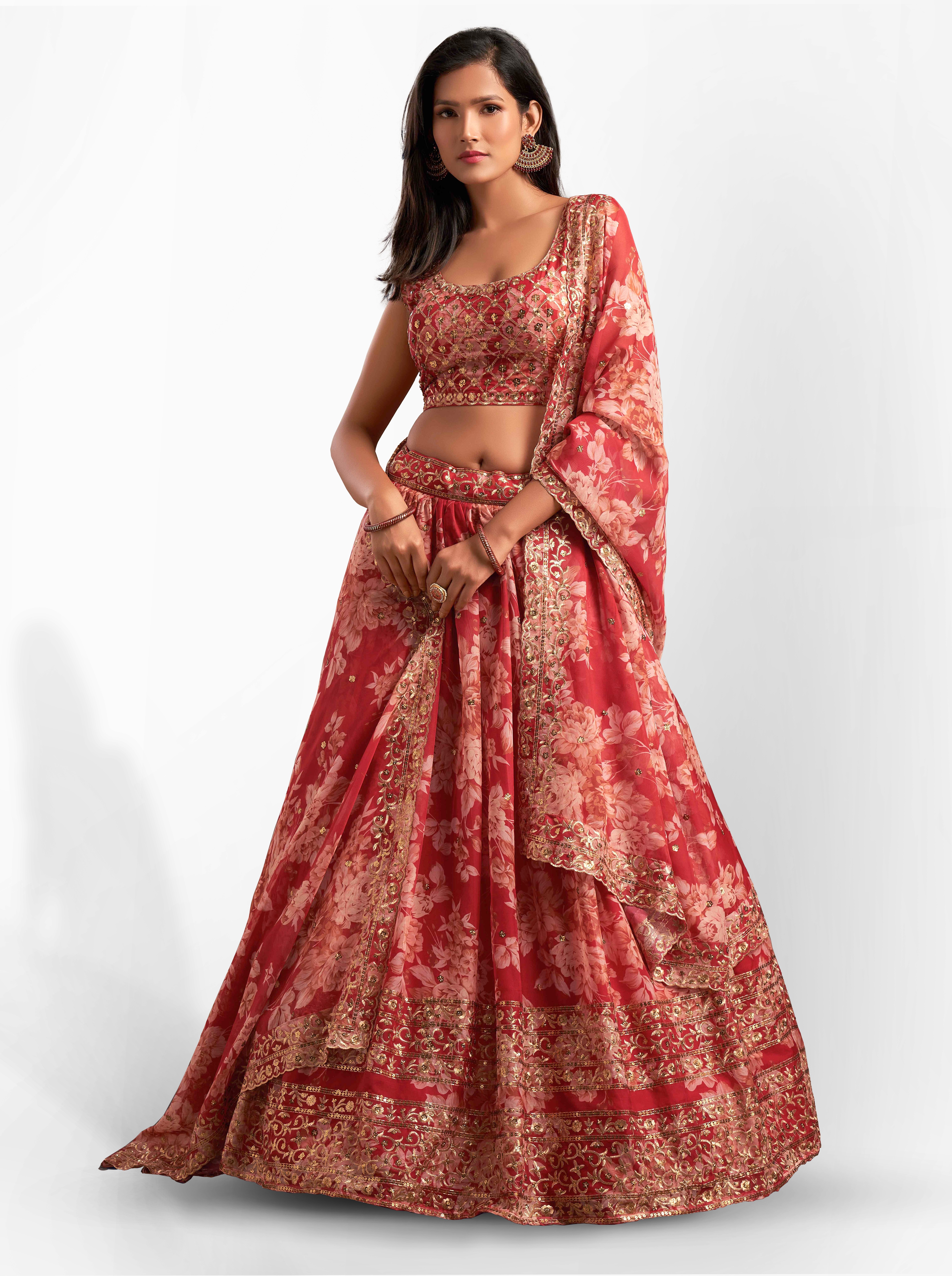 Elevate your ethnic look with this red organza lehenga featuring sequence work,floral work embroidery work. Designed for festive occasions and celebrations, it offers a graceful flow and timeless appeal.Crafted from lightweight organza fabric with a semi-stitched finish, this lehenga ensures comfort and easy customization. Dry clean recommended.