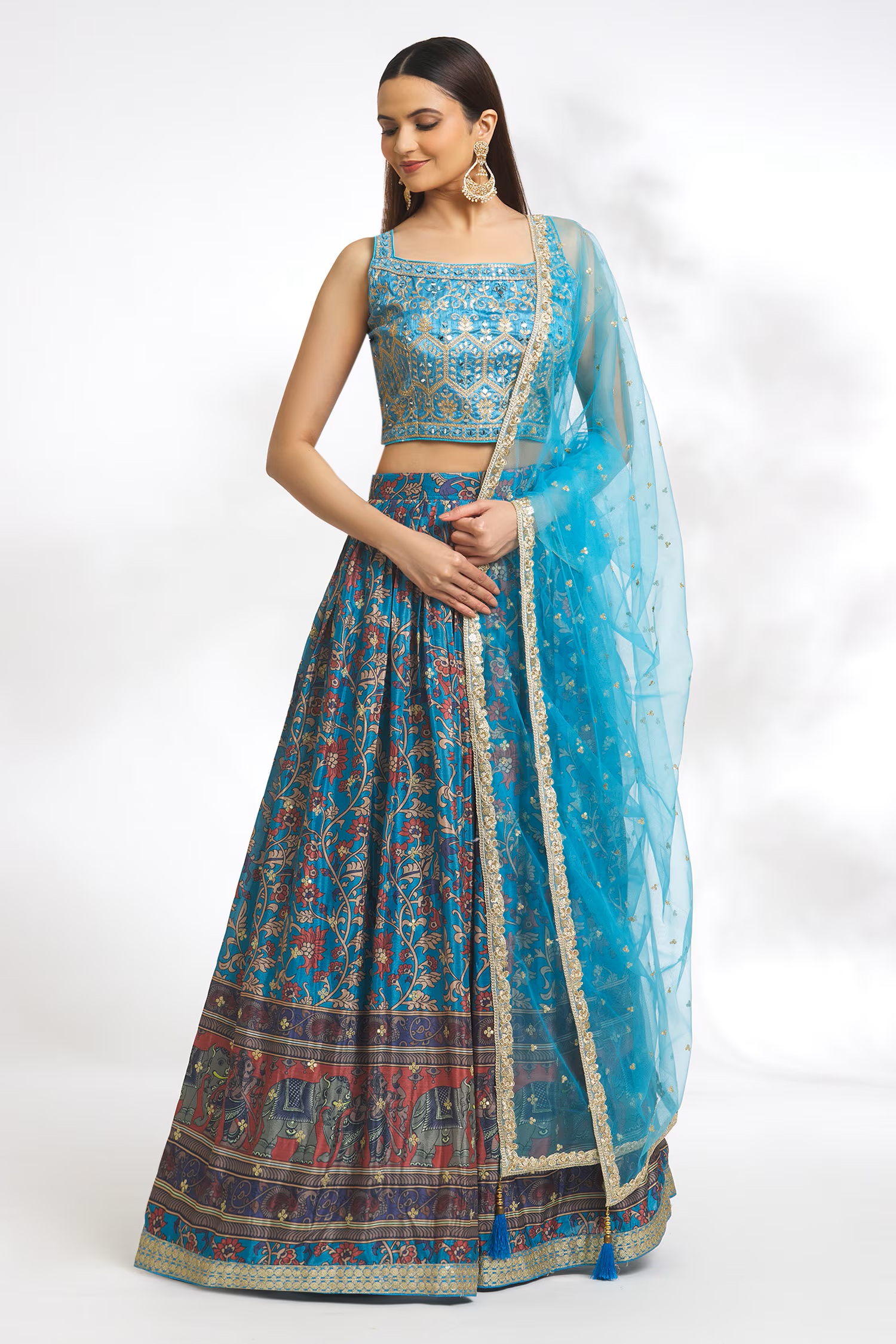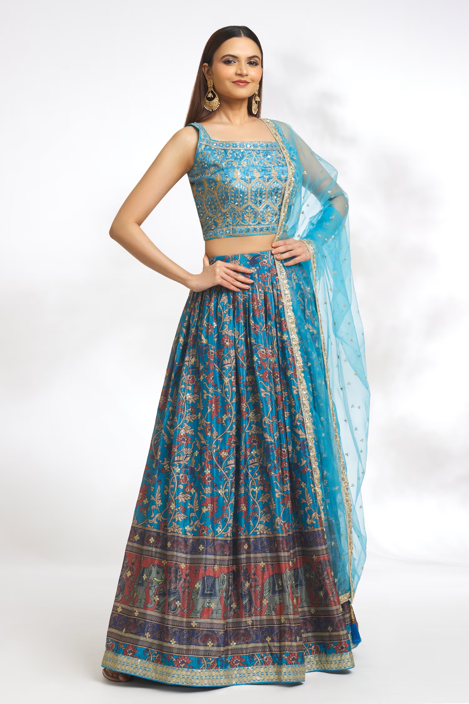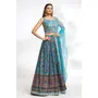Elevate your ethnic look with this sky blue chinnon lehenga featuring embroidered,floral,sequence work. Designed for festive occasions and celebrations, it offers a graceful flow and timeless appeal.Crafted from lightweight chinnon fabric with a semi-stitched finish, this lehenga ensures comfort and easy customization. Dry clean recommended.