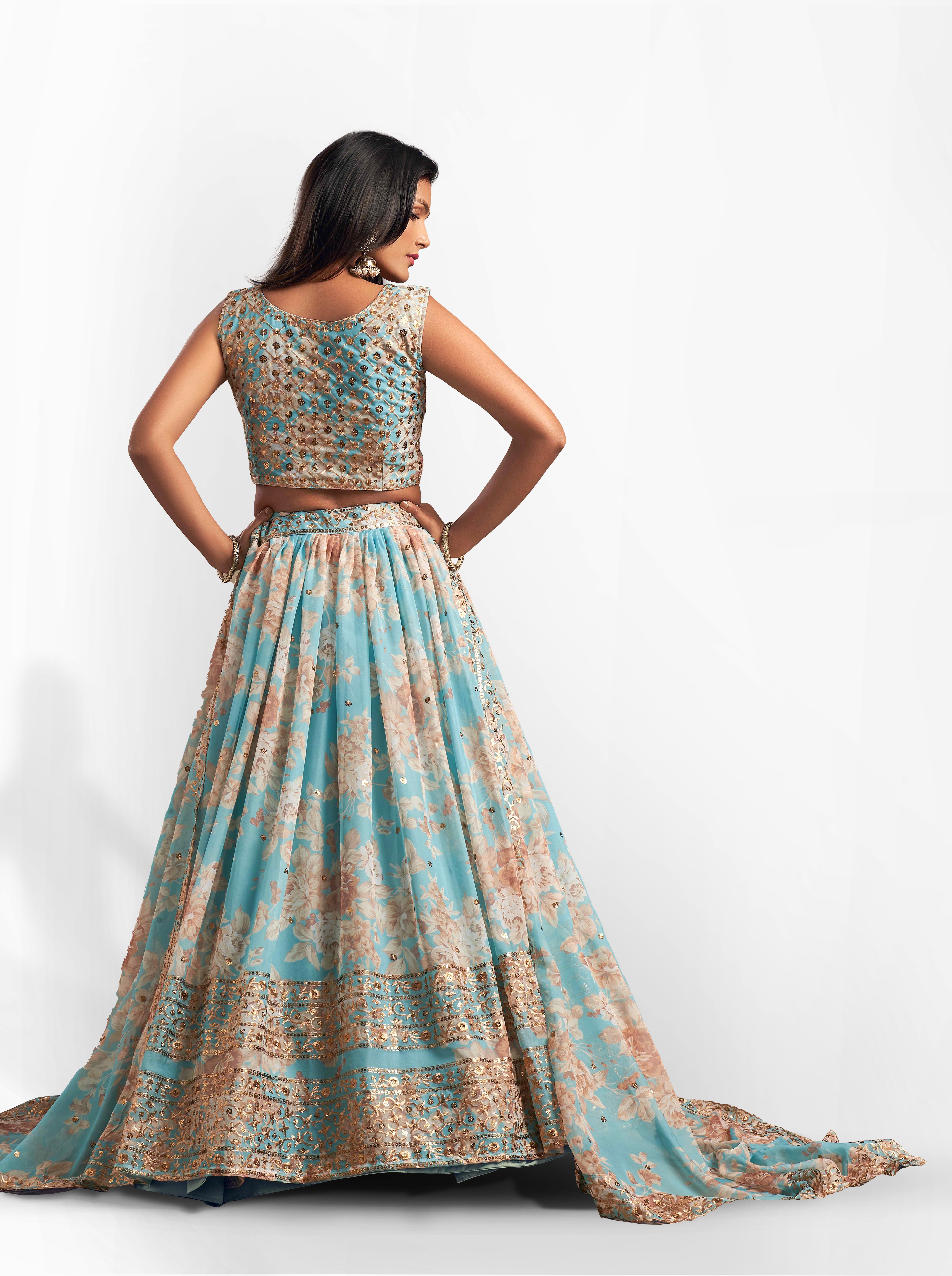 Womens Sky Blue Organza Sequence Work,Floral Work Embroidery Lehenga Set