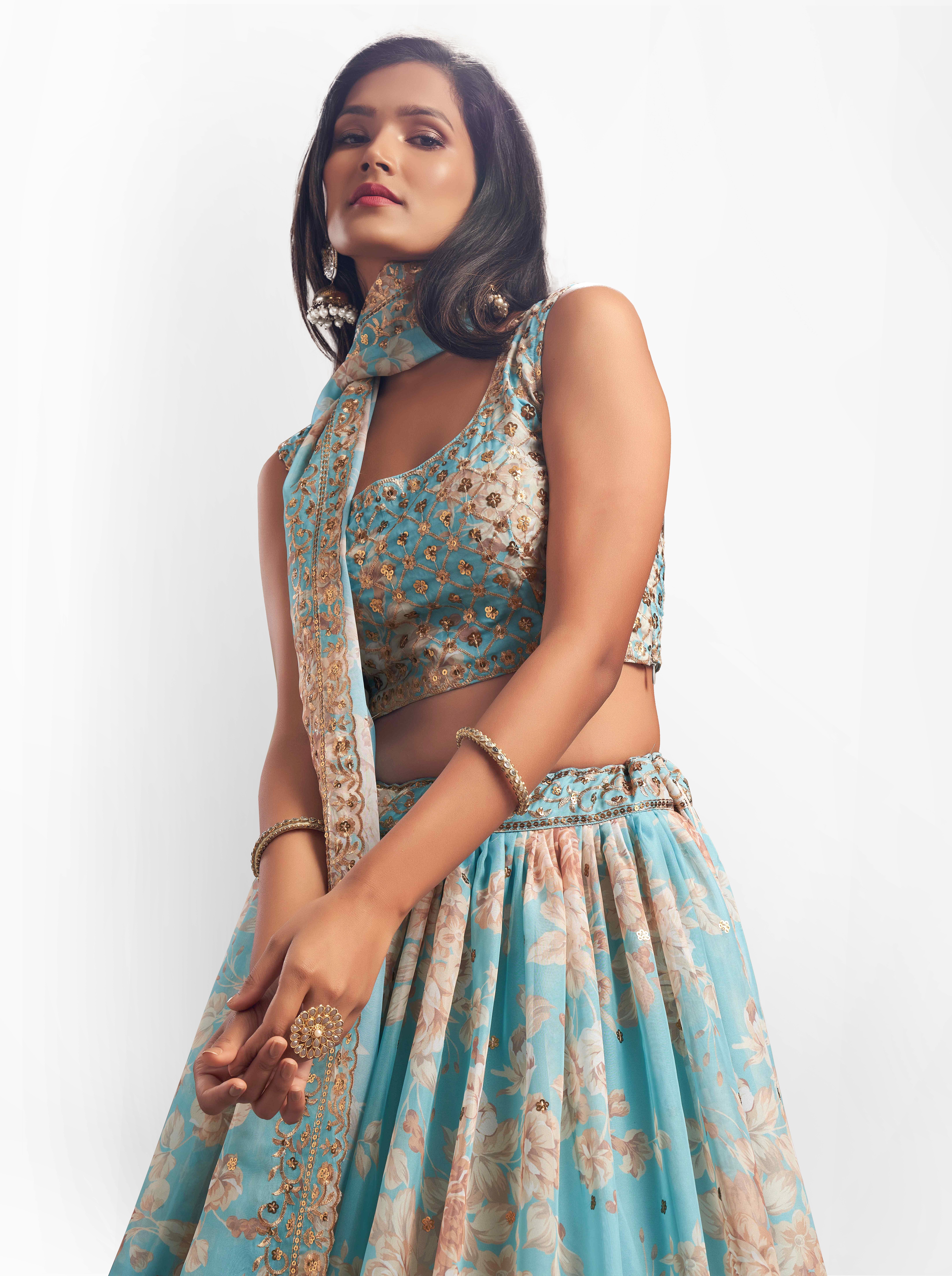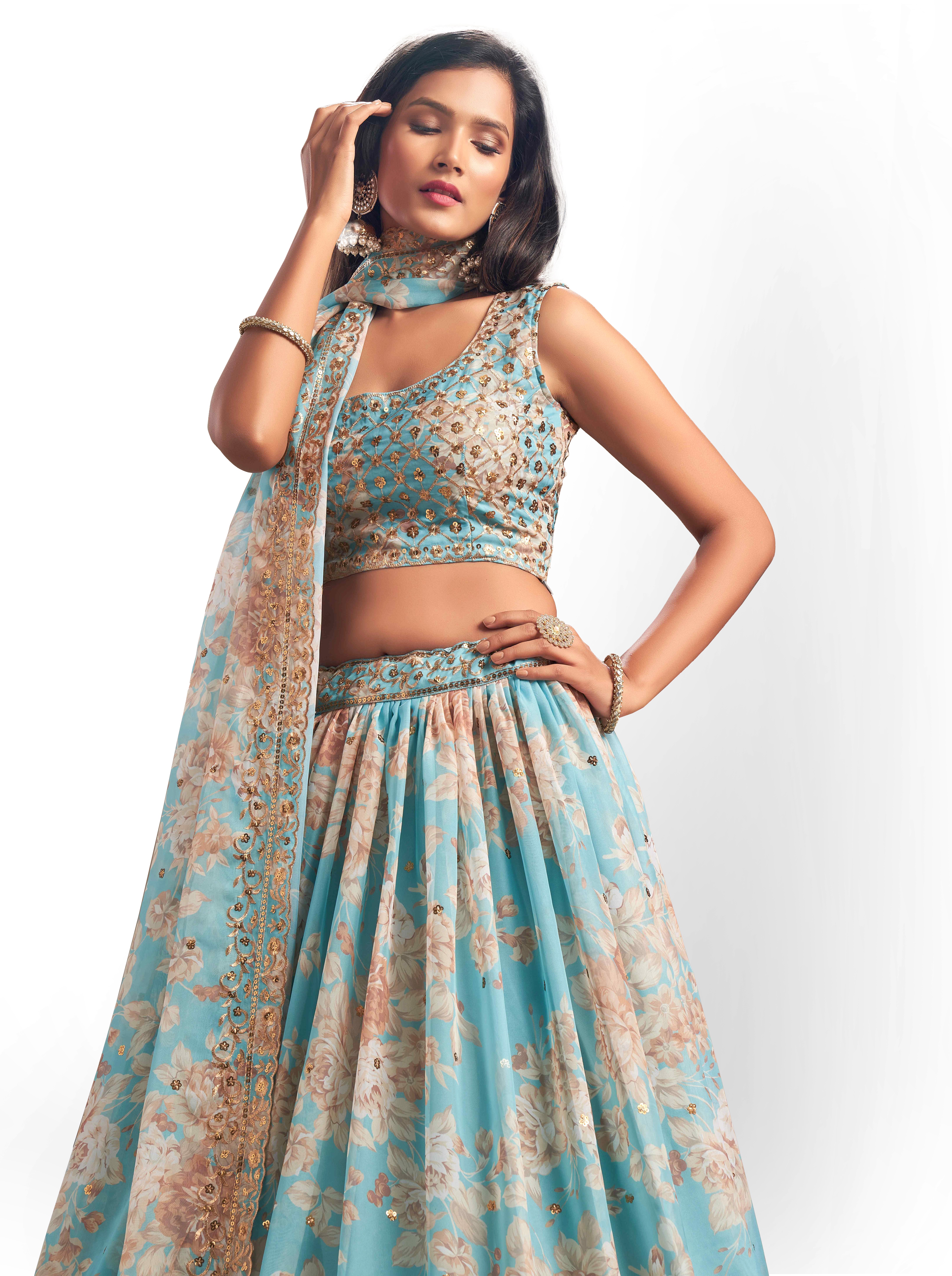 Elevate your ethnic look with this sky blue organza lehenga featuring sequence work,floral work embroidery work. Designed for festive occasions and celebrations, it offers a graceful flow and timeless appeal.Crafted from lightweight organza fabric with a semi-stitched finish, this lehenga ensures comfort and easy customization. Dry clean recommended.