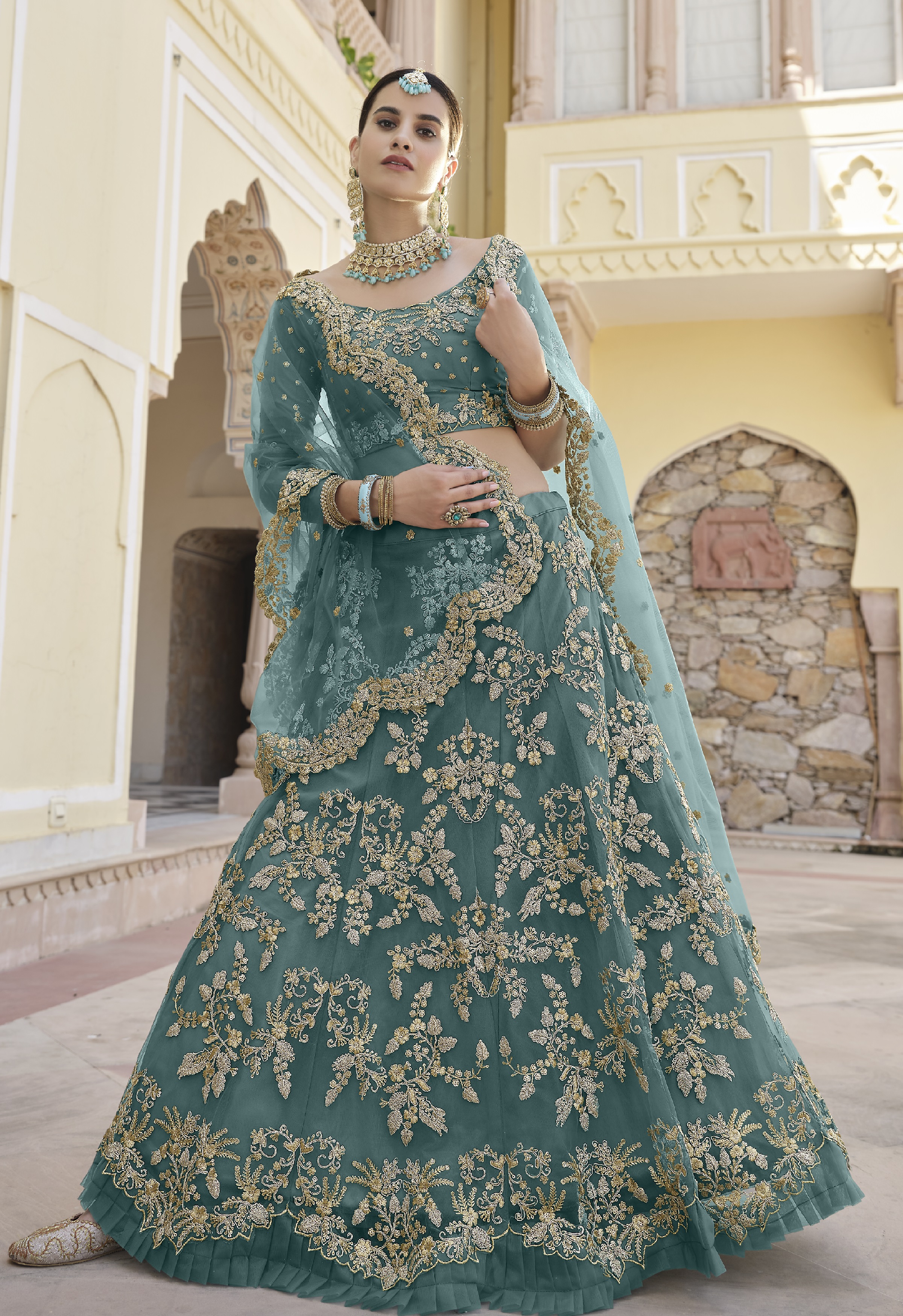 Elevate your ethnic look with this turquoise net lehenga featuring zari work work. Designed for festive occasions and celebrations, it offers a graceful flow and timeless appeal.Crafted from lightweight net fabric with a semi-stitched finish, this lehenga ensures comfort and easy customization. Dry clean recommended.