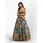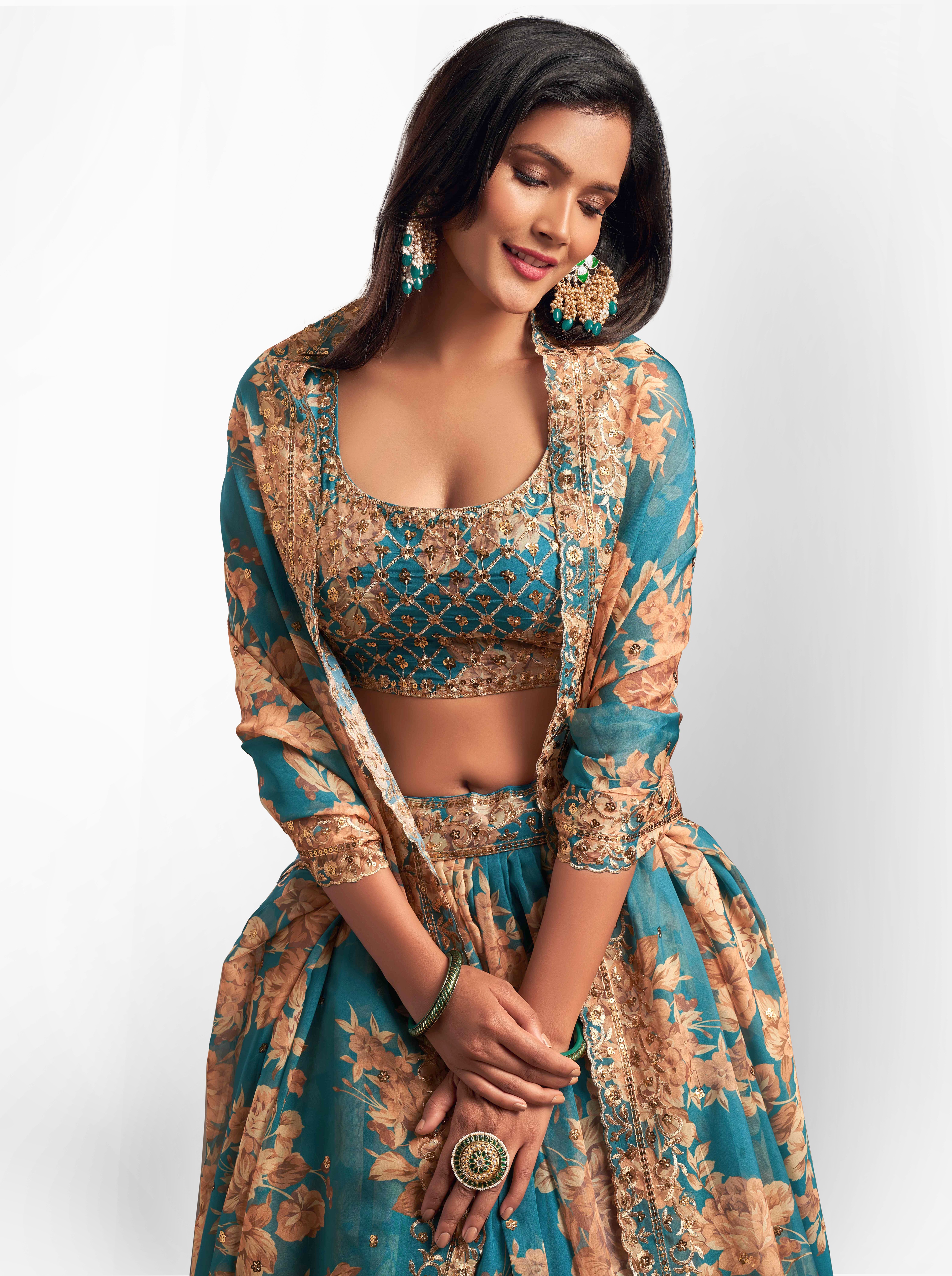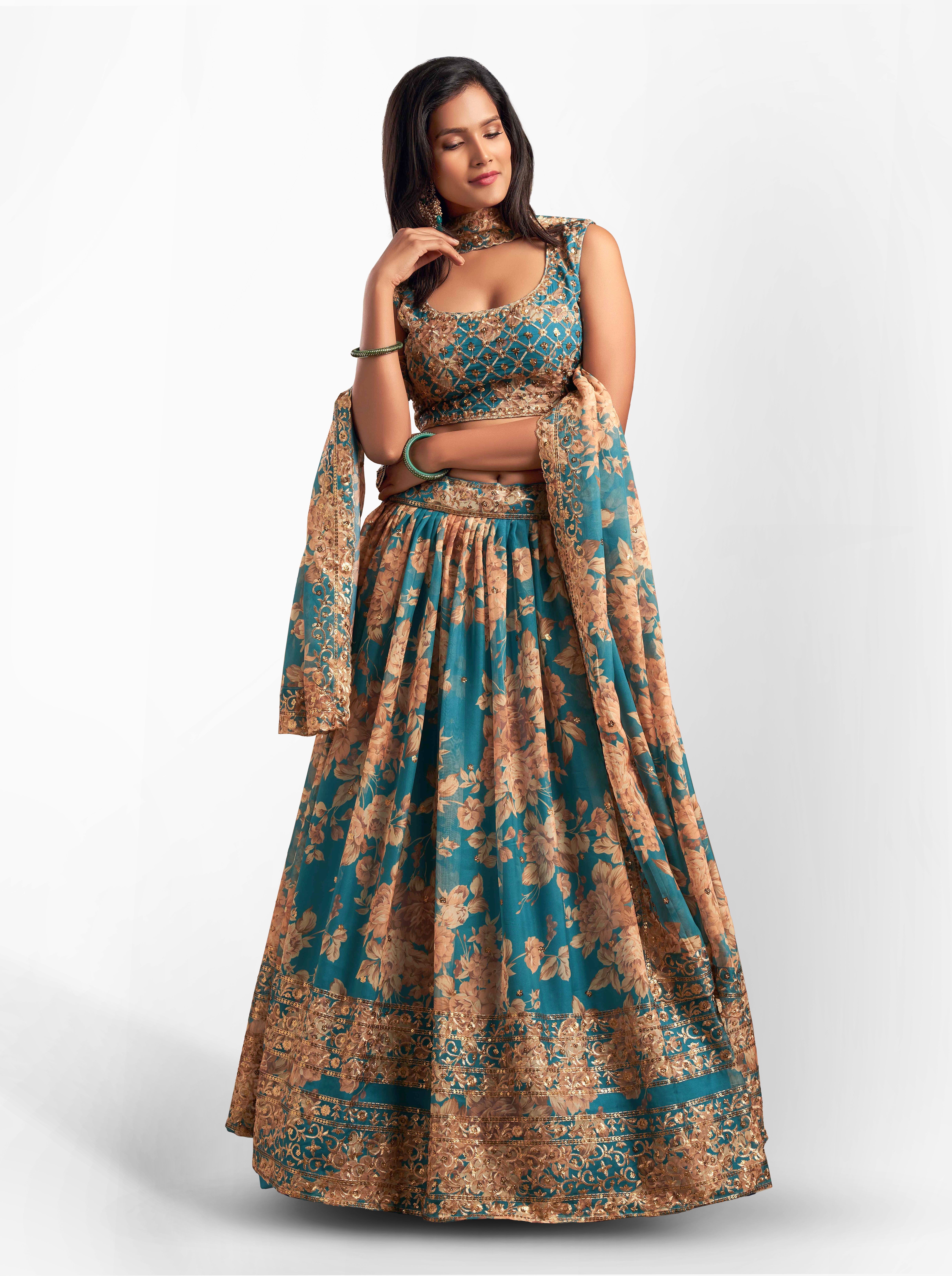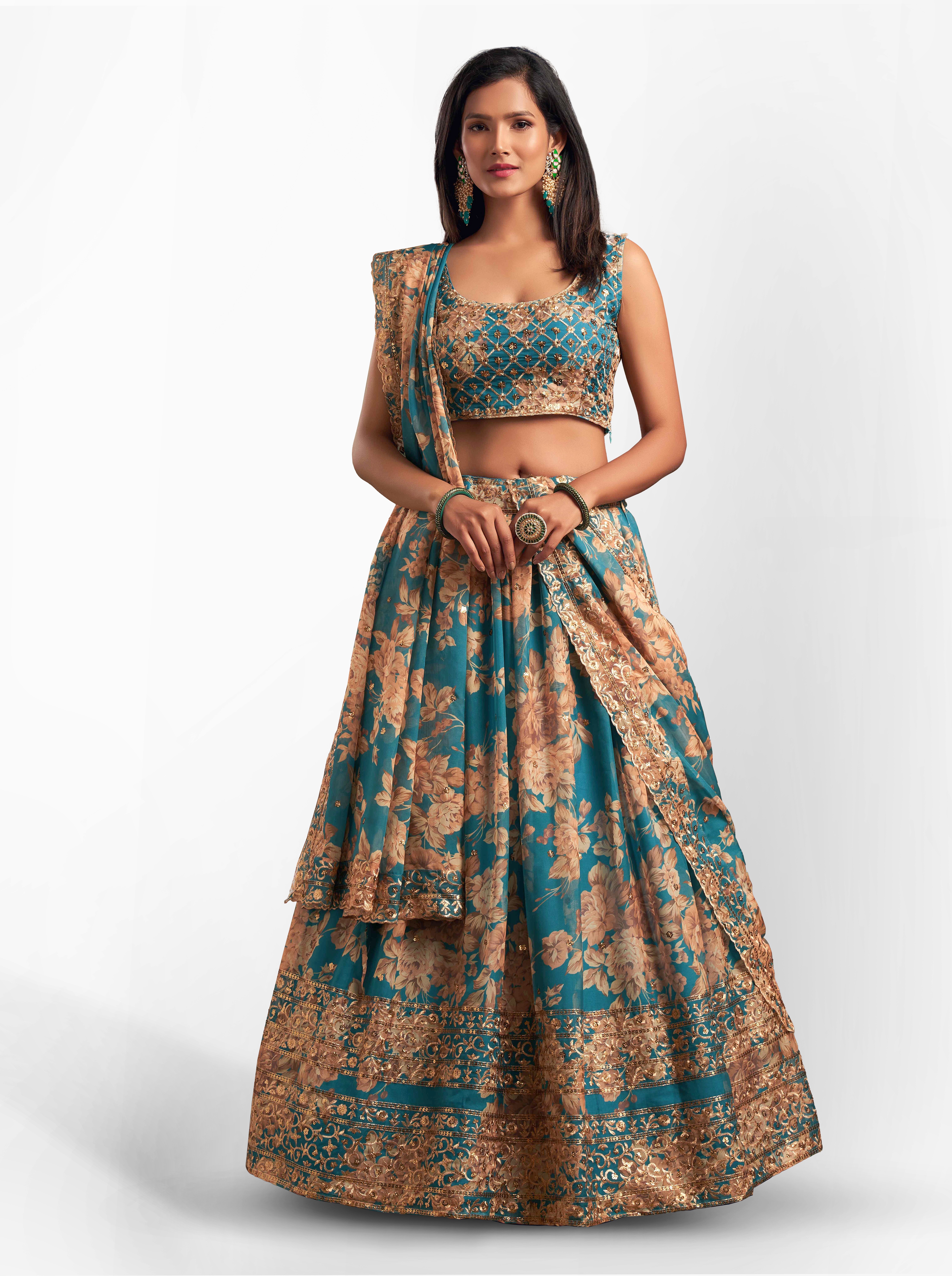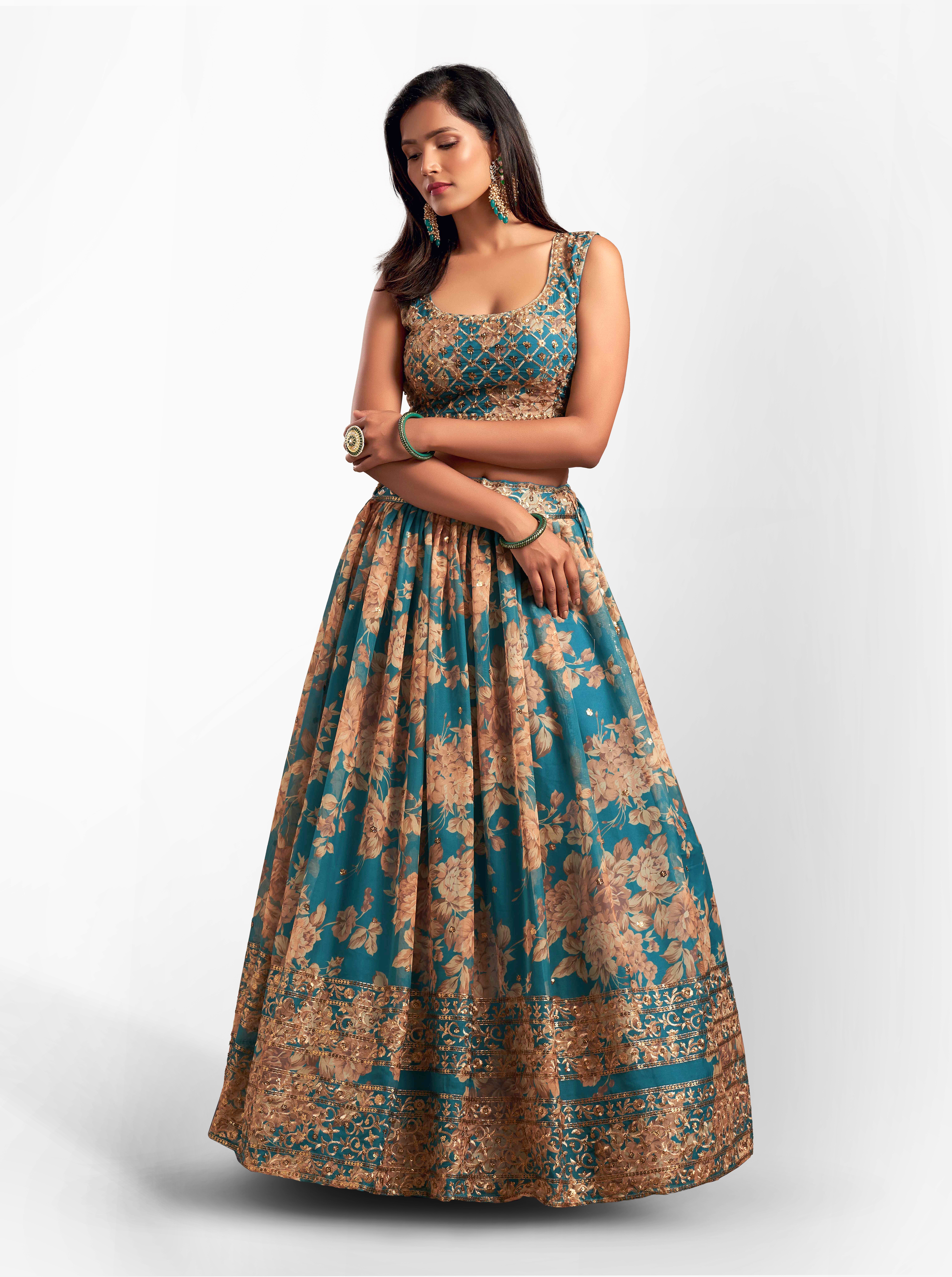Womens Turquoise Organza Sequence Work,Floral Work Embroidery Lehenga Set