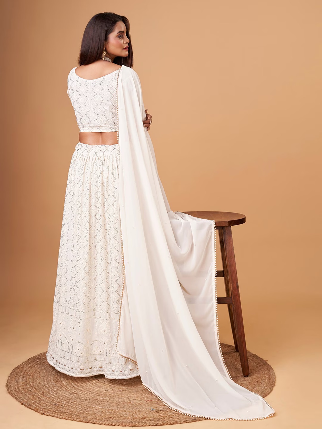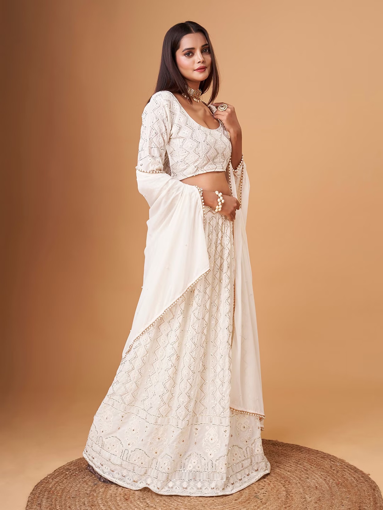 Elevate your ethnic look with this white faux georgette lehenga featuring thread embroidery work. Designed for festive occasions and celebrations, it offers a graceful flow and timeless appeal.Crafted from lightweight faux georgette fabric with a semi-stitched finish, this lehenga ensures comfort and easy customization. Dry clean recommended.