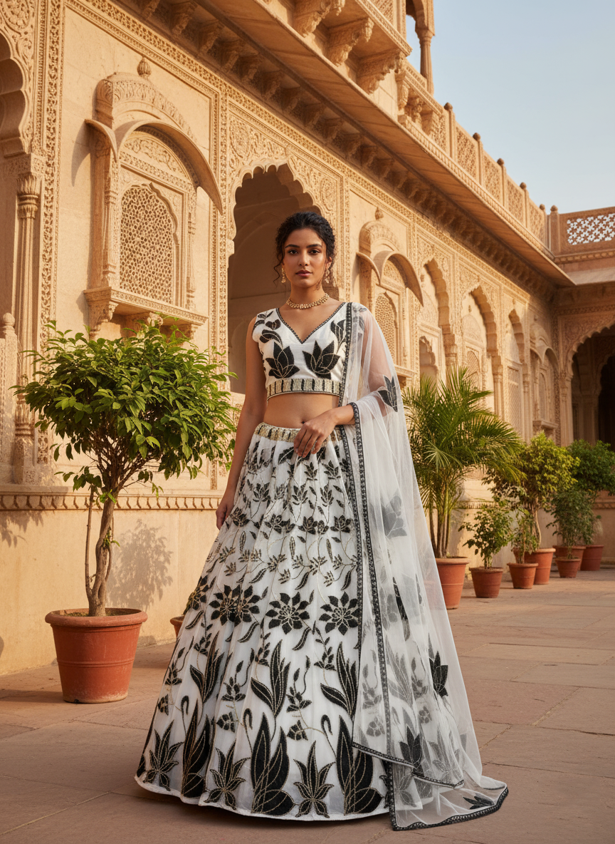 LEHENGA(BOTTOM)FABRIC:- FAUX GEORGETTEINNER:- MICRO FABRICWORK:- BLACK THREAD AND 3MM SEQUINS EMBROIDERY WORKSTITCH:- SEMI STITCHED WITH CANCAN AND CANVASSIZE:- 42HEIGHT AND 42WAISTFLAIR:- 3.50 METER FLAIR COLOR:- BALCK AND OFFWHITECHOLI(TOP):-FABRIC:- FAUX GEORGETTESIZE:- 0.80 METER FABRICWORK:- BLACK THREAD AND 3MM SEQUINS EMBROIDERY WORK STITCH:- UN STITCHED FABRICCOLOR:- BALCK AND OFFWHITEINNER:- MICRO FABRICDUPATTA:-FABRIC:- FAUX GEORGETTEWORK:- BLACK THREAD AND 3MM SEQUINS EMBROIDERY WORKSIZE:- 2.25 METER DUPATTASTITCH:- FULL STITCHEDCOLOR:- BALCK AND OFFWHITEADDITIONALWASH CARE: - DRY CLEAN ONLYCOLOR: - PRODUCT COLOR MAY SLIGHTLY VARY DUE TO PHOTOGRAPHIC LIGHTNING SOURCES OR YOUR DEVICE DISPLAY SETTINGSTHESE ARE MADE TO ORDER DESIGNER STYLES, HENCE EXPECT A SLIGHT VARIATION FROM THE IMAGE DISPLAYEDIN THE BOX 1 PIECE LEHENGA 1 PIECE DUPATTA 1 PIECE BLOUSE FABRIC.