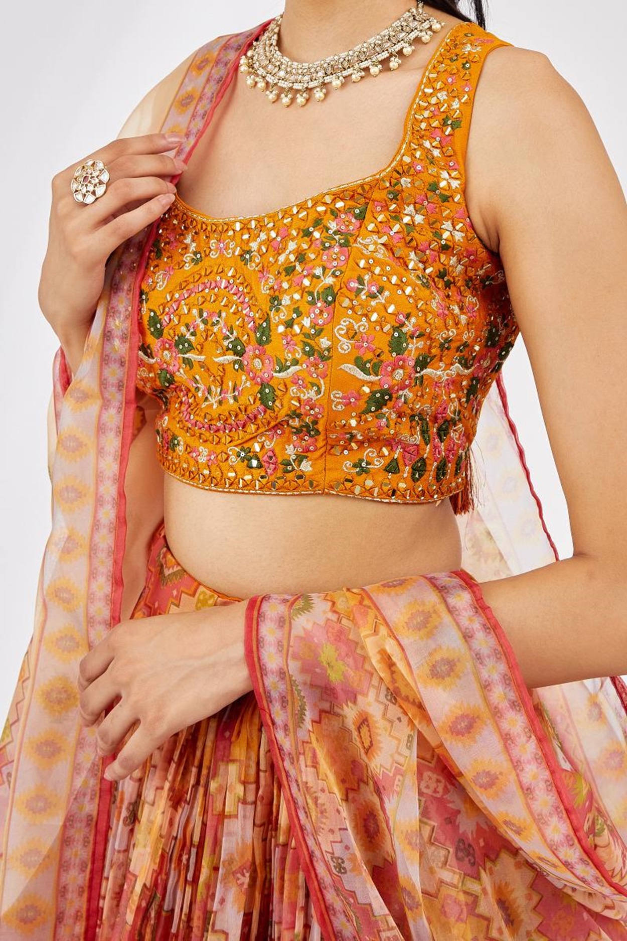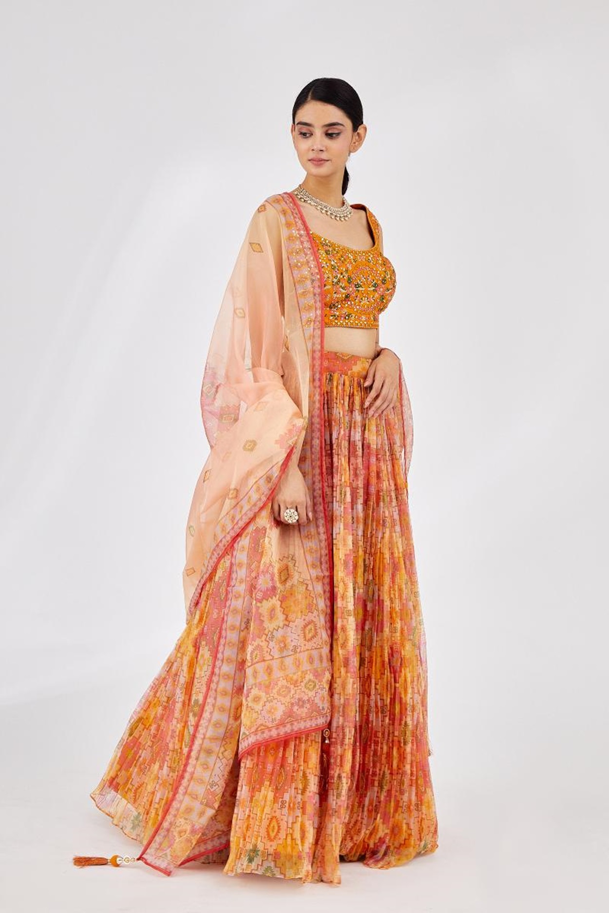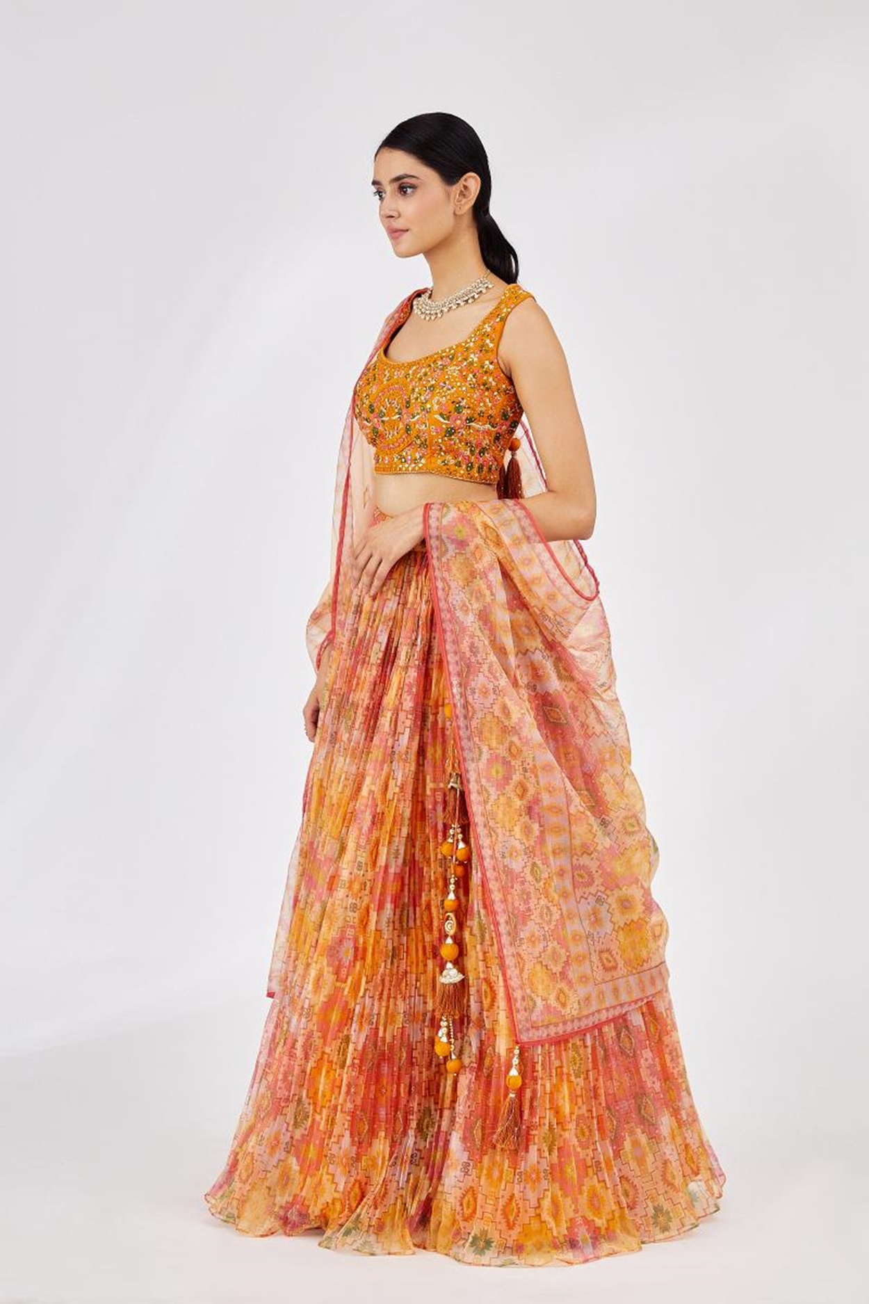 Elevate your ethnic look with this yellow organza lehenga featuring digital print work. Designed for festive occasions and celebrations, it offers a graceful flow and timeless appeal.Crafted from lightweight organza fabric with a semi-stitched finish, this lehenga ensures comfort and easy customization. Dry clean recommended.