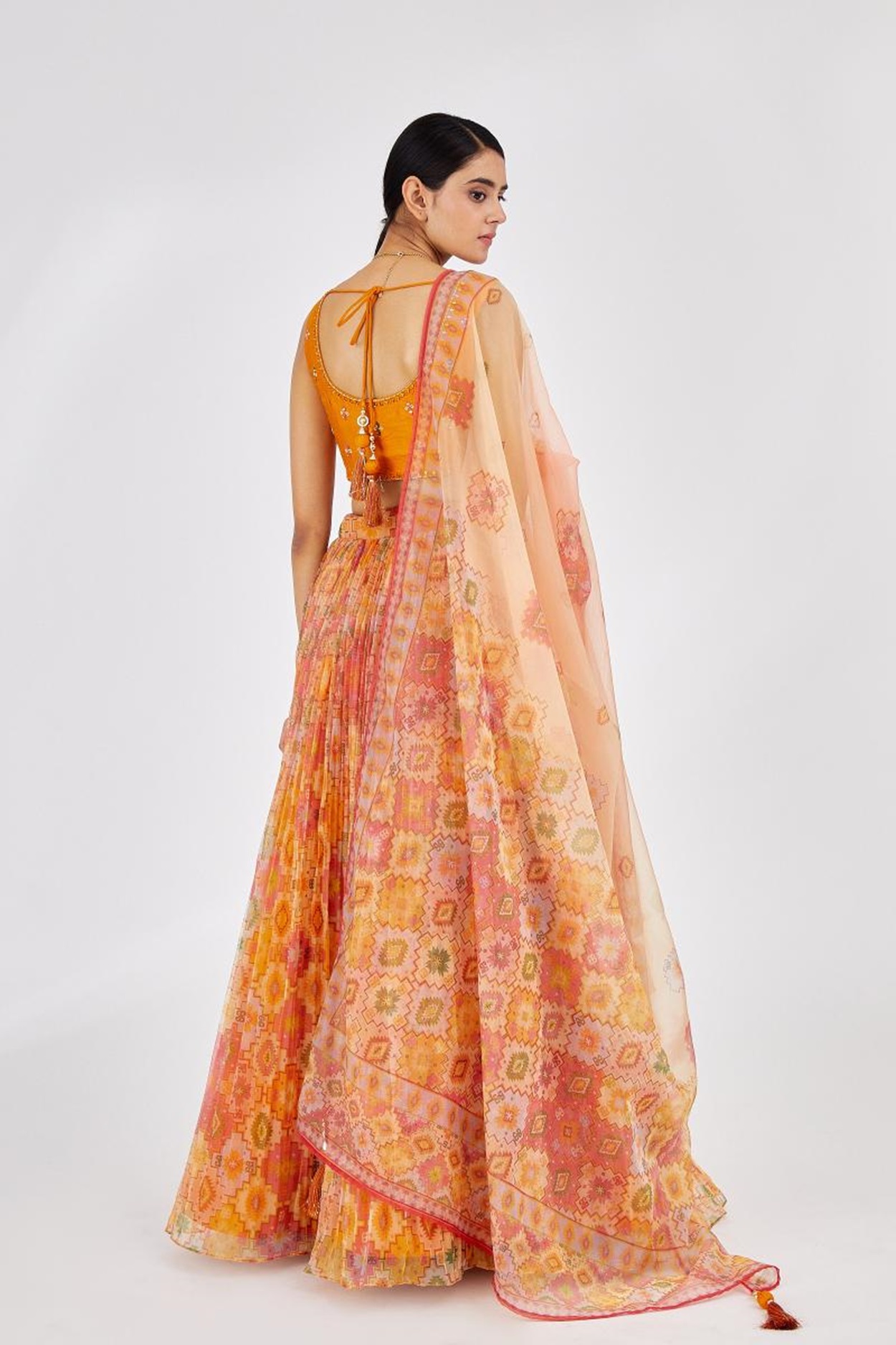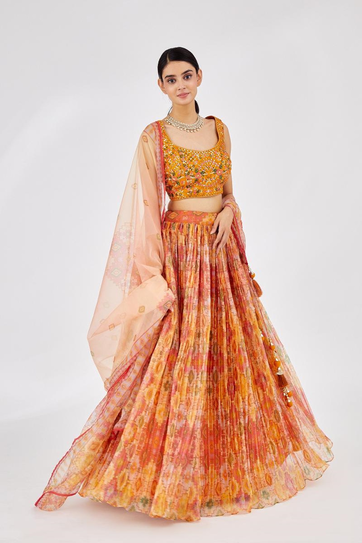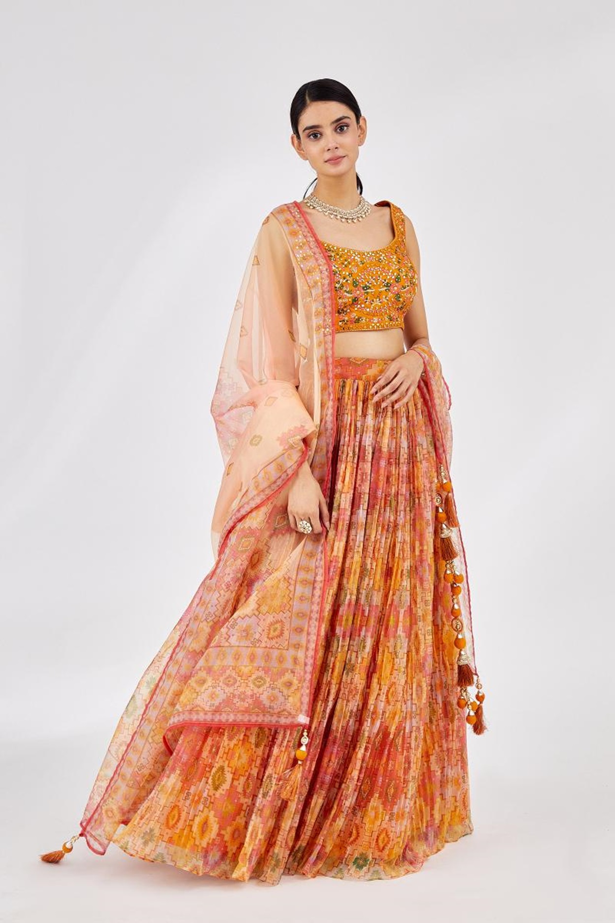 Elevate your ethnic look with this yellow organza lehenga featuring digital print work. Designed for festive occasions and celebrations, it offers a graceful flow and timeless appeal.Crafted from lightweight organza fabric with a semi-stitched finish, this lehenga ensures comfort and easy customization. Dry clean recommended.