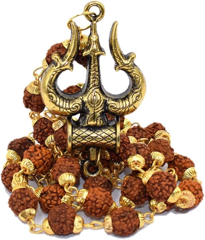 Imagine Stores Mart Men's And Women's Agate Golden Gold-Plated Brass, Wood Lord Shiv Trishul Locket With Panchmukhi Rudraksha Mala