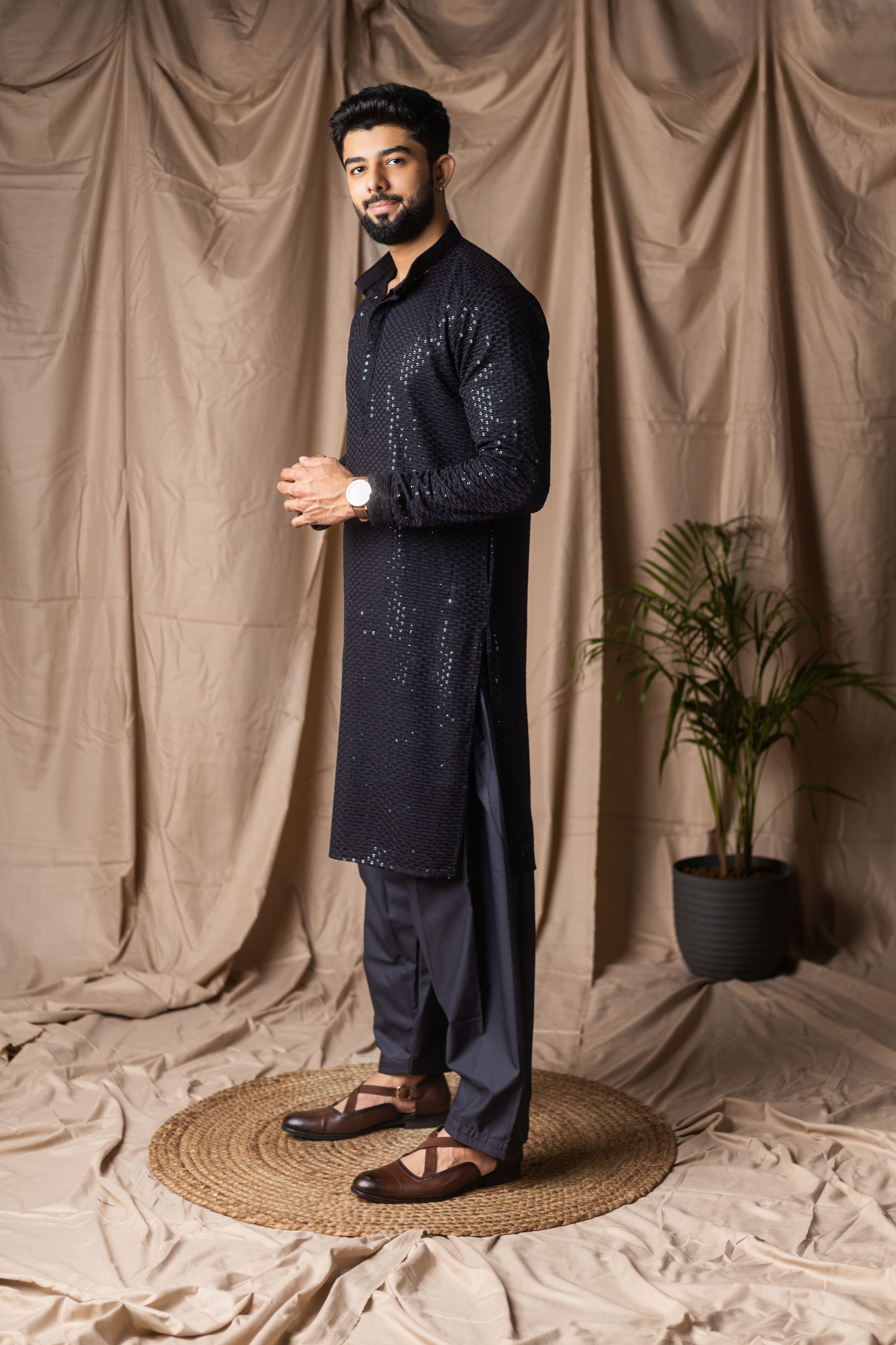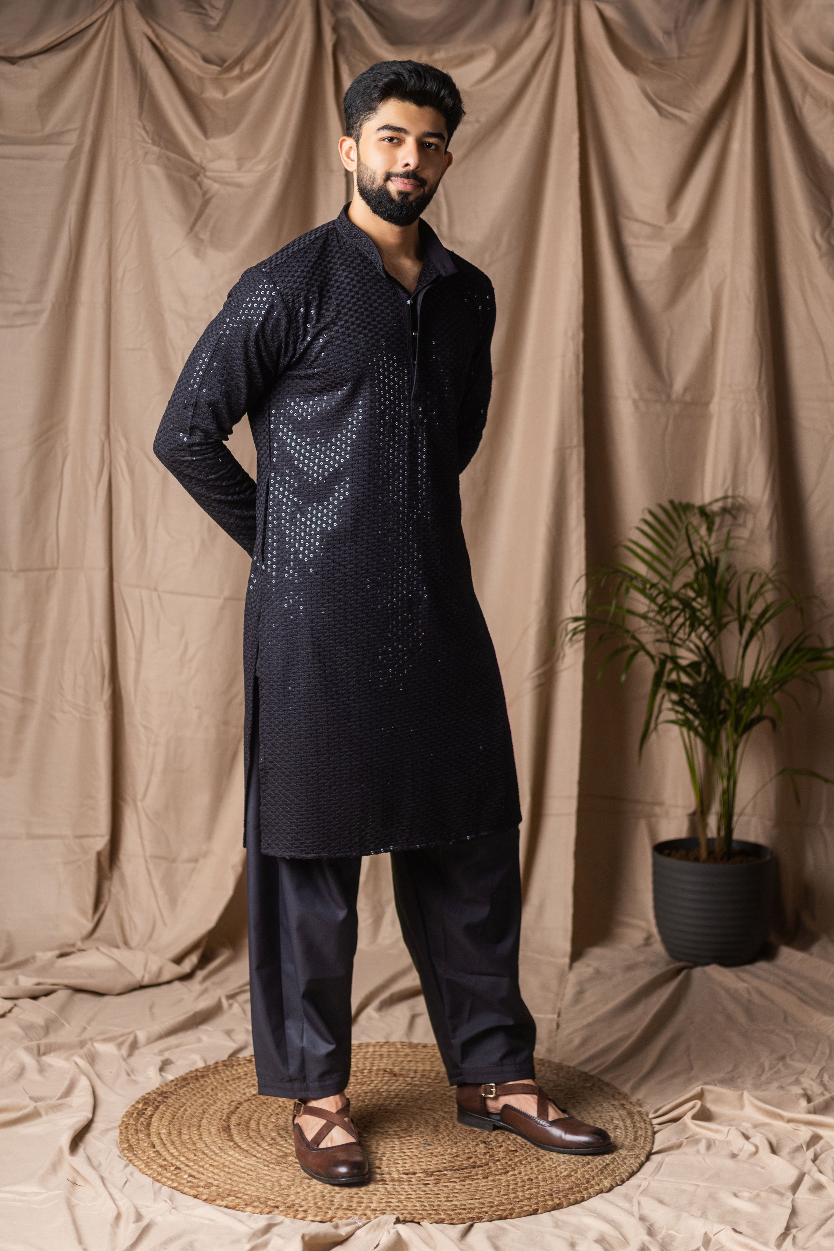Black Color Beautiful Thread Embroidery Work Rayon Fabric Ceremonial Men's Kurta Payjama