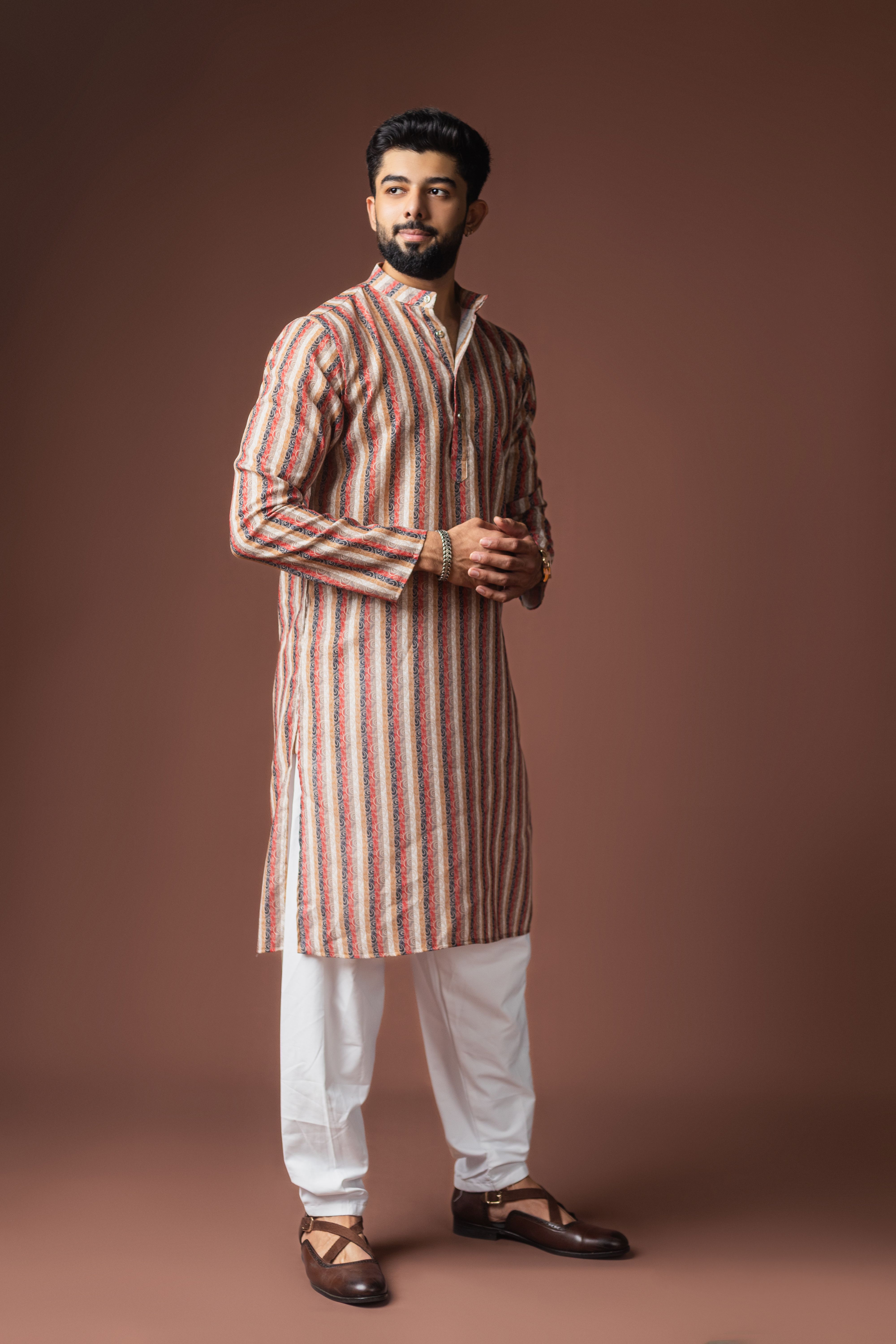 Cream Color Blended Linen Designer Printed Stylish Kurta Payjama For Mens'