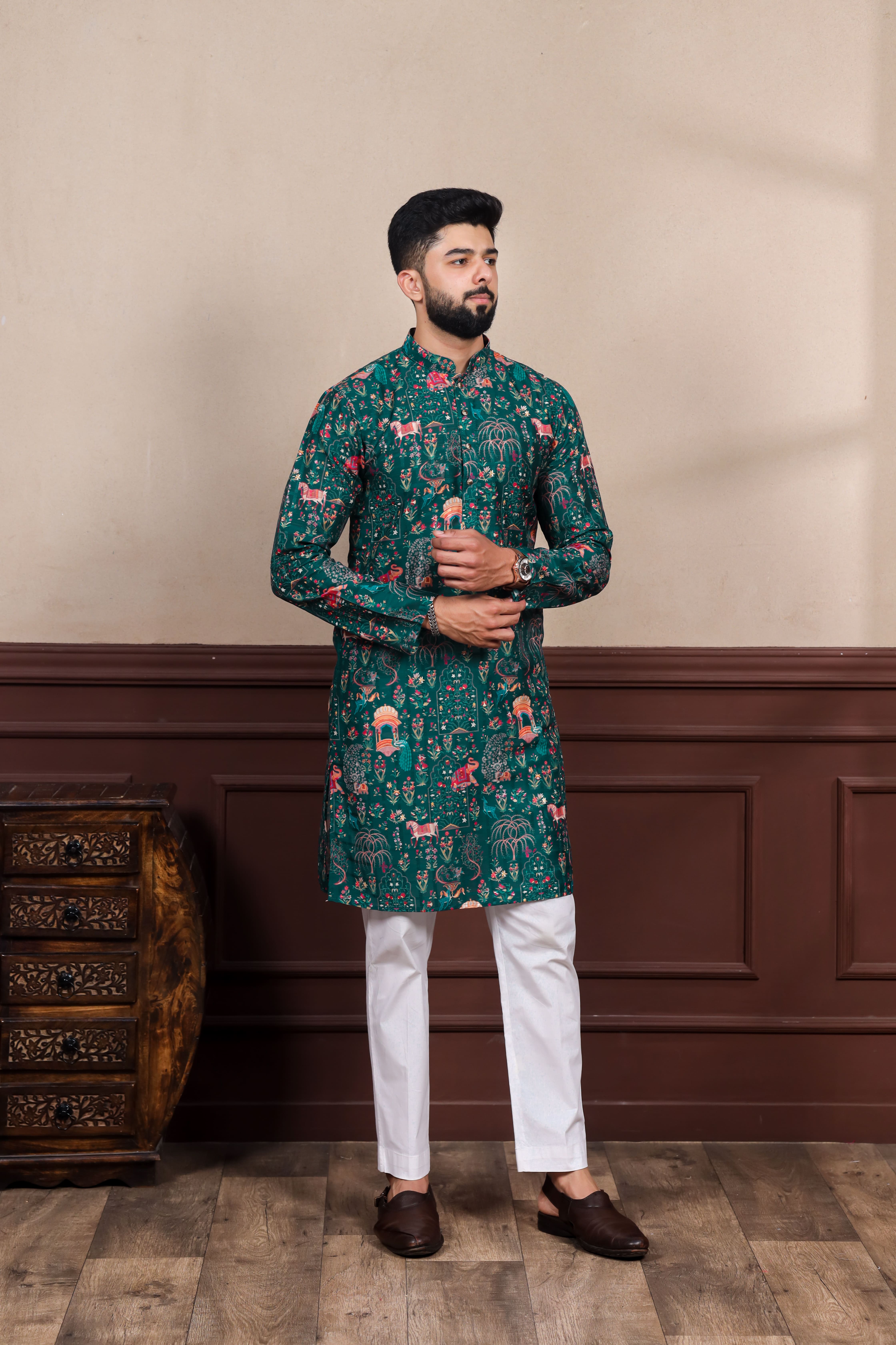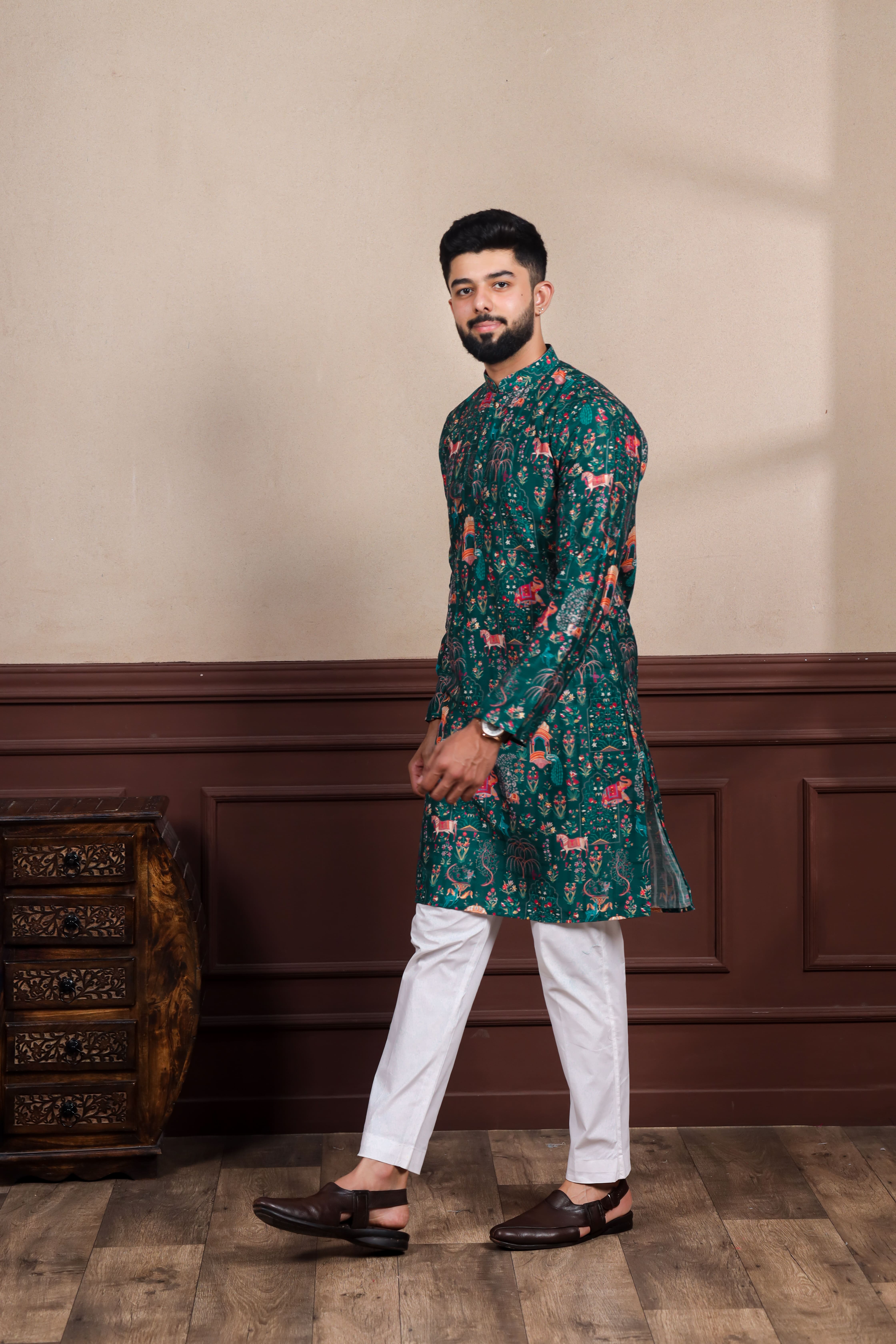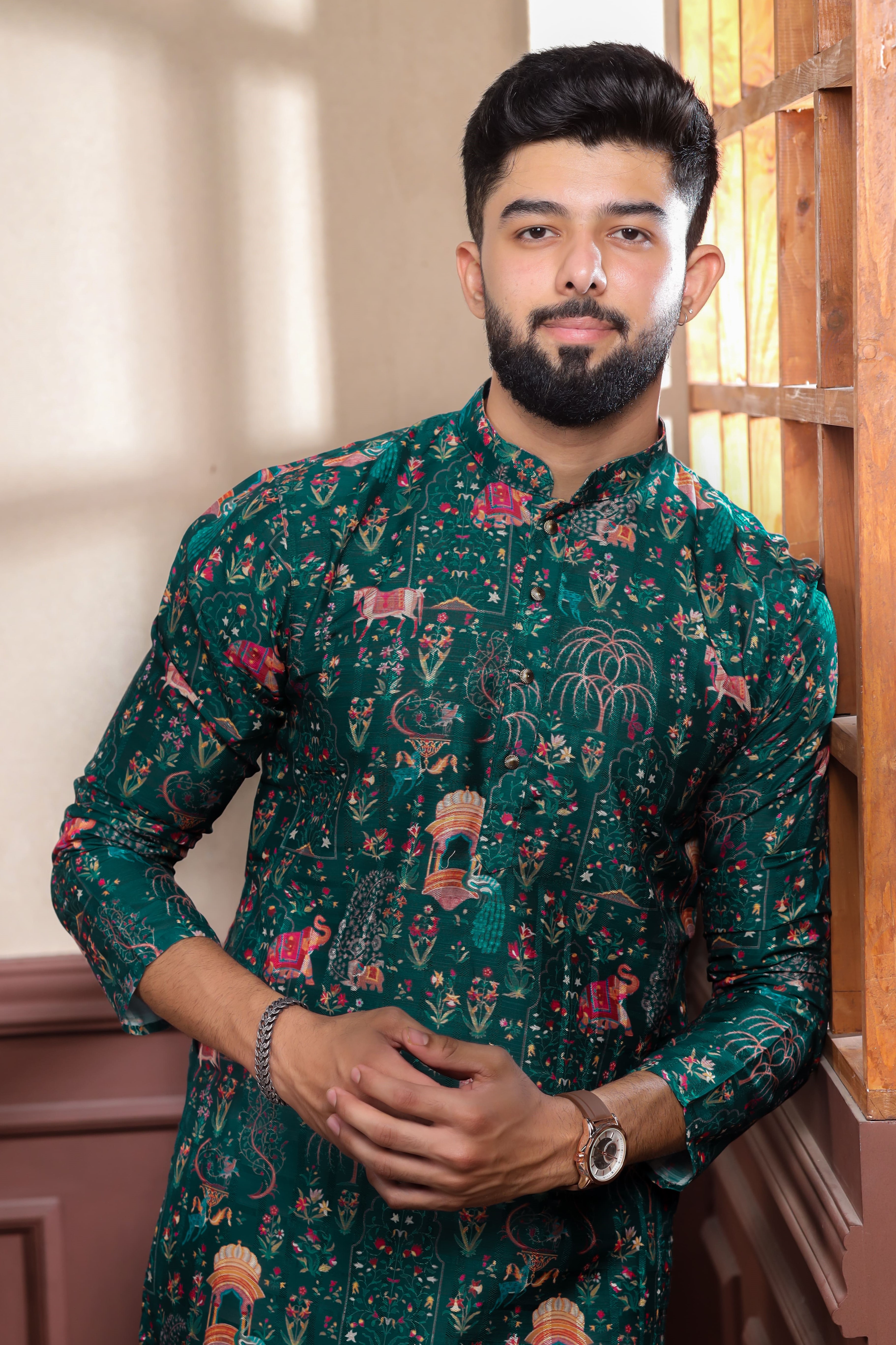 Green Color Ethnic Woven Patta With Digital Printed Ceremonial Kurta Payjama For Men's