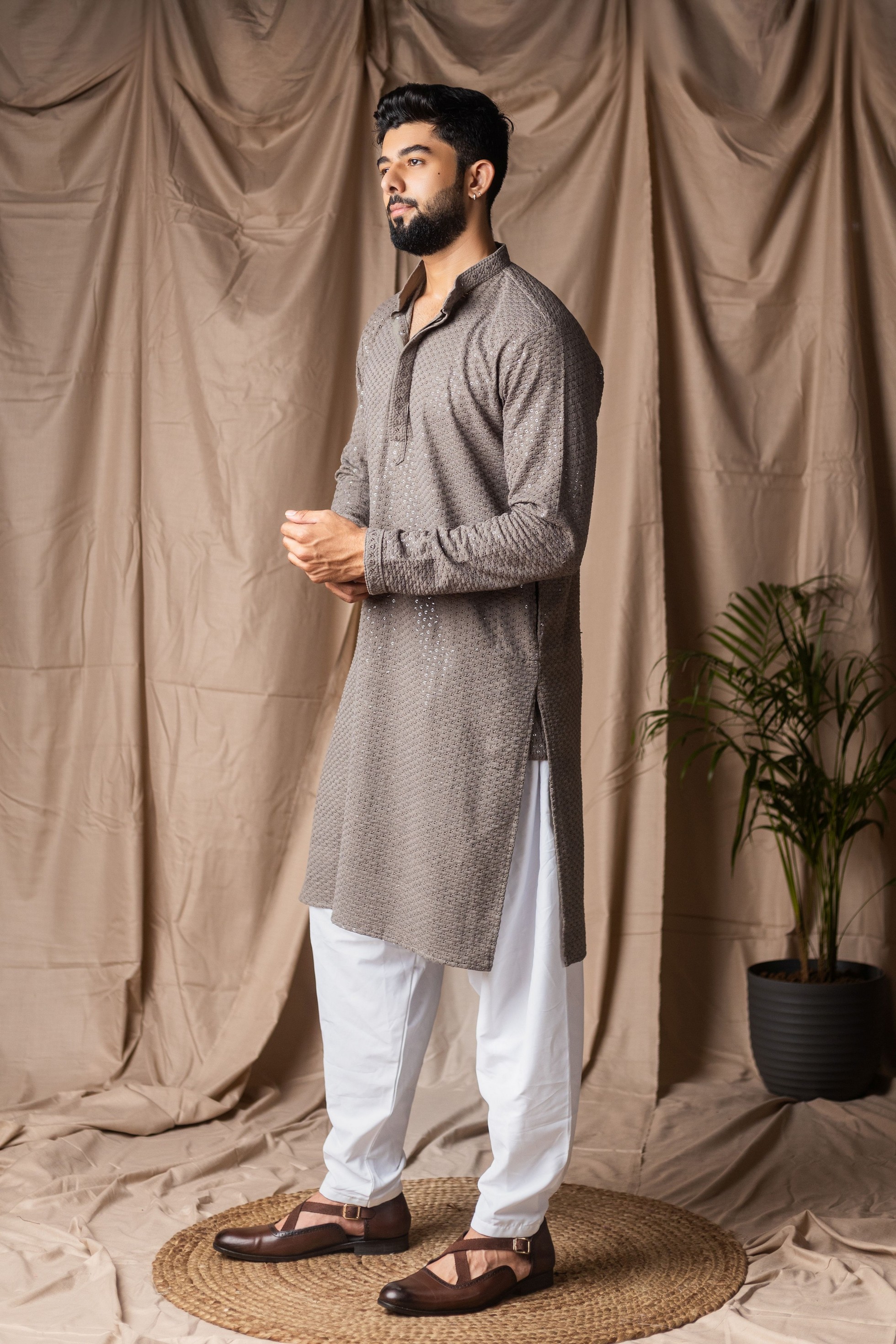 Grey Color Beautiful Thread Embroidery Work Rayon Fabric Ceremonial Men's Kurta Payjama