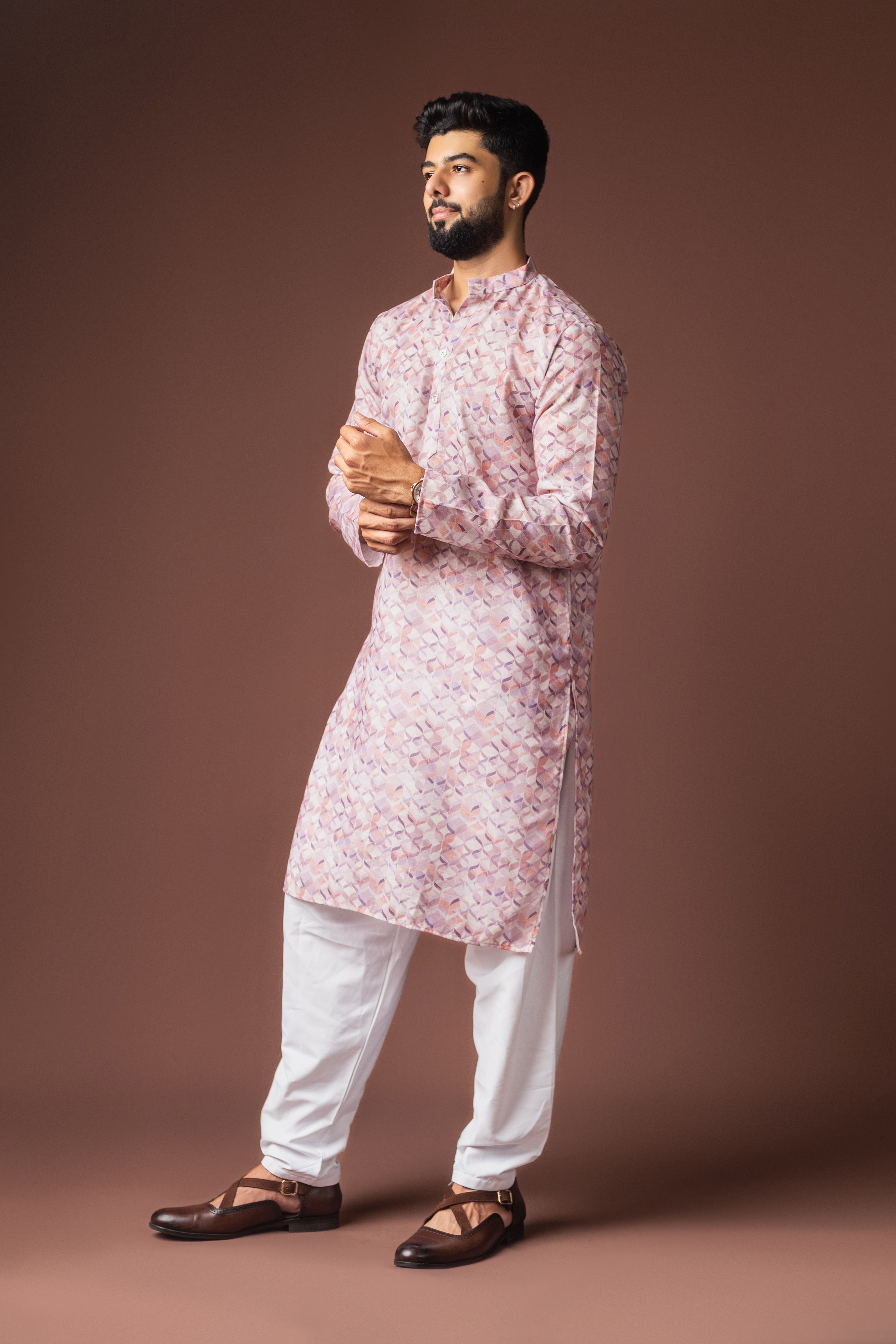 Pink Color Blended Linen Designer Printed Stylish Kurta Payjama For Mens'