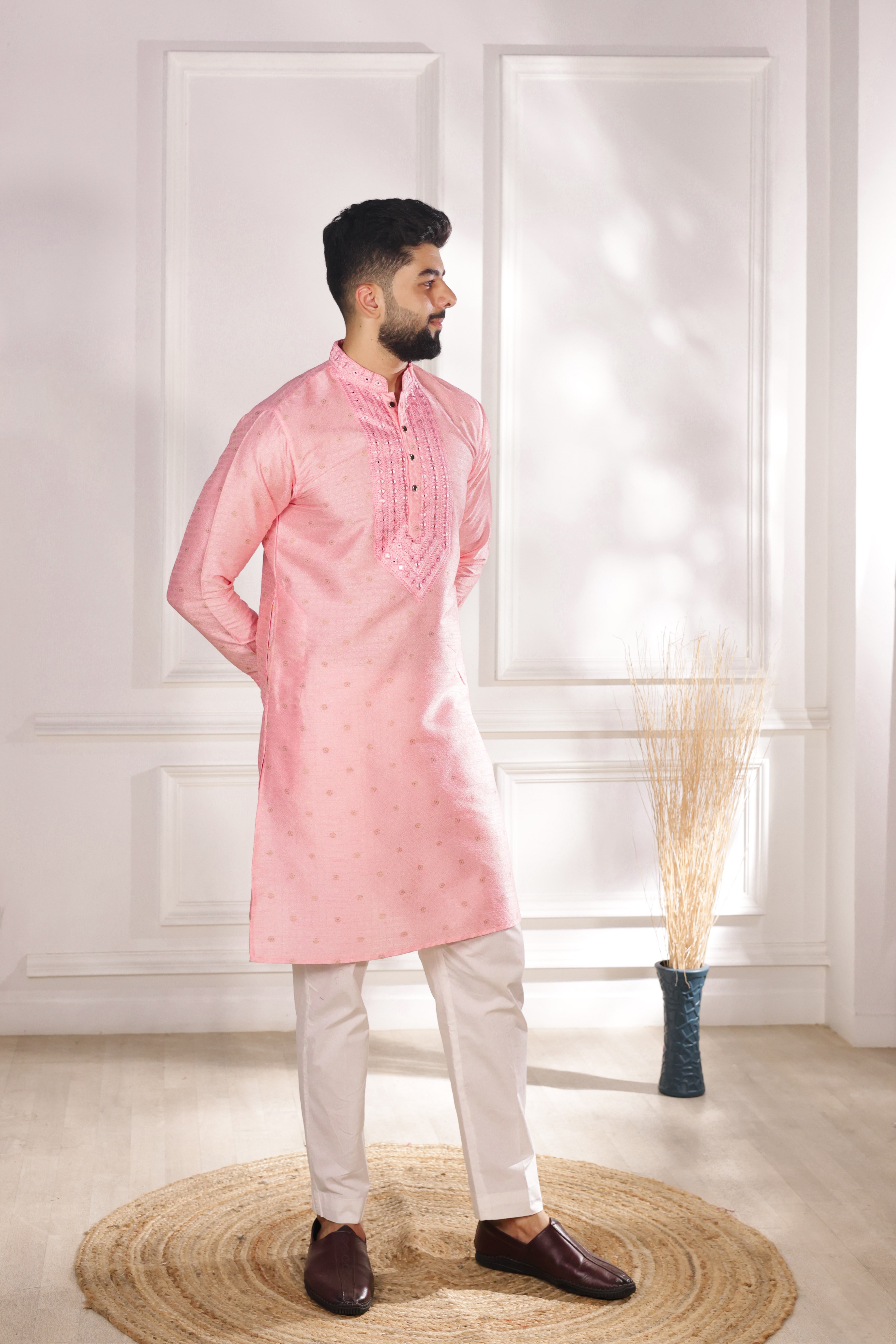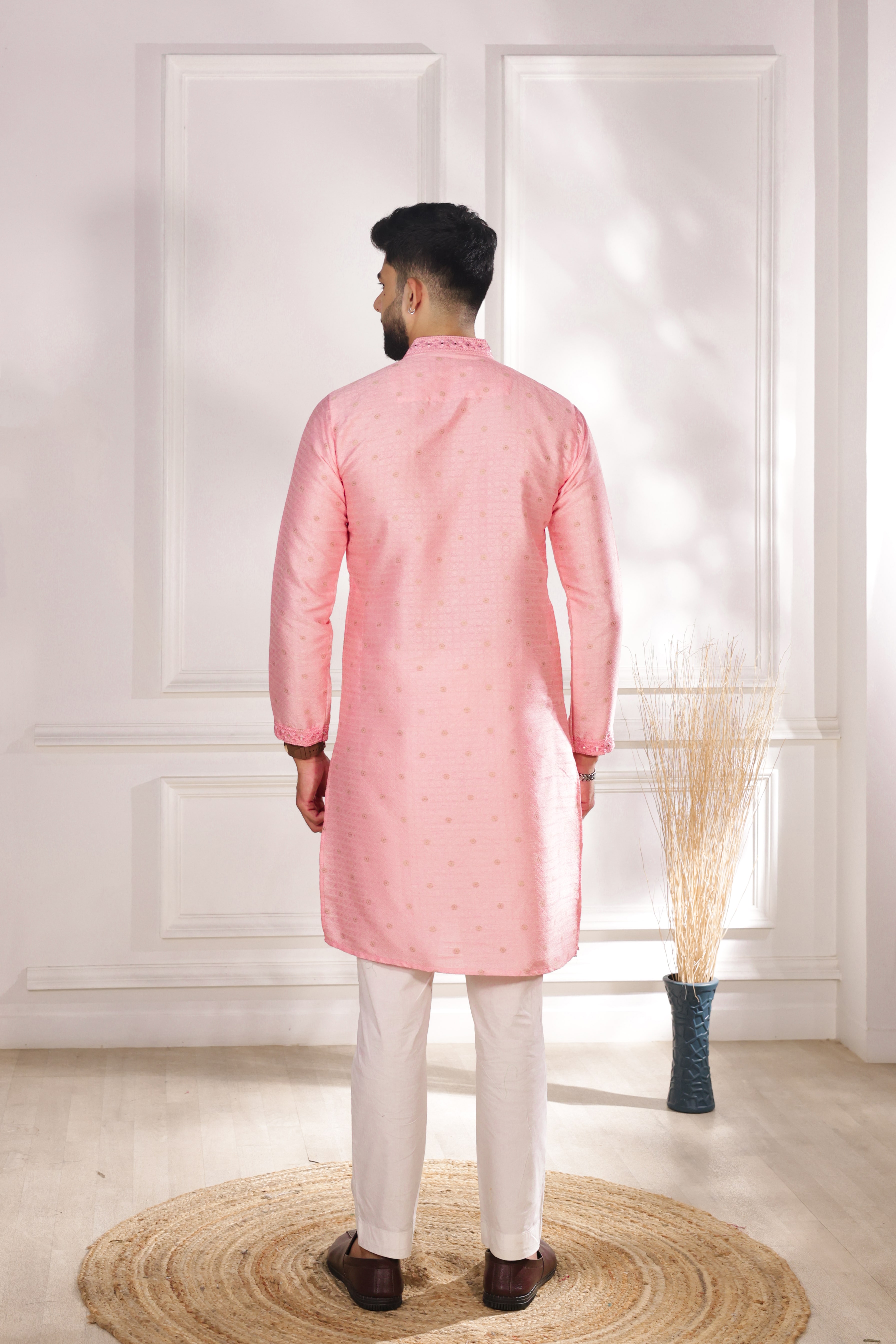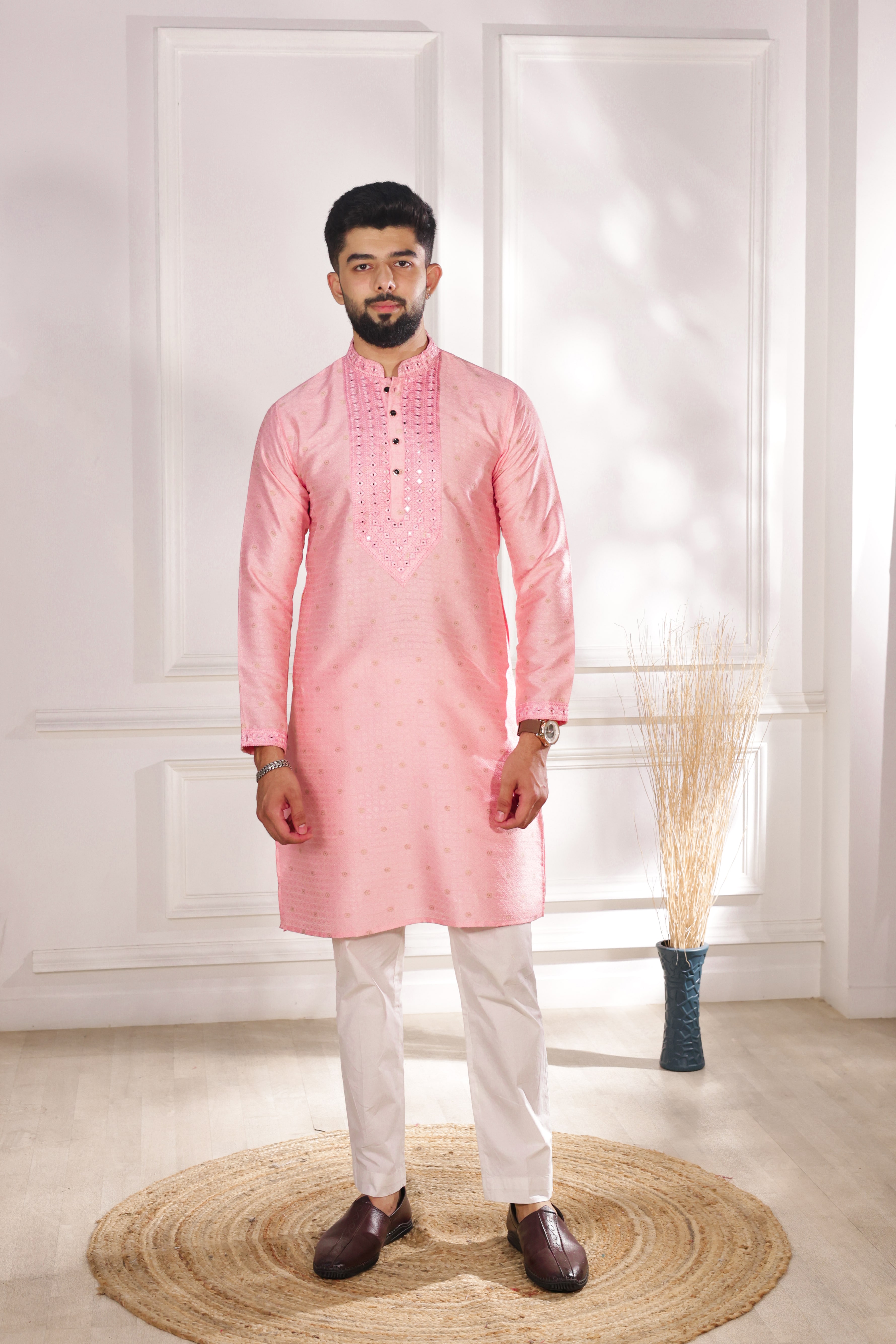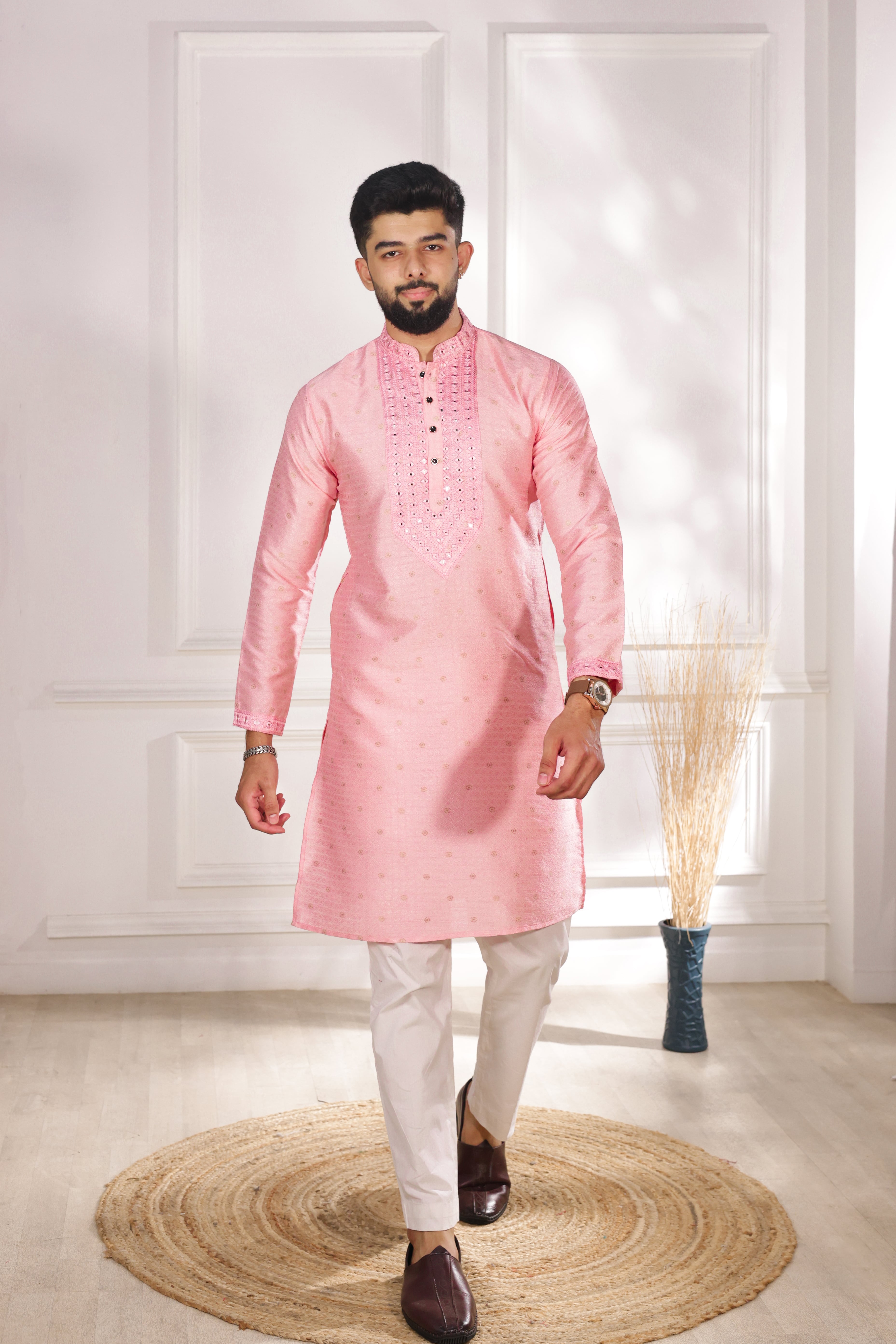 Pink Color Jacquard Silk Fabric Designer Embroidered Kurta Payjama For Men's