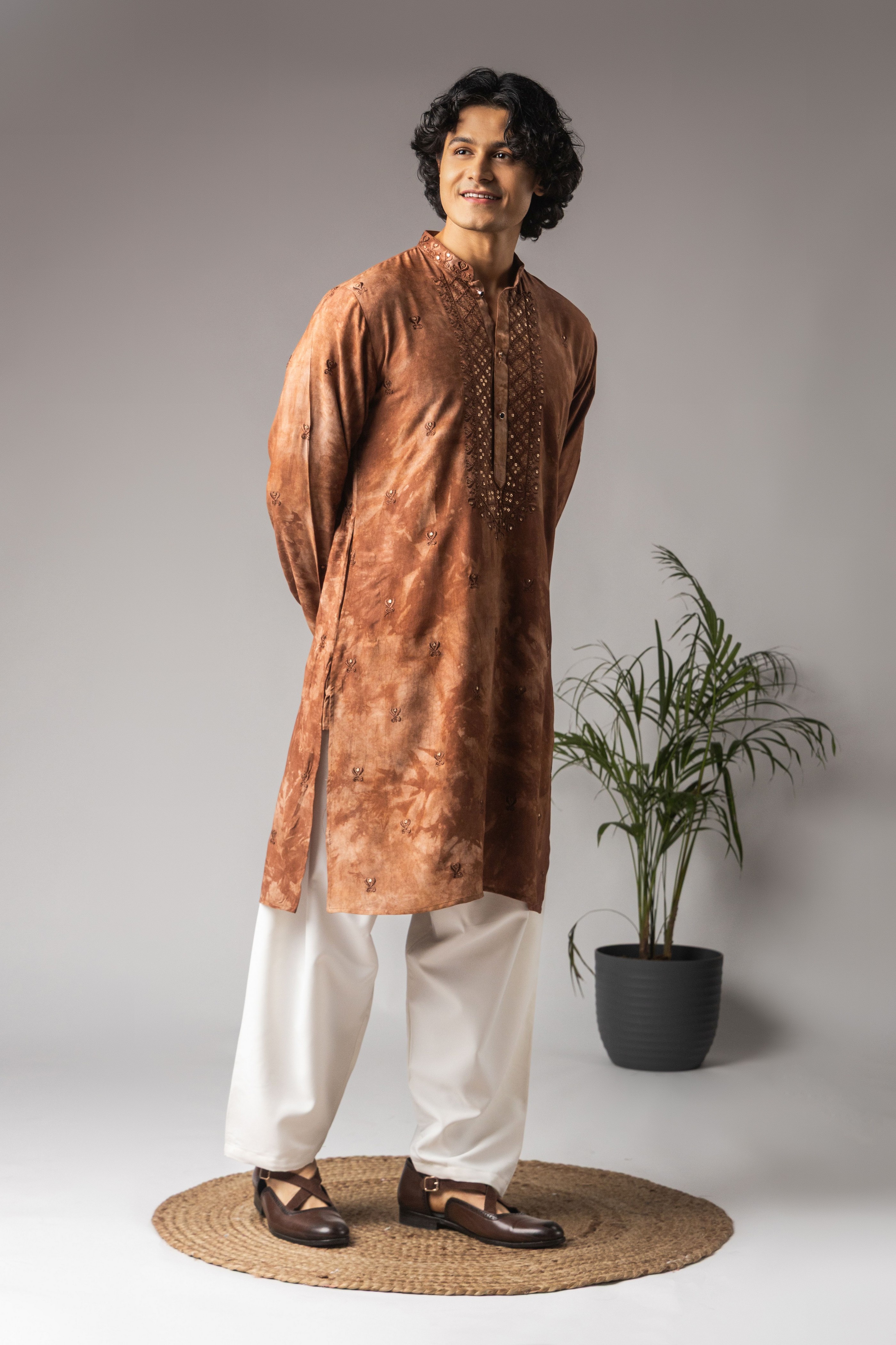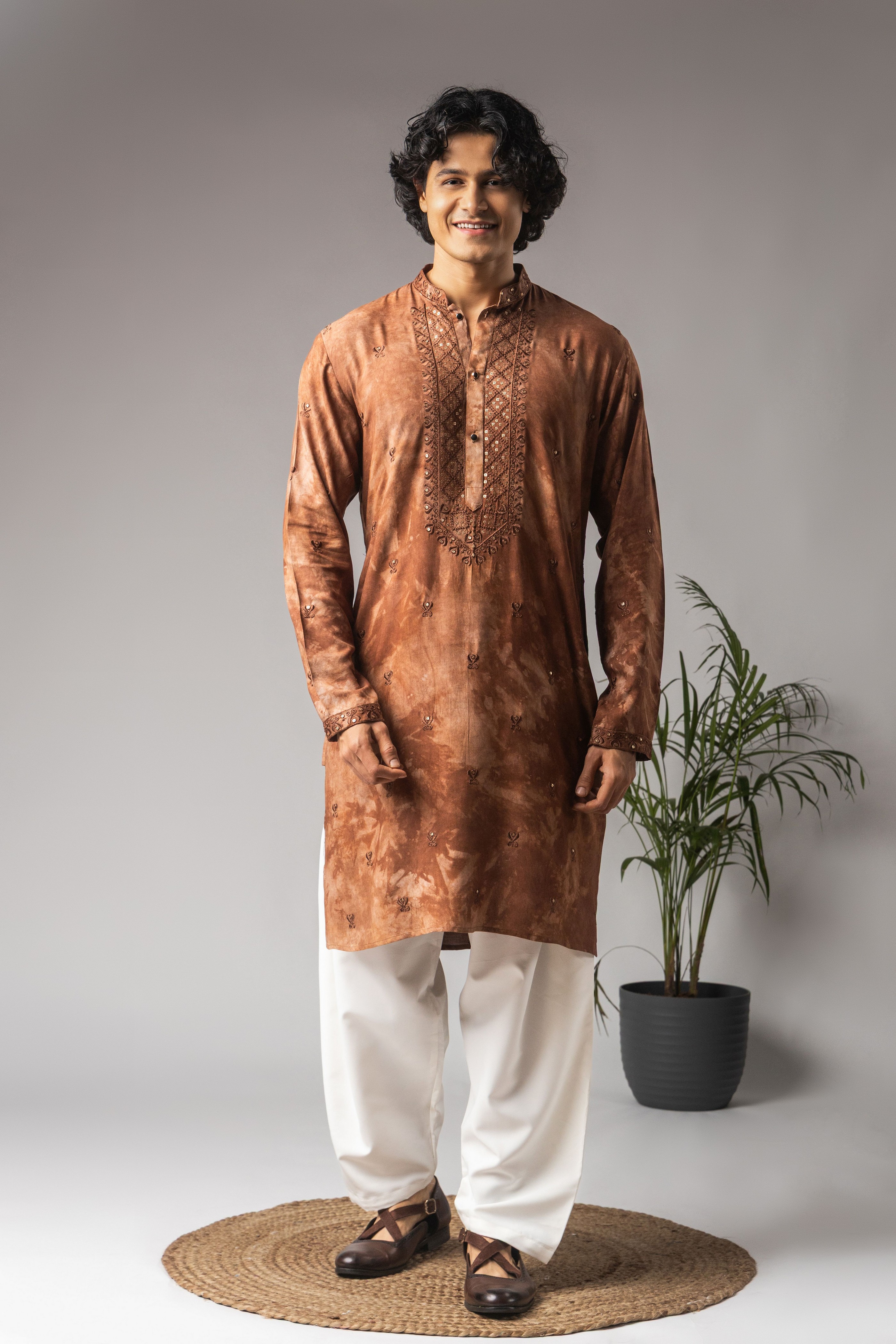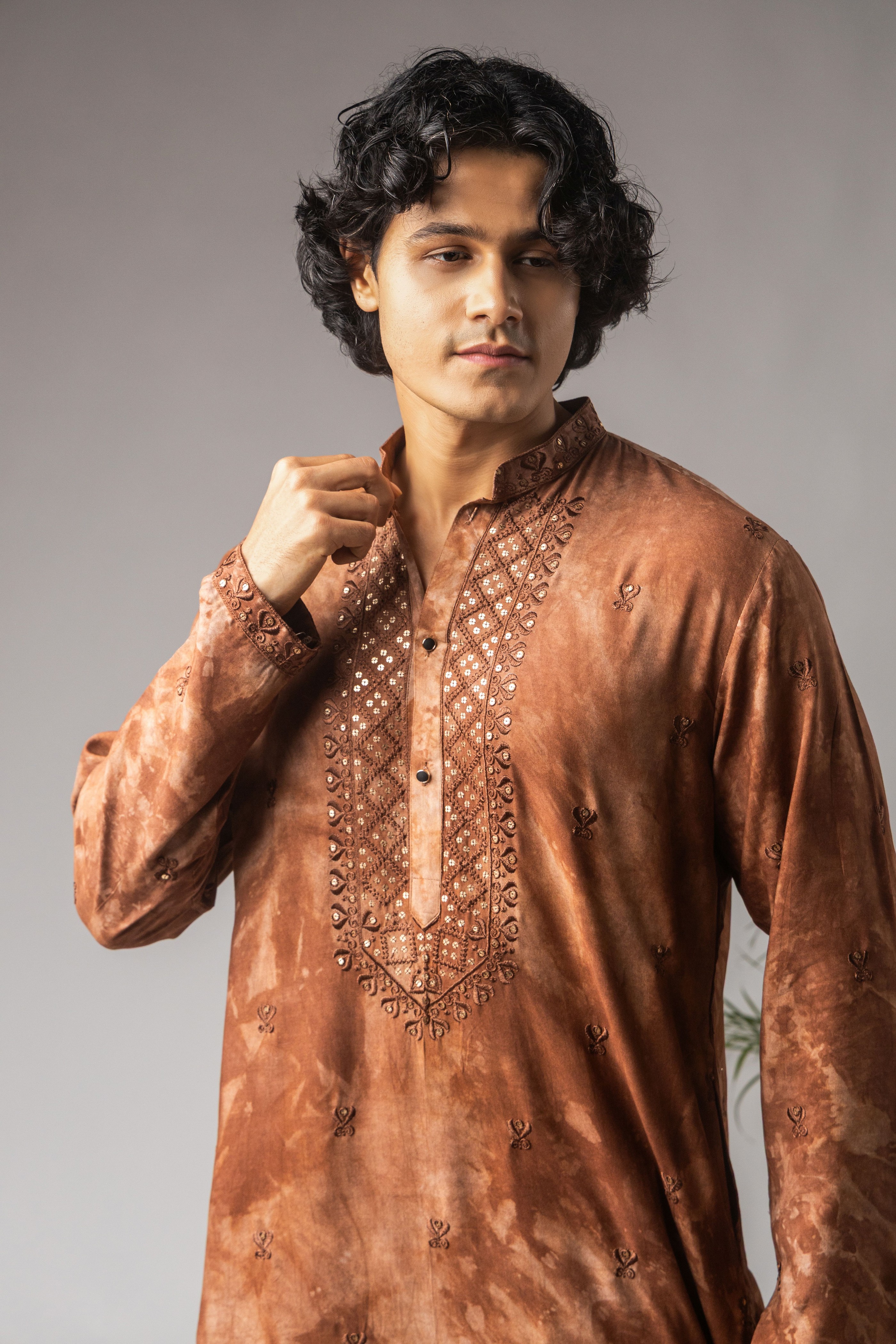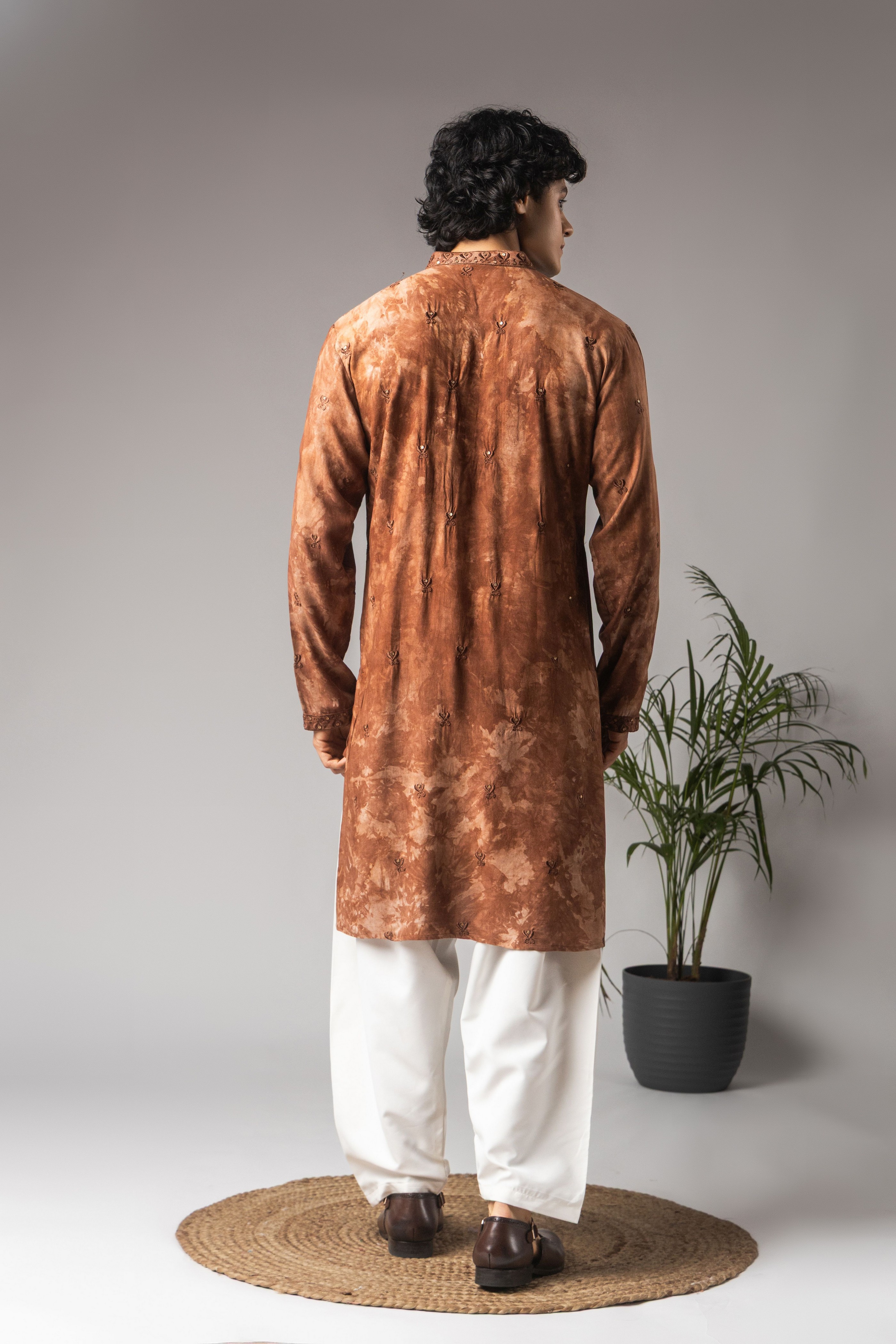 Reddish Brown Color Rayon Fabric Designer Ceremonial Kurta Payjama For Men's