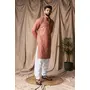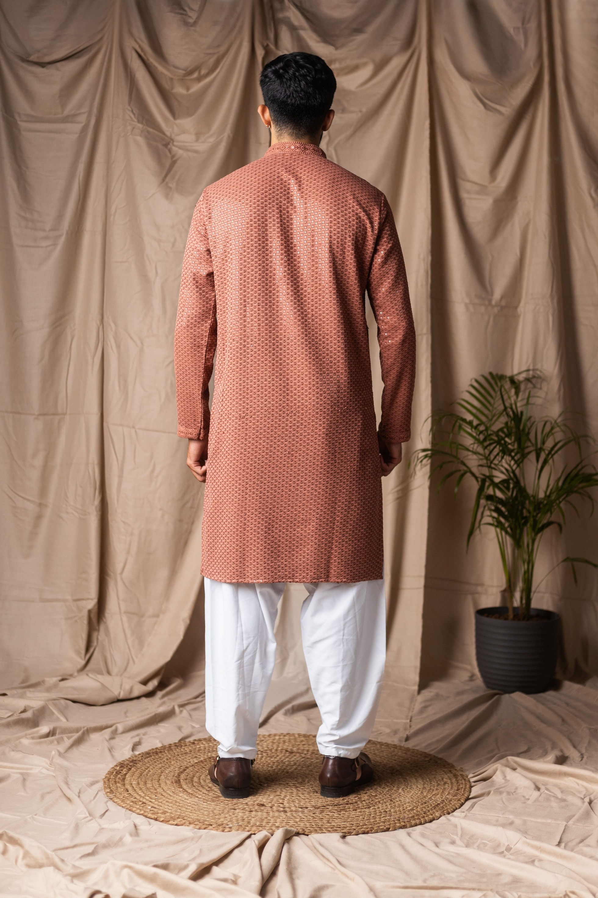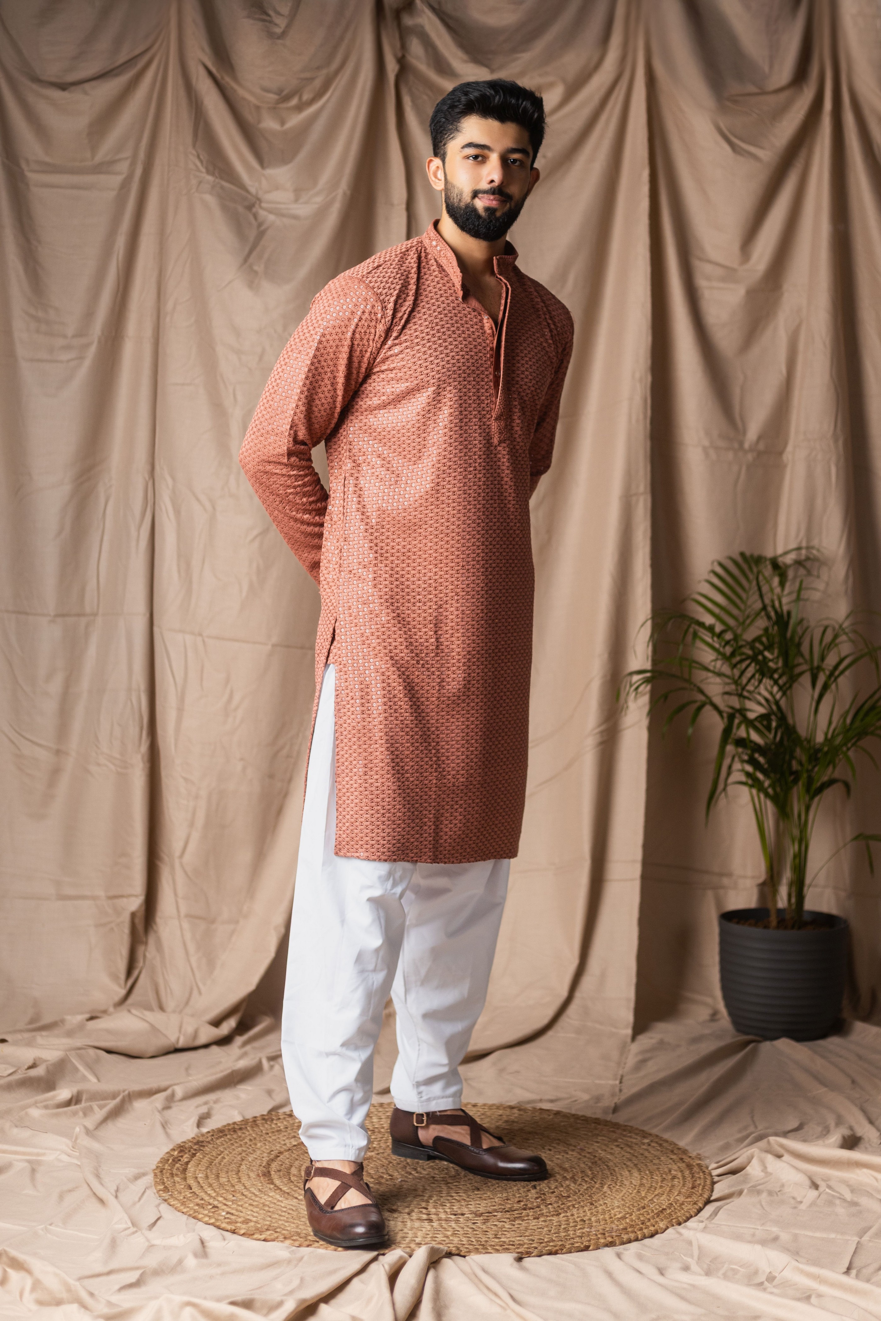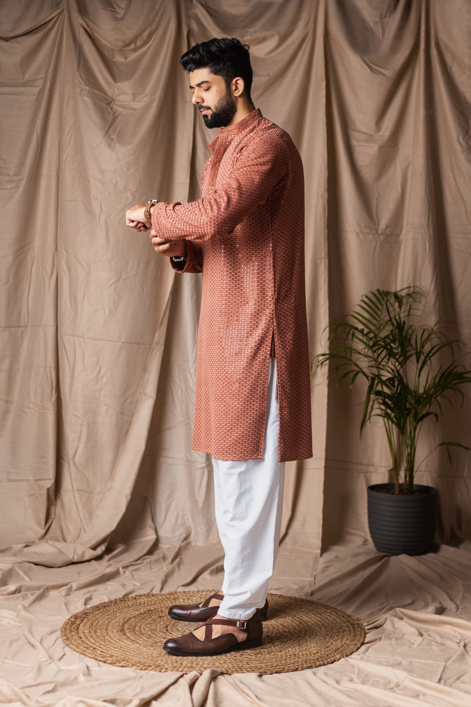 Reddish Orange Color Beautiful Thread Embroidery Work Rayon Fabric Ceremonial Men's Kurta Payjama