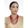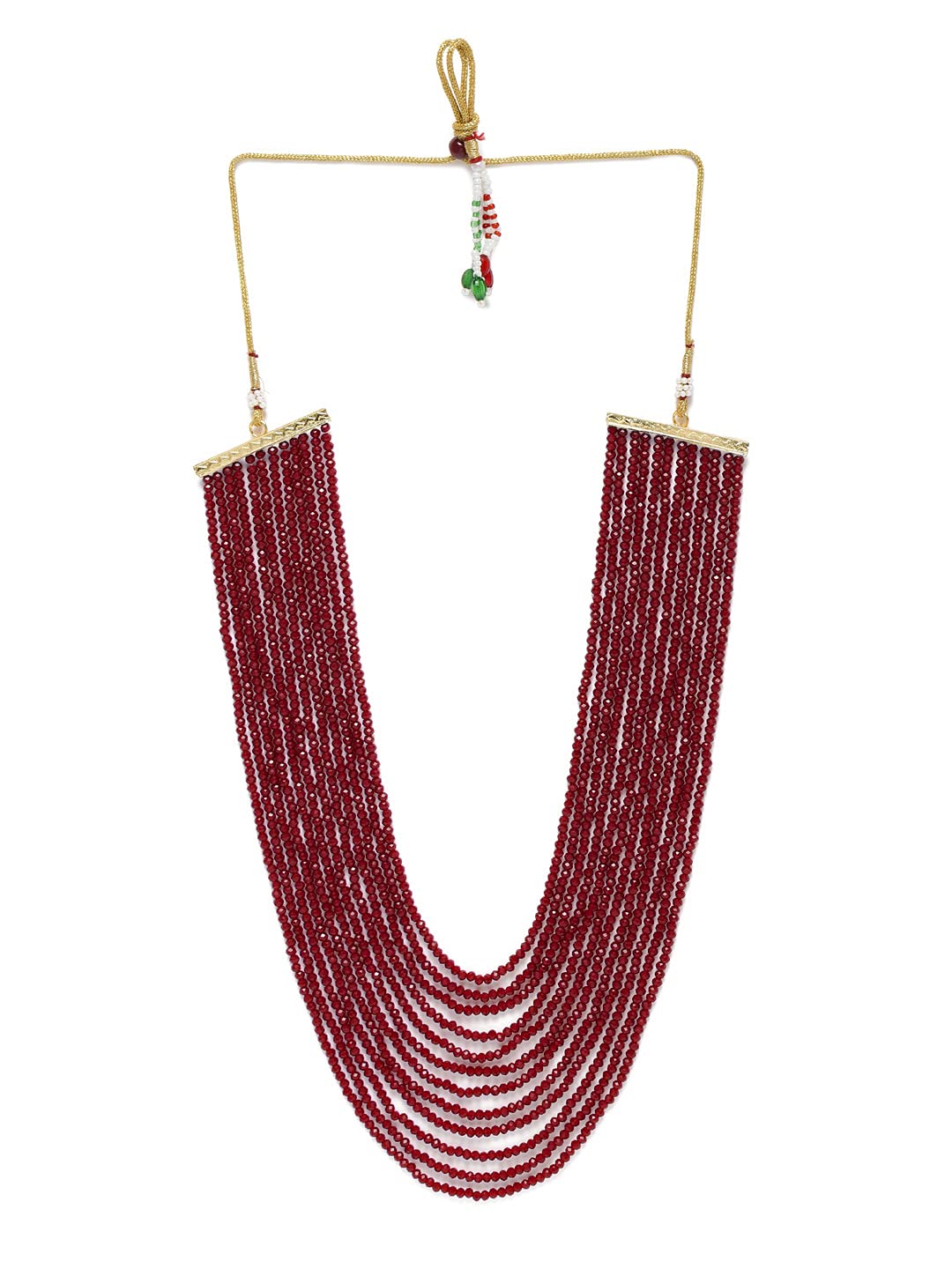 This jewellery set is crafted in 18K gold plated traditional light weight beaded mala. The necklace feature ruby onyx stone beads work in it and is secured with a drawstring closures. Style this necklace set with a saree or a salwar suit to enhance the look.