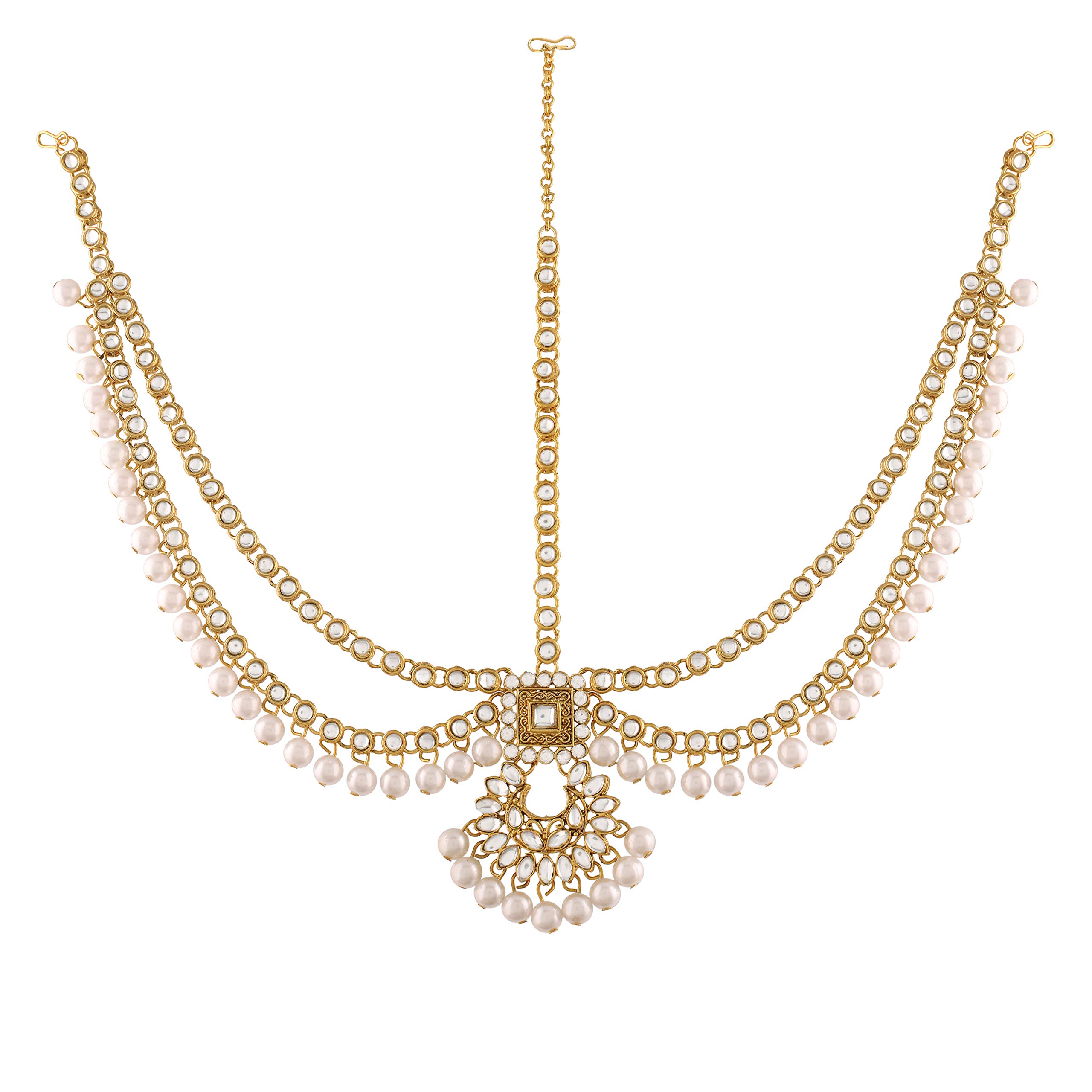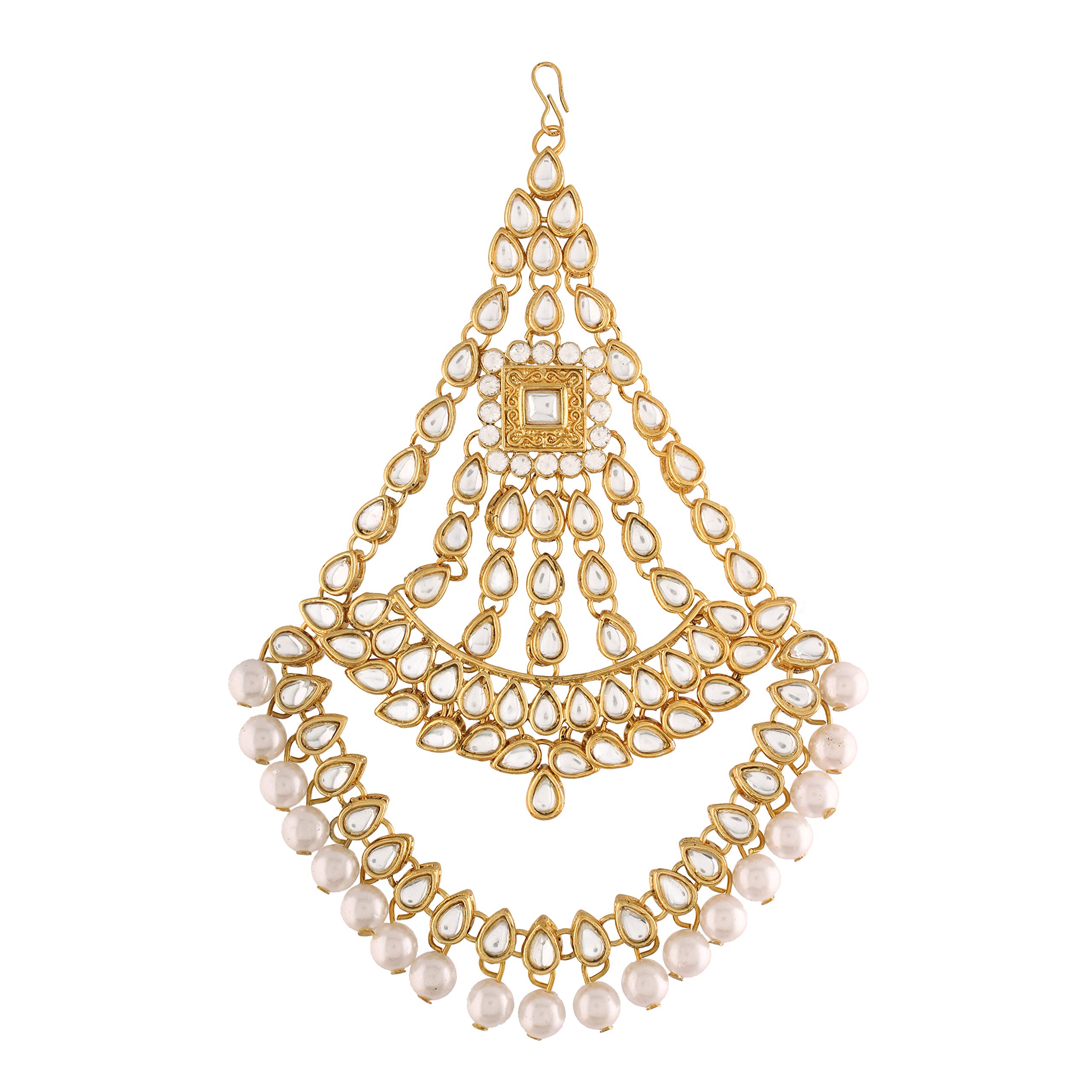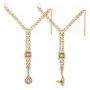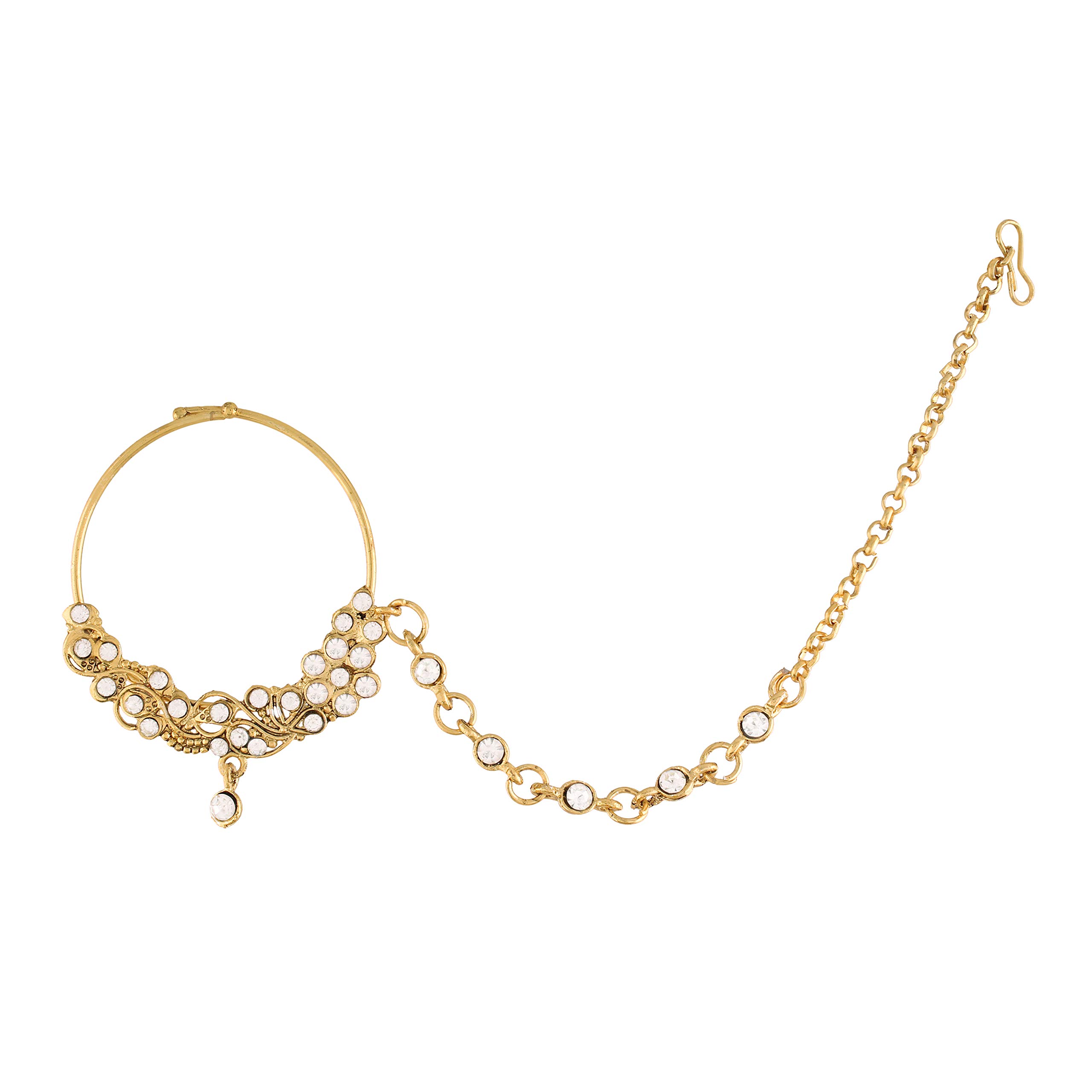 This jewellery set is crafted in gold plating and consists of a necklace choker and a pair of earrings nath passa mathapatti and a pair of panja. The choker necklace feature kundan-studded in it and is secured with a drawstring closurs. Style this necklace set with a saree or a salwar suit to enhance the look. This jewelry set is a great option and a perfect pick for your wedding functions. Be assured to find a variety of contemporary and traditional designs in the mesmerising collection that we offer.