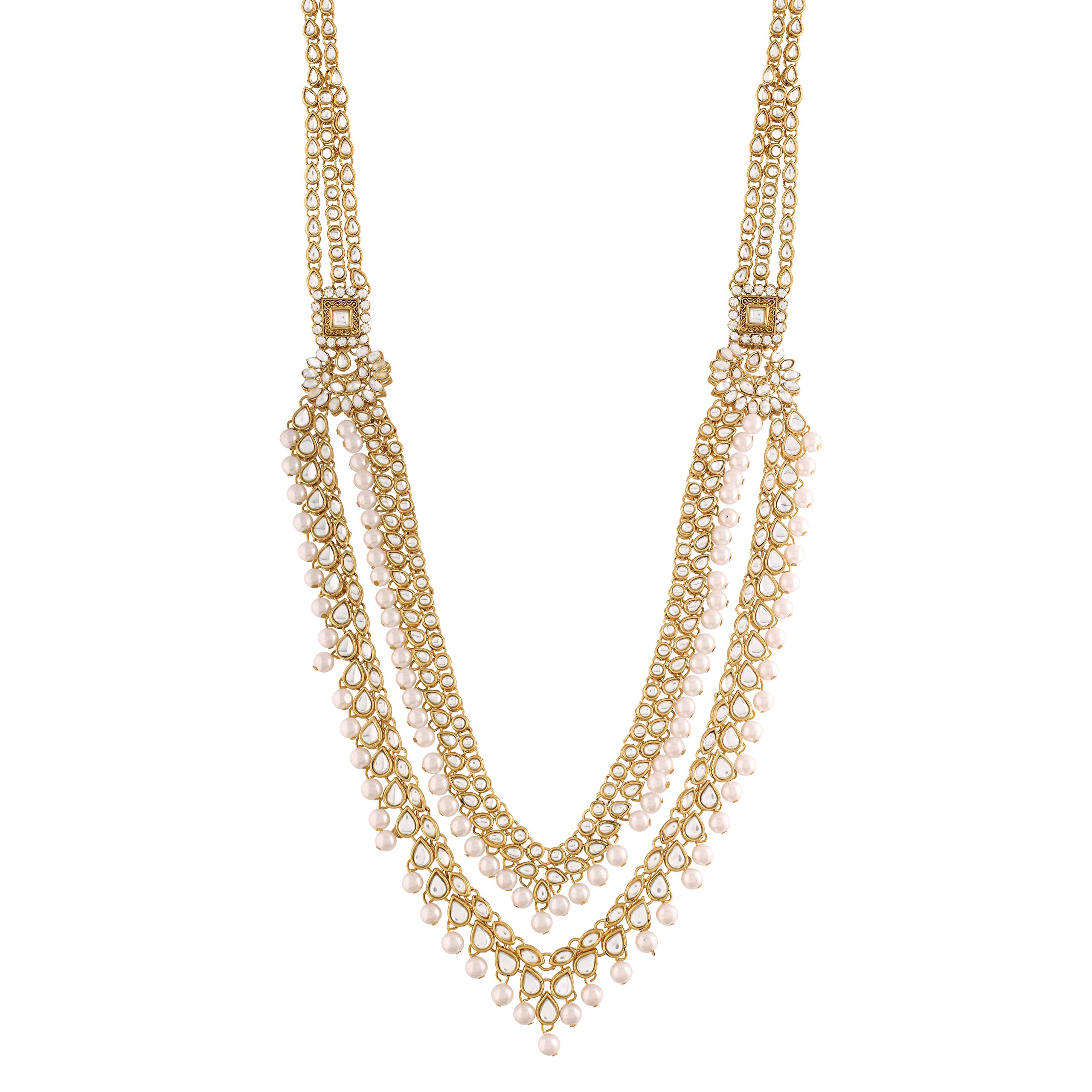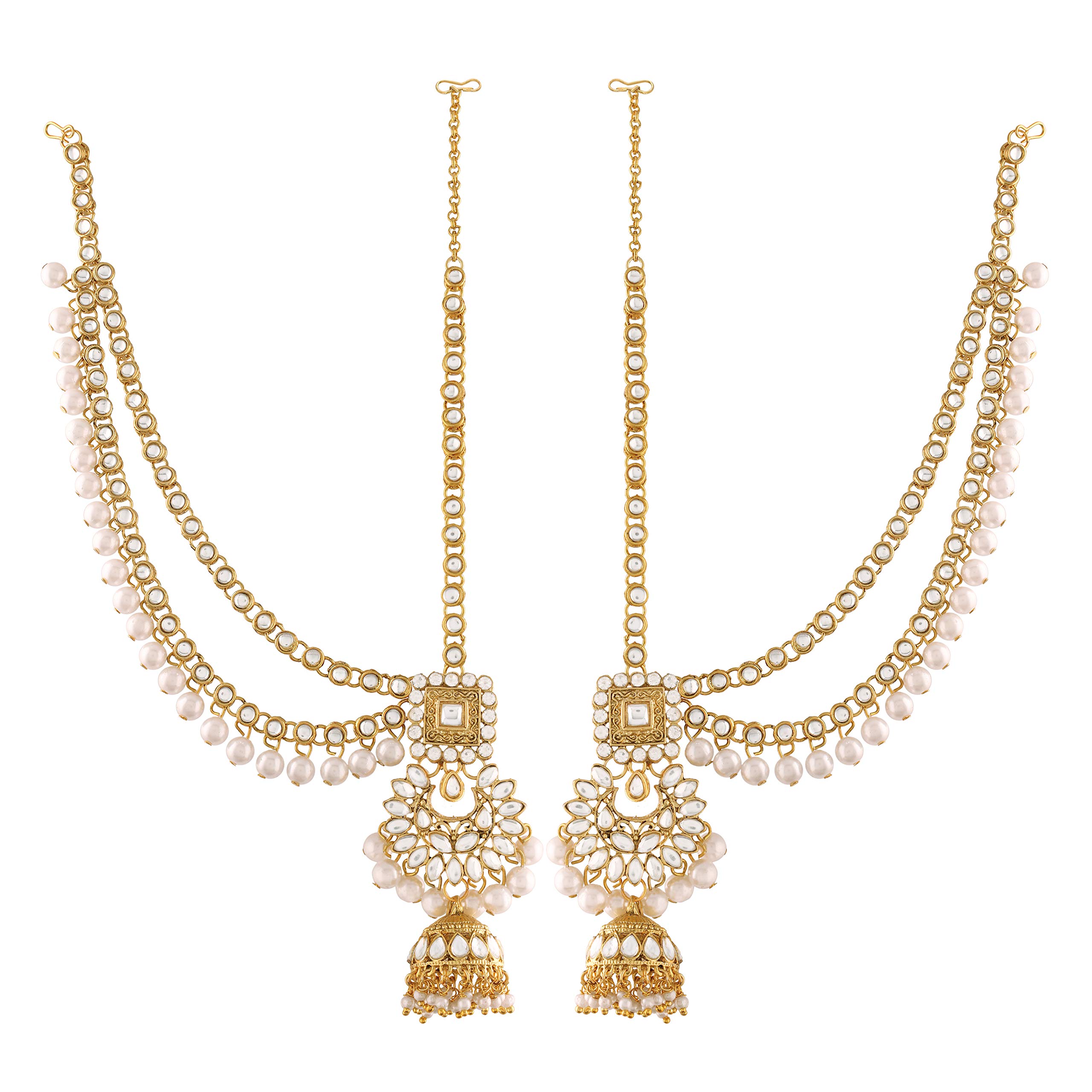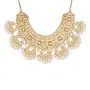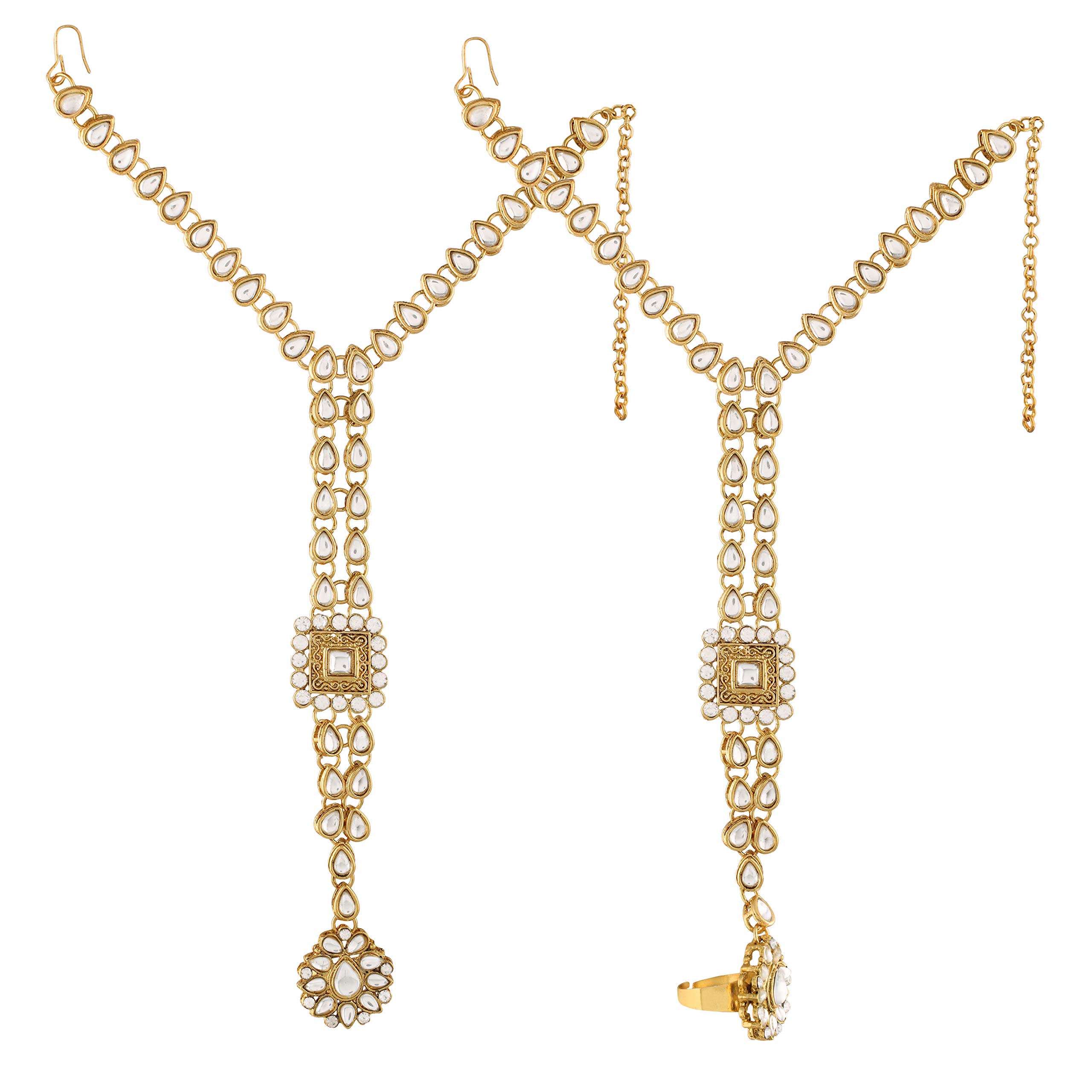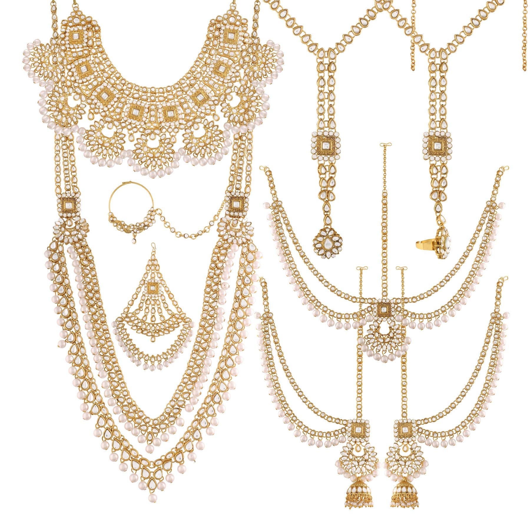 This jewellery set is crafted in gold plating and consists of a necklace choker and a pair of earrings nath passa mathapatti and a pair of panja. The choker necklace feature kundan-studded in it and is secured with a drawstring closurs. Style this necklace set with a saree or a salwar suit to enhance the look. This jewelry set is a great option and a perfect pick for your wedding functions. Be assured to find a variety of contemporary and traditional designs in the mesmerising collection that we offer.