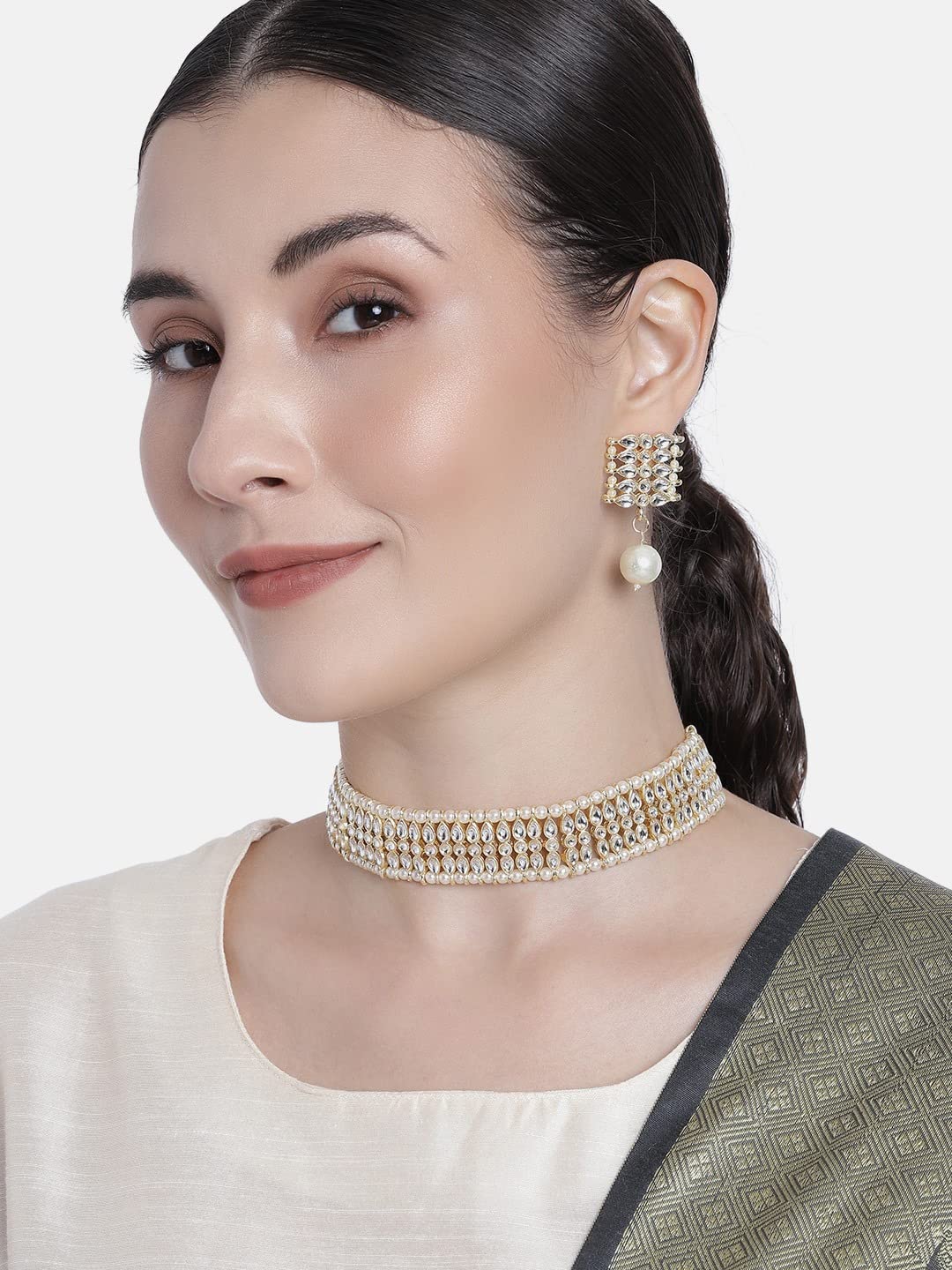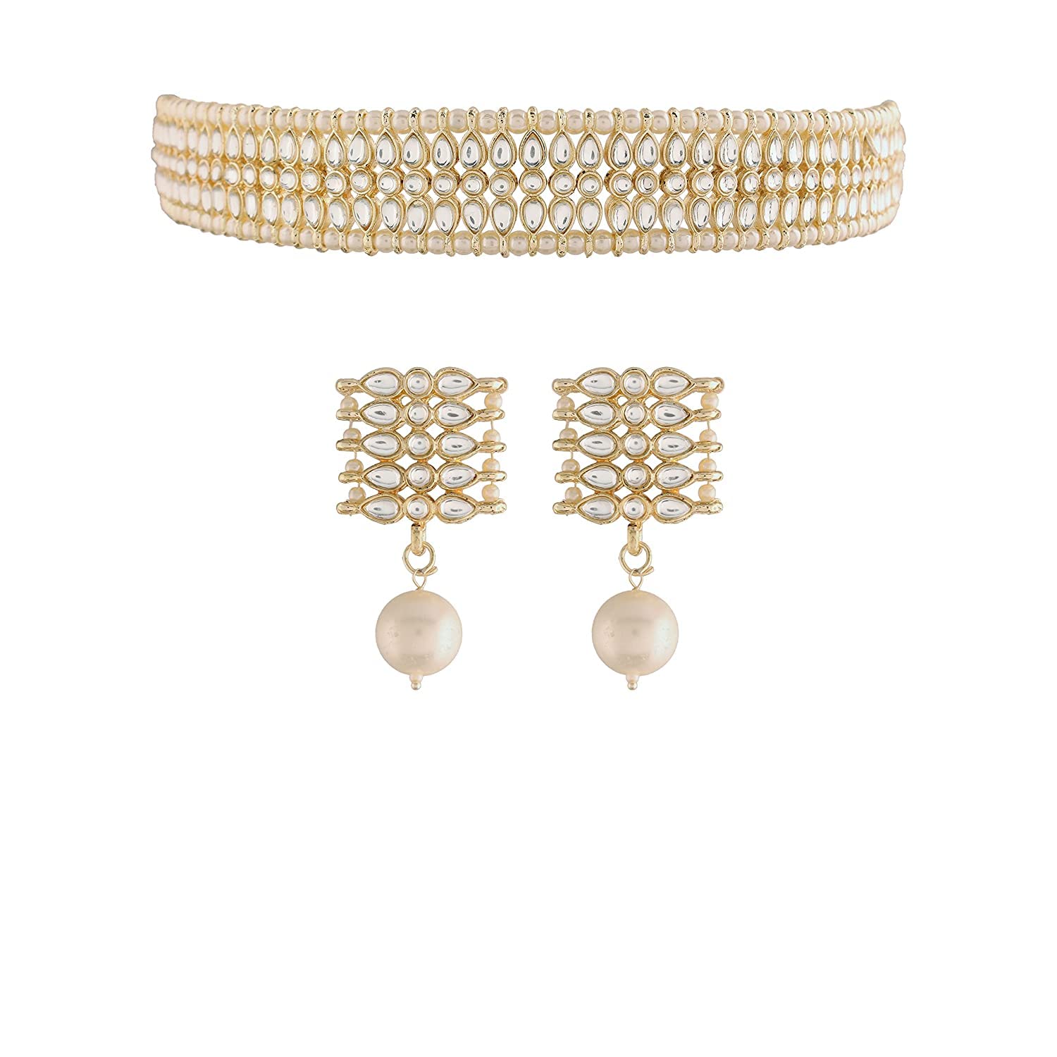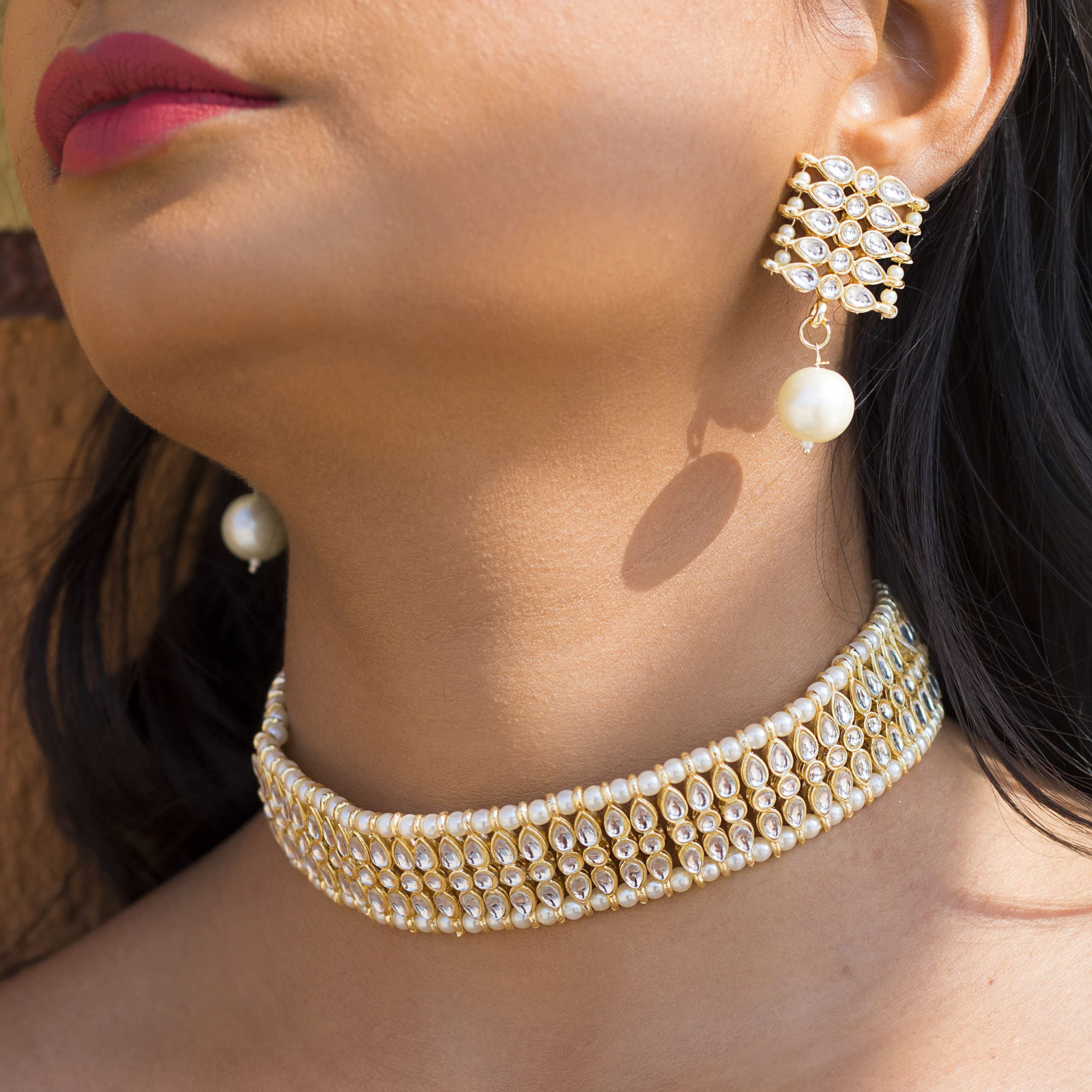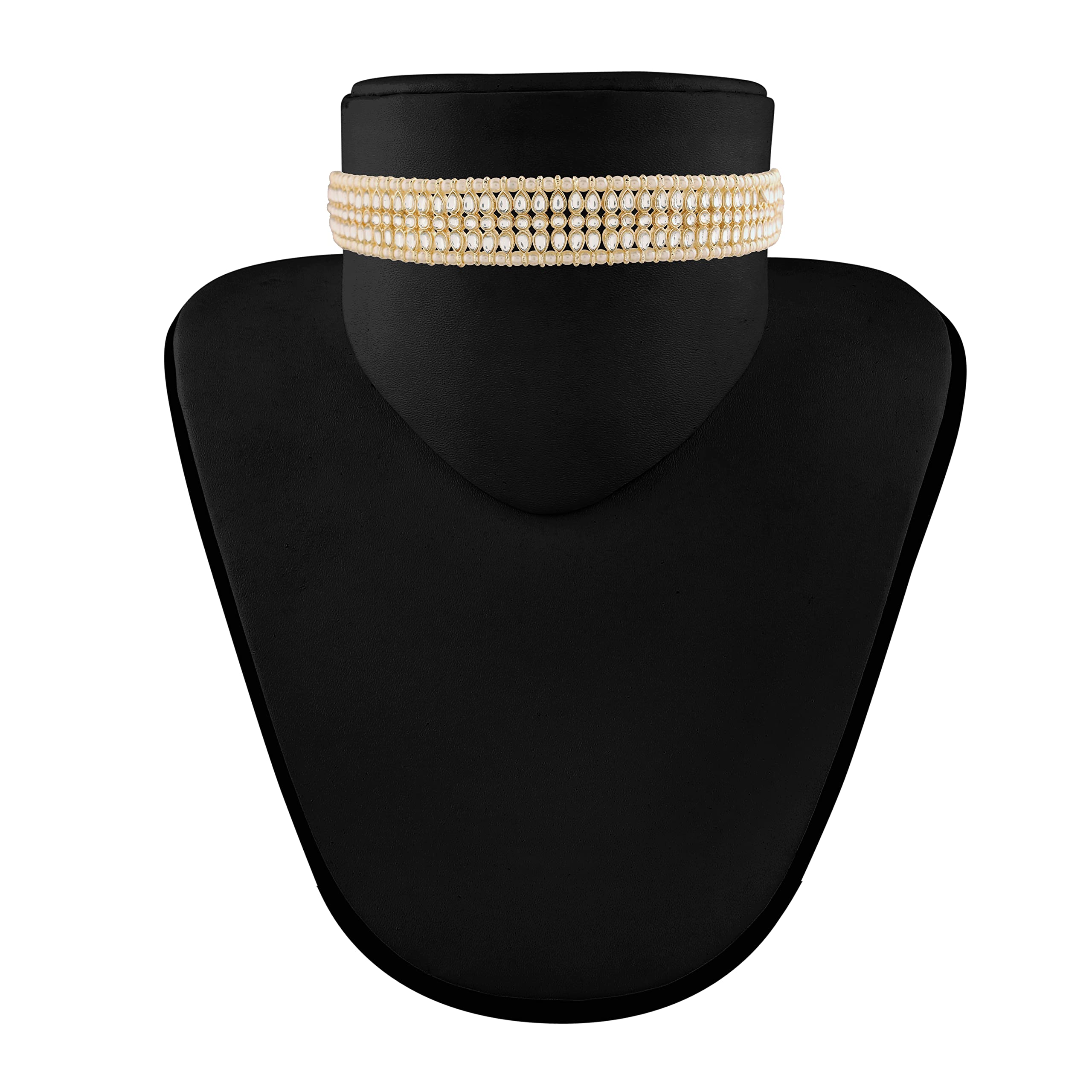 This jewellery set is crafted in 18K gold plated traditional light weight Pearl choker set glided with Kundan work. The necklace feature Pearl & Kundan work in it and is secured with a drawstring closures. Style this necklace set with a saree or a salwar suit to enhance the look.