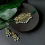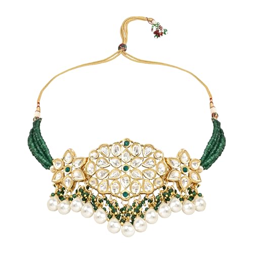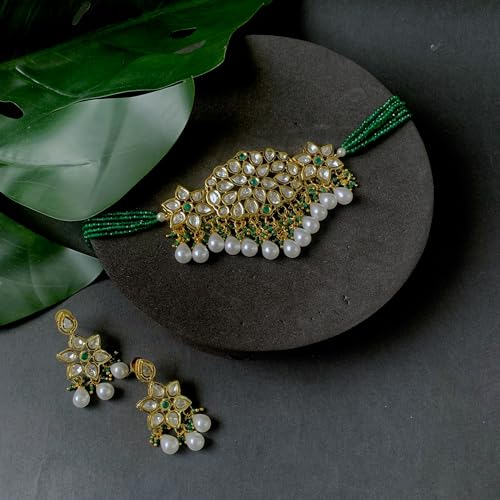 The gold-plated choker necklace set consists of a necklace a pair of earrings and a maang tikka. The necklace features kundan studded with pearl beaded in it giving it an elegant and traditional look. The stones and pearls are set in a beautiful pattern adding a touch of sophistication and grace to the necklace. The necklace is secured with drawstring closures which make it easy to adjust the size to fit comfortably around the neck. This is an important feature as it ensures that the necklace will be comfortable to wear for extended periods of time. The necklace is secured with drawstring closures which make it easy to adjust the size to fit comfortably around the neck. This is an important feature as it ensures that the necklace will be comfortable to wear for extended periods of time. The earrings and maang tikka are also adorned with stones and pearls which match the pattern of the necklace. The earrings have a beautiful design which makes them easy and comfortable to wear. The maang tikka is a traditional Indian hair accessory that can be worn with the necklace and earrings to complete the look.