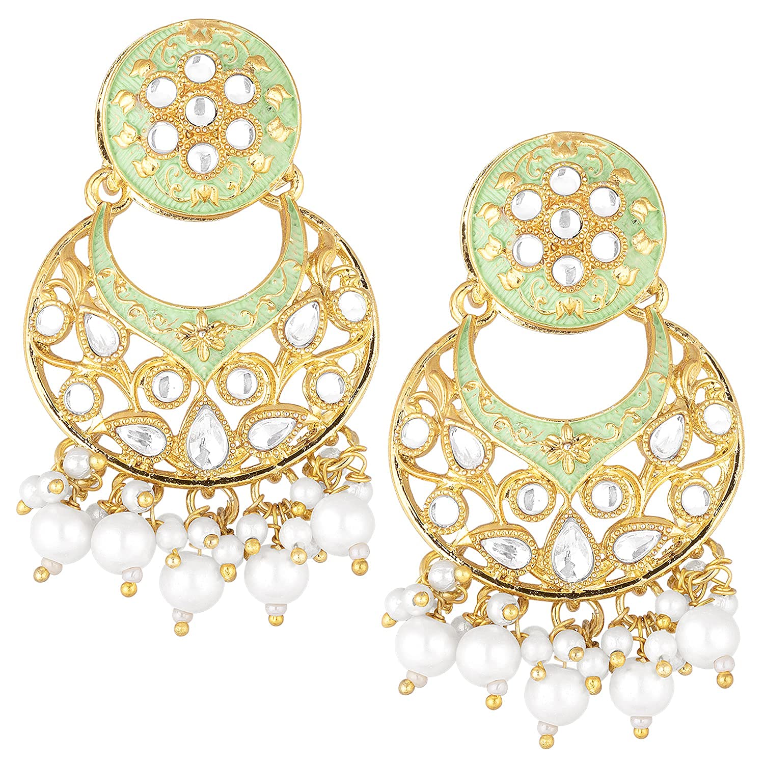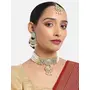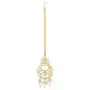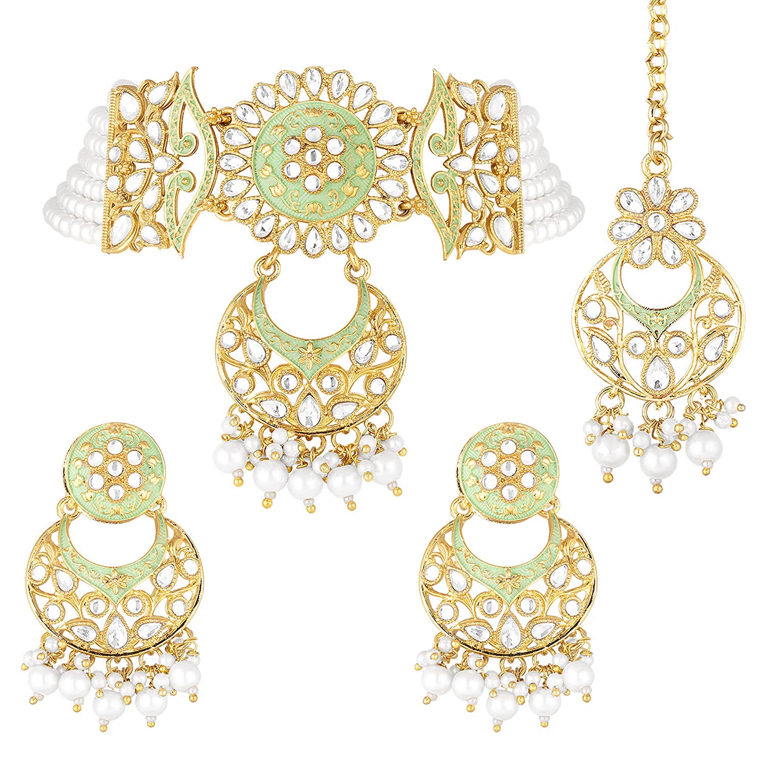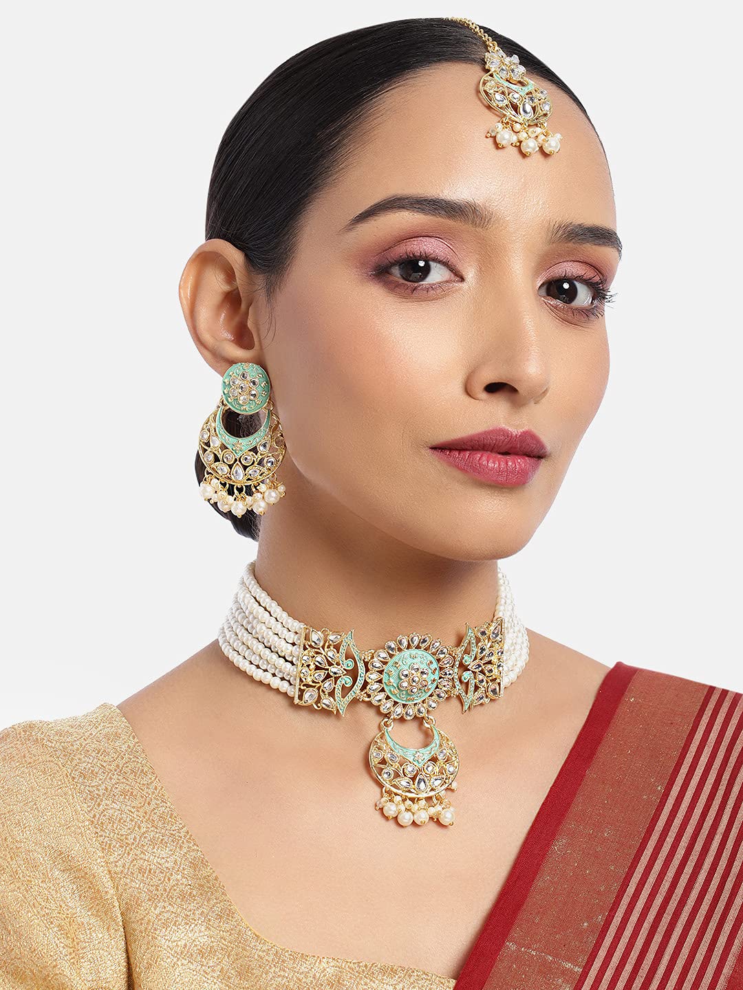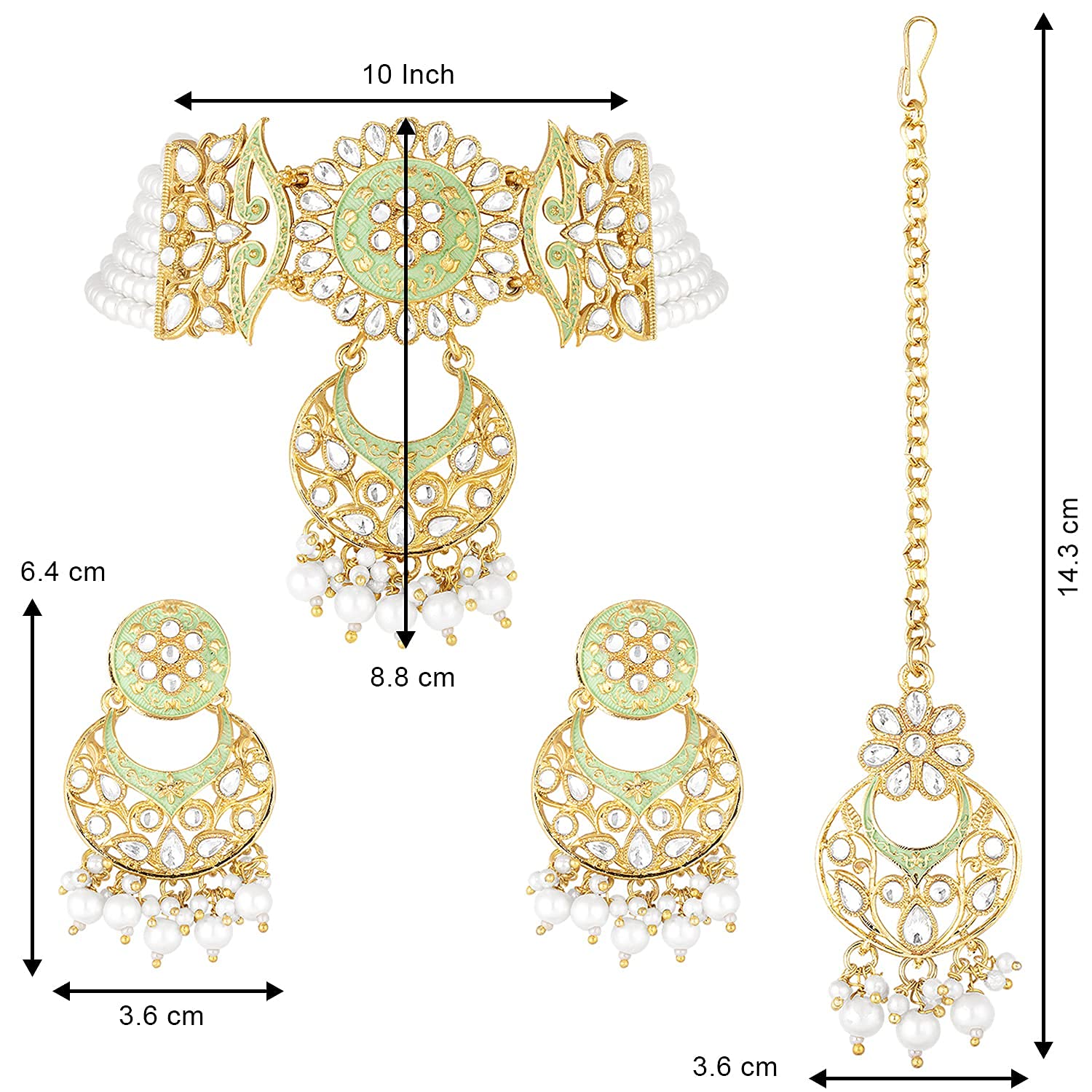DIMENSIONS: Necklace Length - 10 Inch X Width - 8.8 Cm Earring Height - 6.4 Cm X Width - 3.6 Cm Maang Tikka Length - 14.3 Cm X Width - 3.6 Cm Weight - 98 Grams. This jewellery set is crafted in gold plating and consists of a choker pair of earrings and maang tikka. The Meenakari choker necklace feature kundan-studded in it and is secured with a drawstring closures. Style this necklace set with a saree or a salwar suit to enhance the look.