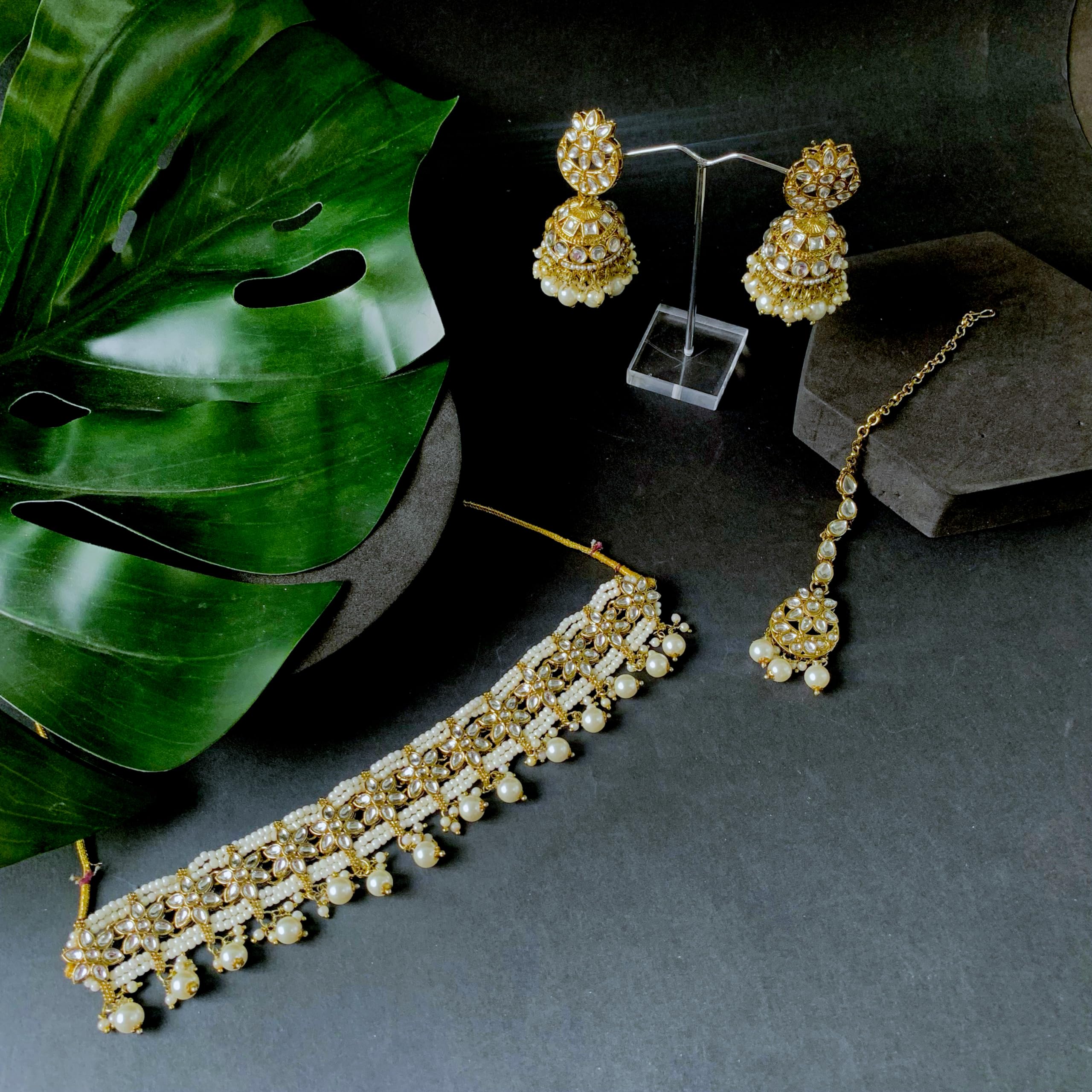 The gold-plated choker necklace set consists of a necklace a pair of earrings and a maang tikka. The necklace features kundan studded with pearl beaded in it giving it an elegant and traditional look. The stones and pearls are set in a beautiful pattern adding a touch of sophistication and grace to the necklace. The necklace is secured with drawstring closures which make it easy to adjust the size to fit comfortably around the neck. This is an important feature as it ensures that the necklace will be comfortable to wear for extended periods of time. The necklace is secured with drawstring closures which make it easy to adjust the size to fit comfortably around the neck. This is an important feature as it ensures that the necklace will be comfortable to wear for extended periods of time. The earrings and maang tikka are also adorned with stones and pearls which match the pattern of the necklace. The earrings have a beautiful design which makes them easy and comfortable to wear. The maang tikka is a traditional Indian hair accessory that can be worn with the necklace and earrings to complete the look.