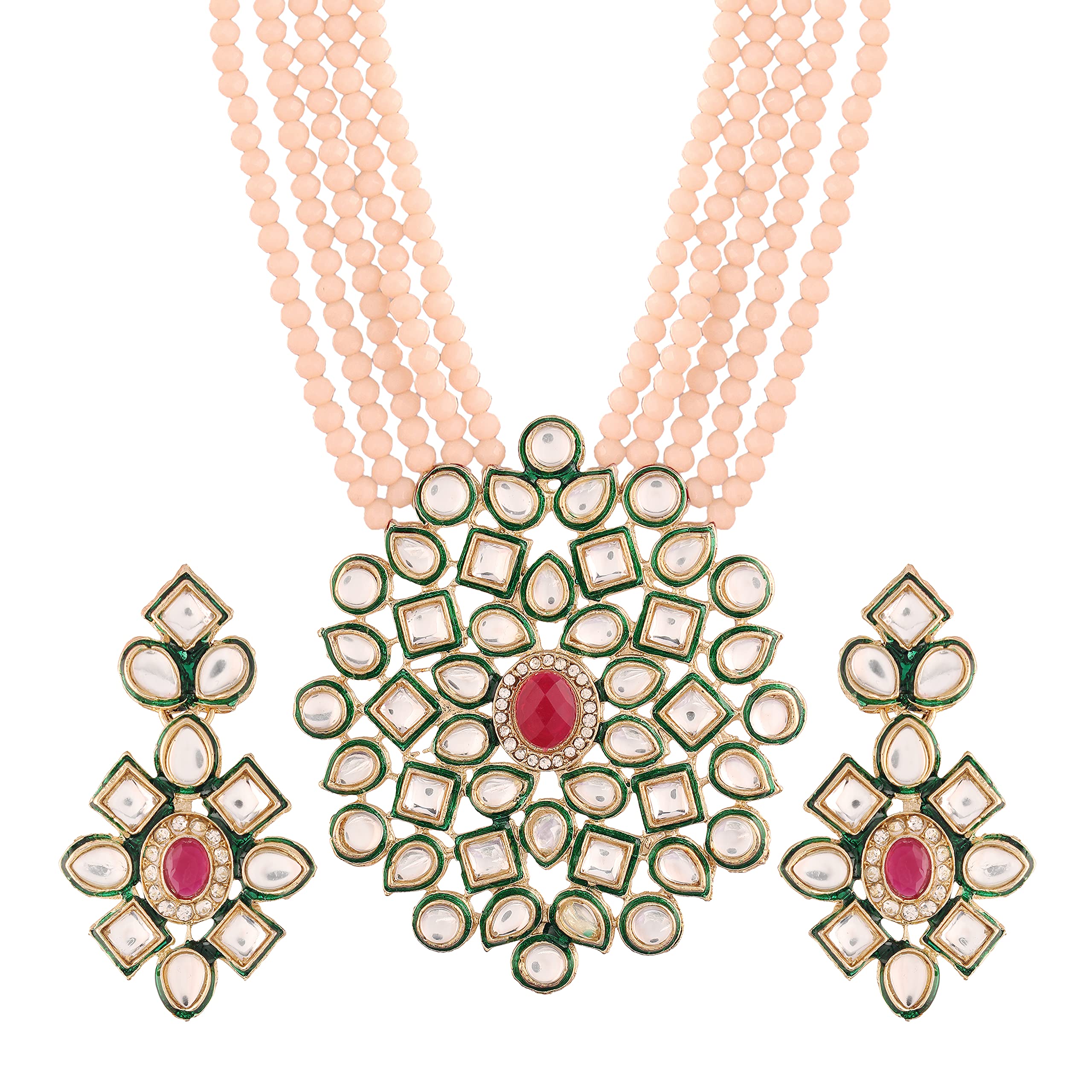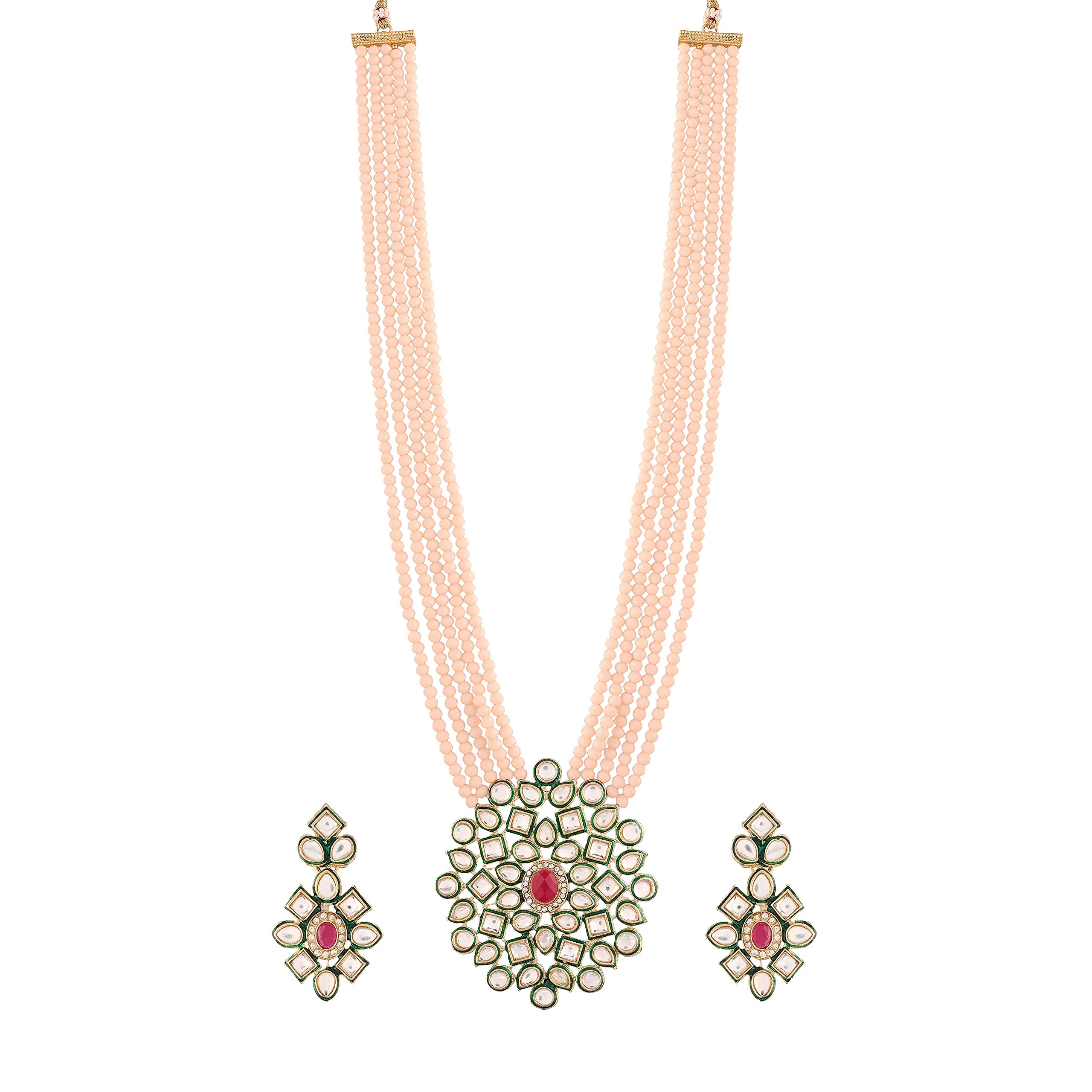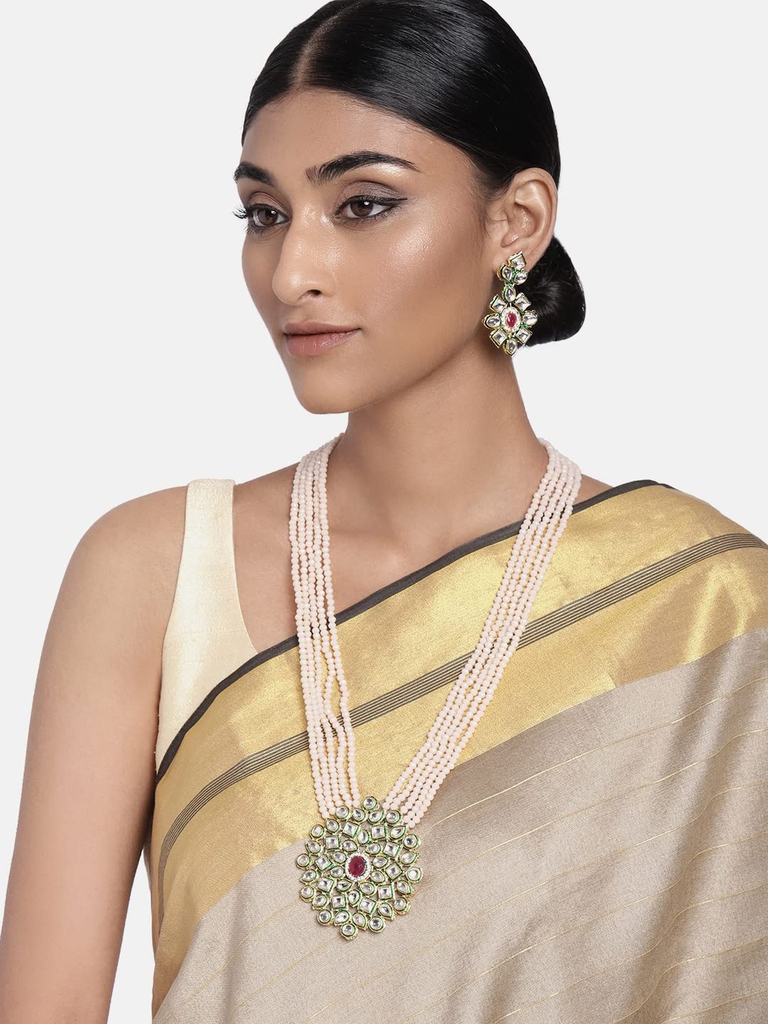 This jewellery set is crafted in gold plated traditional light weight beaded mala handcrafted with uncut kundan. The necklace feature emerald green onyx stone beads work in it and is secured with a drawstring closures. Style this necklace set with a saree or a salwar suit to enhance the look.