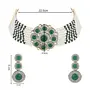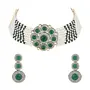 The silver-plated choker necklace set consists of a necklace a pair of earrings. The necklace features kundan studded with pearl beaded in it giving it an elegant and traditional look. The stones and pearls are set in a beautiful pattern adding a touch of sophistication and grace to the necklace. The necklace is secured with drawstring closures which make it easy to adjust the size to fit comfortably around the neck. This is an important feature as it ensures that the necklace will be comfortable to wear for extended periods of time. The necklace is secured with drawstring closures which make it easy to adjust the size to fit comfortably around the neck. This is an important feature as it ensures that the necklace will be comfortable to wear for extended periods of time. The earrings and maang tikka are also adorned with stones and pearls which match the pattern of the necklace. The earrings have a beautiful design which makes them easy and comfortable to wear. The maang tikka is a traditional Indian hair accessory that can be worn with the necklace and earrings to complete the look.