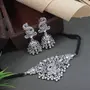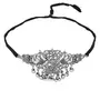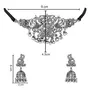 The silver oxidised choker necklace set consists of a necklace and a pair of earrings This stunning necklace set embodies the beauty of the ages with its oxidized metal finish that gives it a sense of timeless elegance. The intricately designed pendant tell a story of craftsmanship and artistry while the long chain drapes gracefully adding a touch of sophistication to any outfit The dark antiqued finish of the metal adds a touch of mystique echoing the aura of the festival's traditional rituals.. Paired with matching earrings this set is a masterpiece that transcends trends making you the center of attention wherever you go.The long chain adds a contemporary twist to the set while the earrings capture the same adventurous essence. Wear this set as a testament to your adventurous soul and your ability to find beauty in every corner of the world.