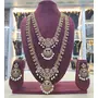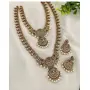 Elevate your bridal ensemble with this exquisite double-layered temple design necklace set that captures timeless South Indian artistry. This handcrafted gold-plated jewelry set features intricate floral patterns adorned with stunning white pearl droplets and rich ruby-colored stones, creating a perfect balance of elegance and tradition.The set includes a long haaram (necklace) and a shorter choker, both featuring ornate chandbali-inspired pendants with crescent moon motifs. The matching chandbali earrings with pearl clusters complete this regal collection, making it a statement piece for weddings, engagement ceremonies, and festive celebrations.Each piece showcases meticulous craftsmanship with antique finish detailing, kundan-inspired stone setting, and delicate filigree work. The contrast between the polished gold-plated metal and lustrous pearls creates a luxurious aesthetic that pairs beautifully with silk sarees, lehengas, and other ethnic attire.This versatile jewelry set works beautifully for both traditional ceremonies and modern fusion outfits. The adjustable length makes it suitable for various necklines, while the lightweight design ensures comfort throughout long events.Add this heirloom-quality piece to your collection today and experience the perfect blend of cultural heritage and contemporary style!